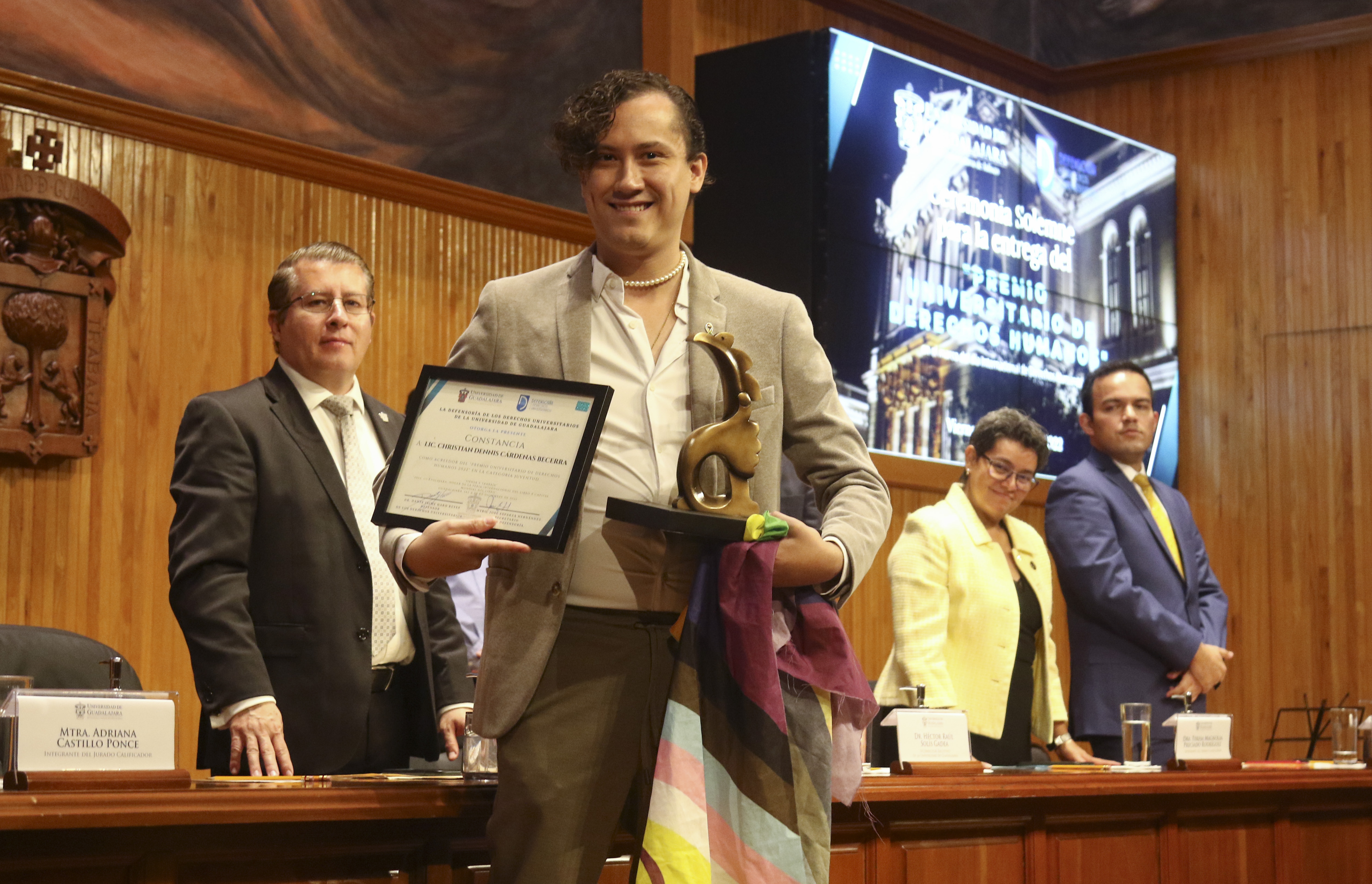 En la categoría Juventud, fue reconocido Christian Dennis Cárdenas Becerra, egresado del Centro Universitario de Ciencias Sociales y Humanidades (CUCSH) y fundador del colectivo Diverso UdeG, a través del cual busca espacios universitarios para promover la participación de la comunidad LGBTIQ+.