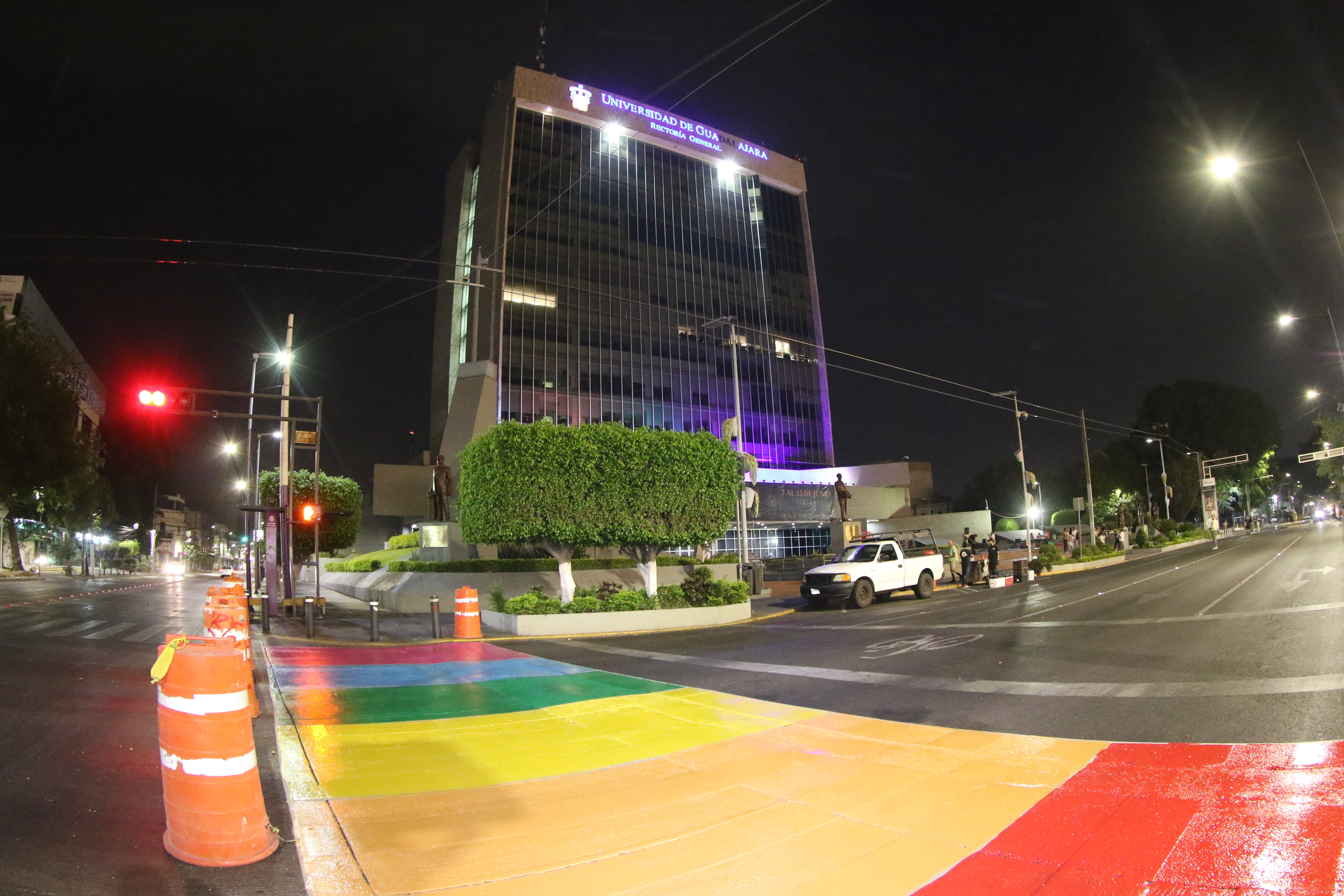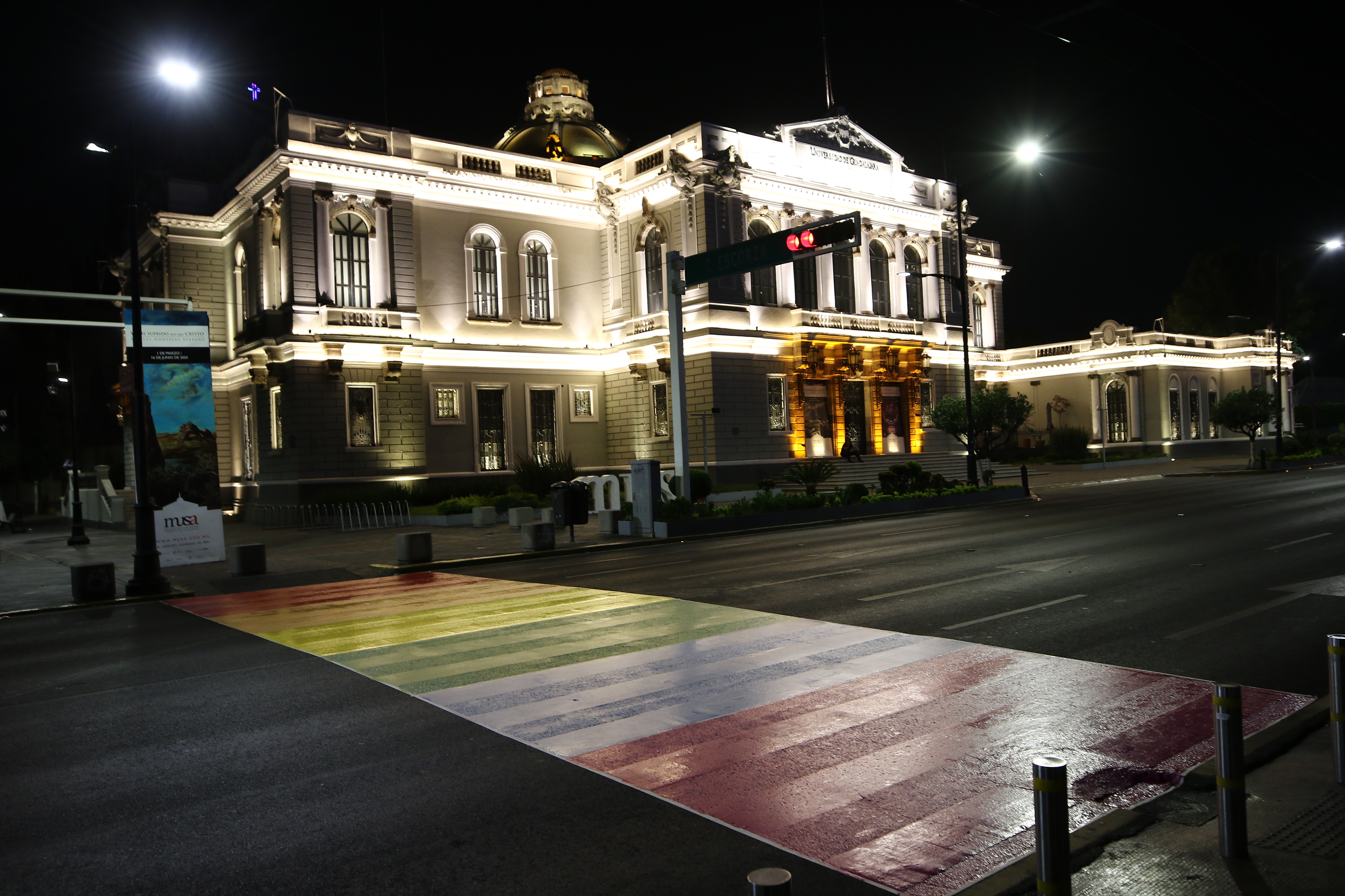 Con motivo del mes del orgullo y del Día Internacional del Orgullo LGBTIQ+, que se conmemora el 28 de junio, este martes los pasos peatonales de la avenida Juárez, en su cruce con Enrique Díaz de León y la calle Constancio Hernández Alvirde, amanecieron decorados con la bandera arcoíris como muestra de apoyo a dicha comunidad.