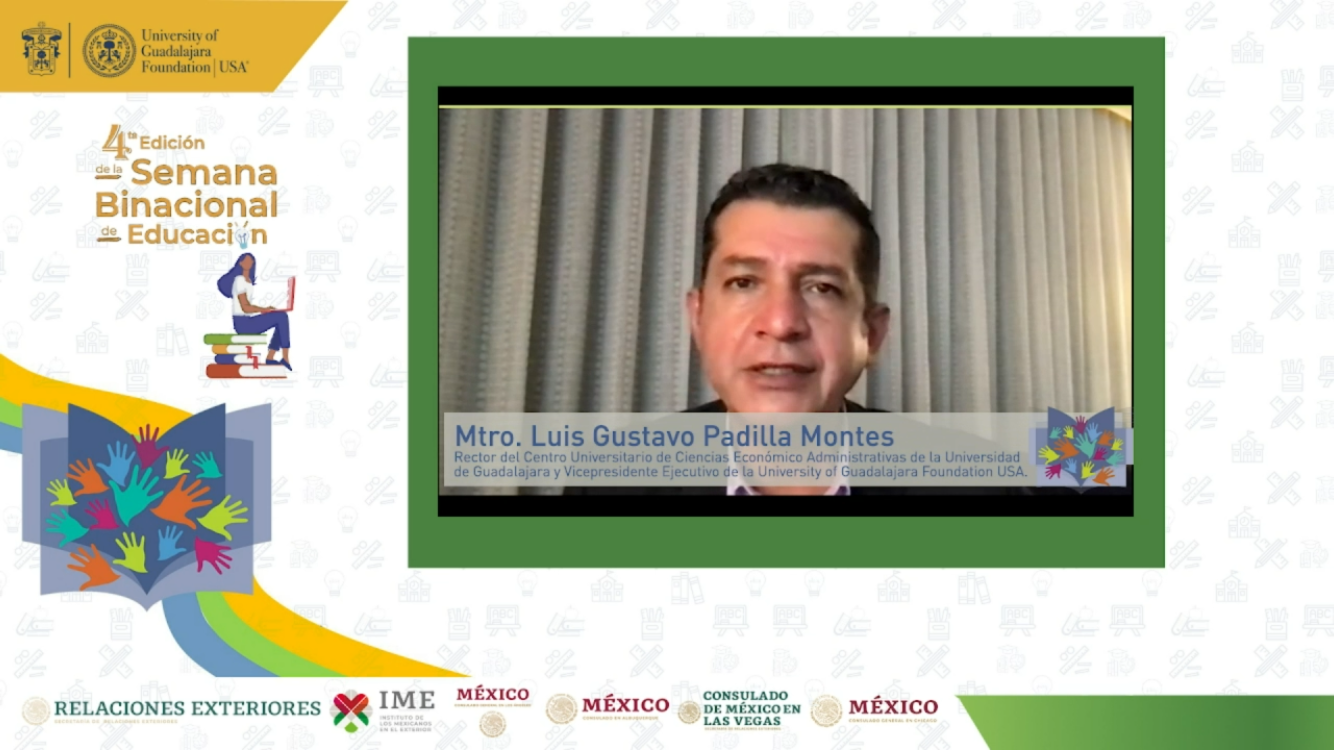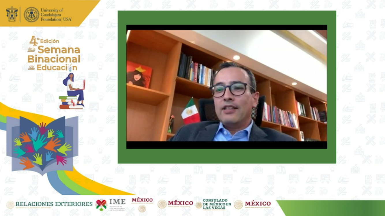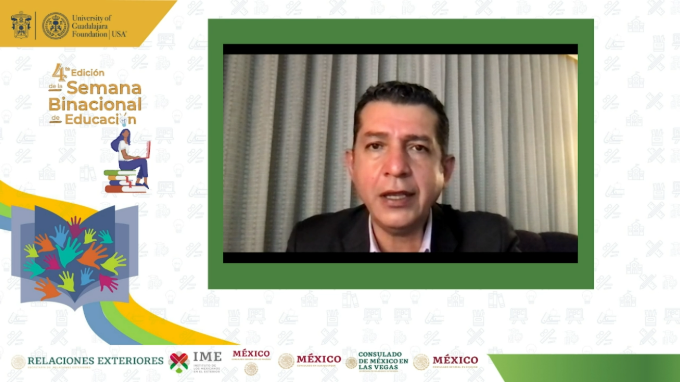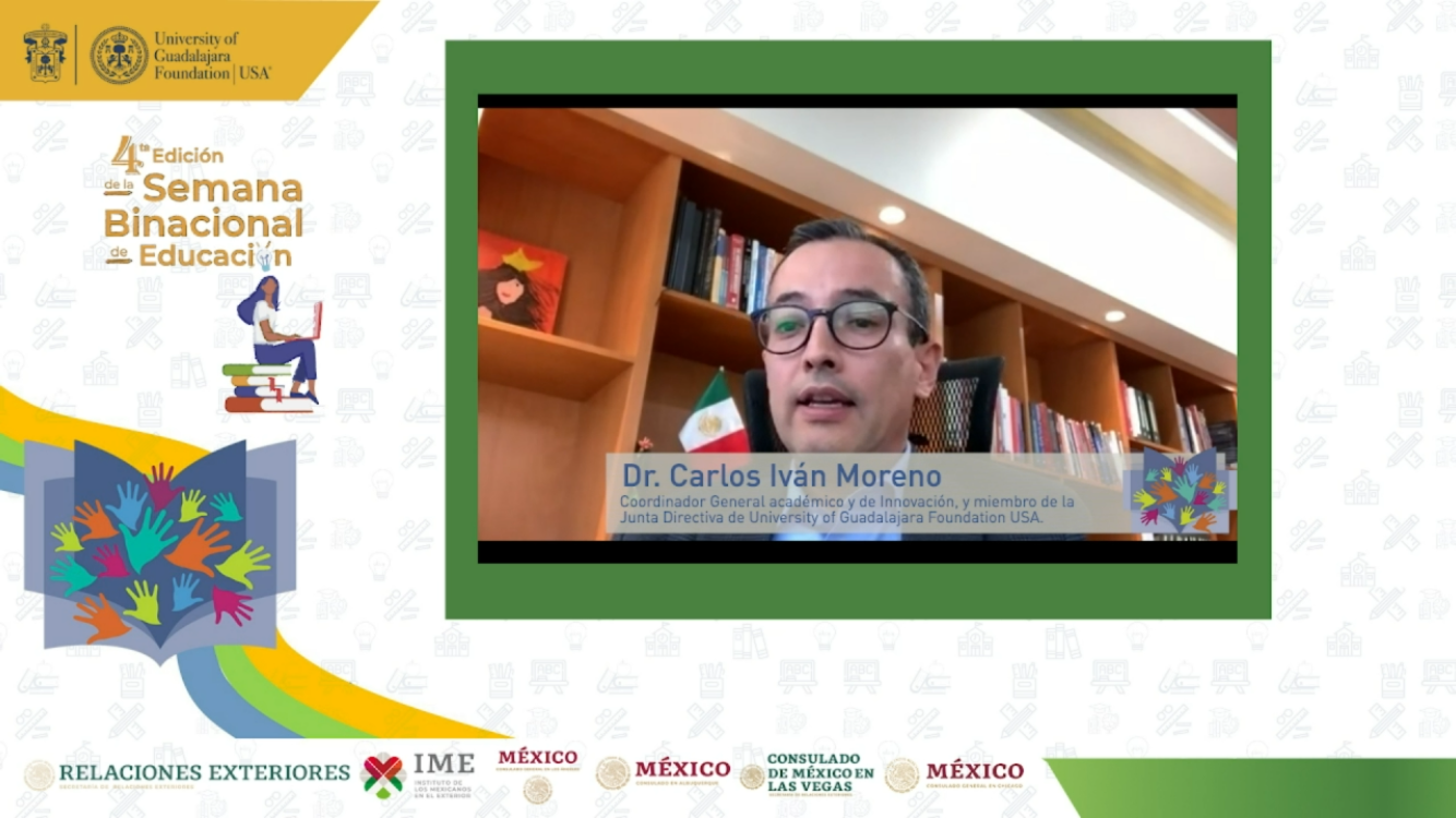 Moreno Arellano participó en el webinar “Retos de la educación superior con perspectiva binacional entre México y Estados Unidos”, que organizó la University of Guadalajara Foundation USA, en el marco de la cuarta edición de la Semana Binacional de Educación “Con educación avanzamos todos y todas”, iniciativa impulsada por el Instituto de los Mexicanos en el Exterior (IME), con la finalidad de brindar información sobre las oportunidades a las comunidades mexicanas que viven en EUA y Canadá.