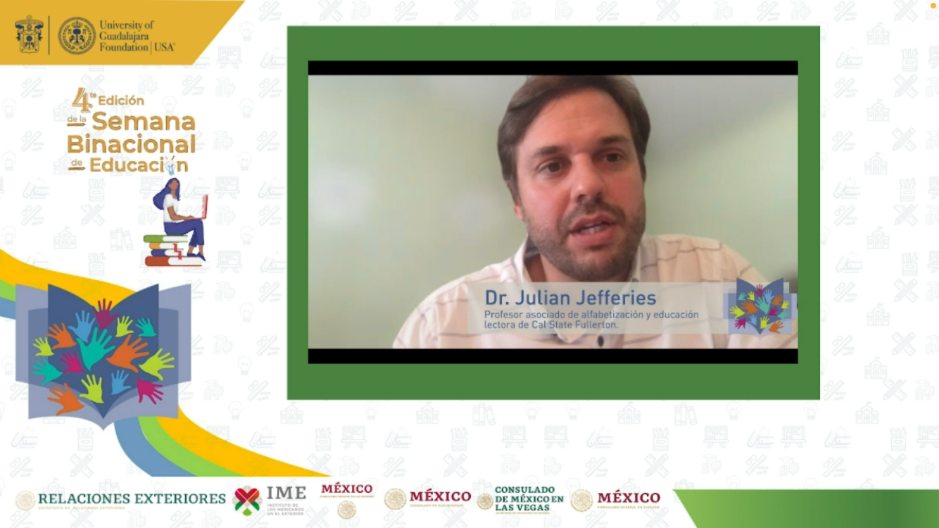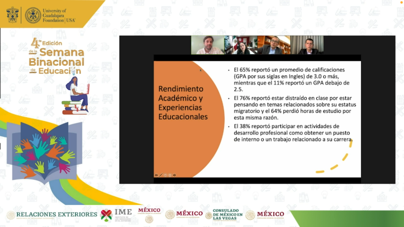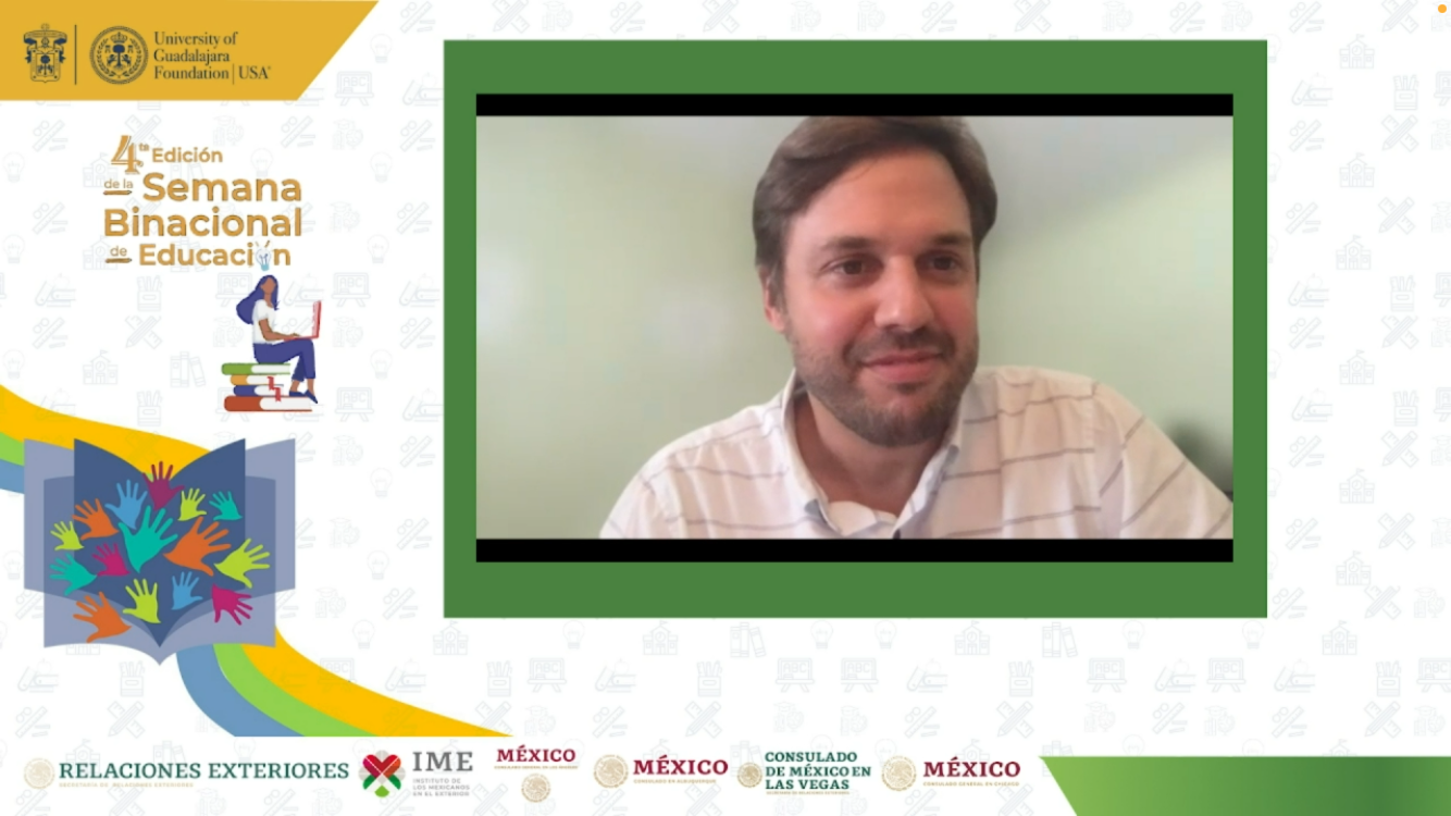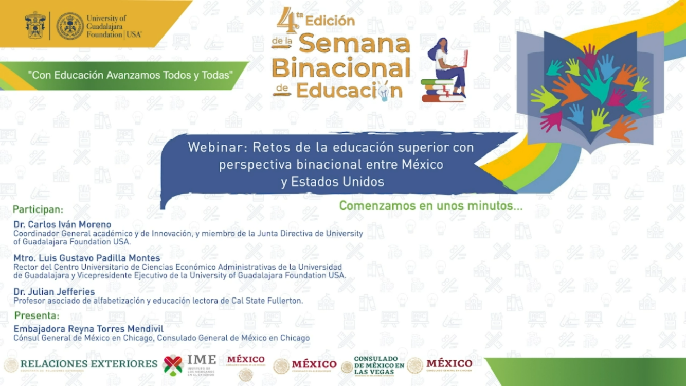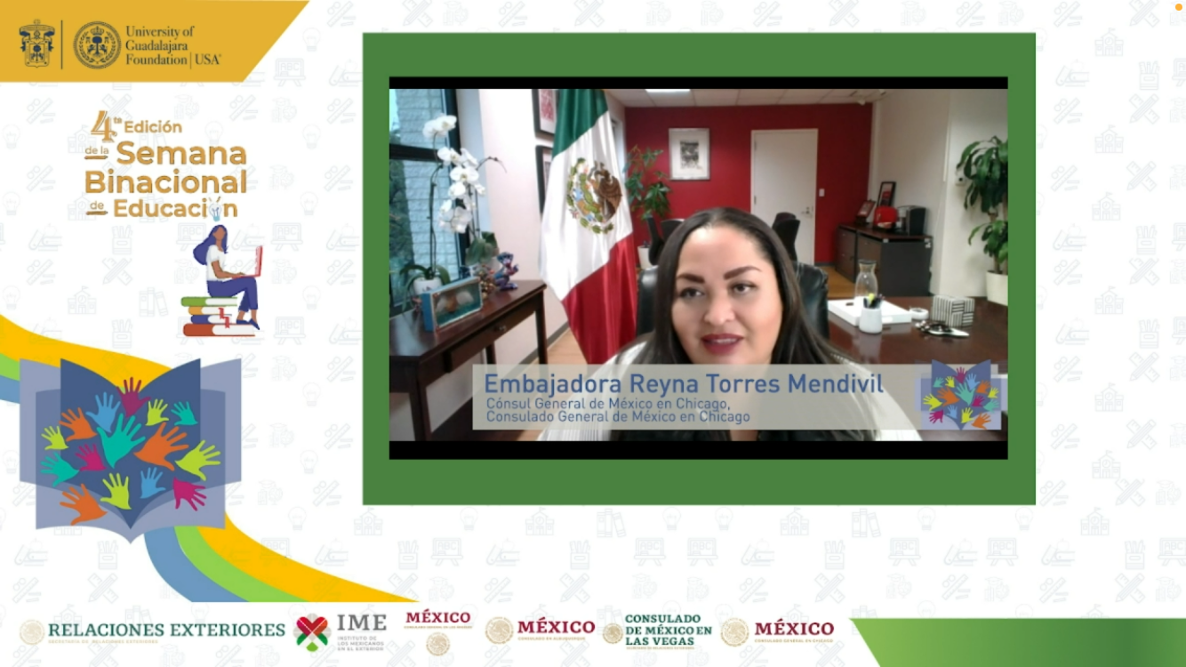 Moreno Arellano participó en el webinar “Retos de la educación superior con perspectiva binacional entre México y Estados Unidos”, que organizó la University of Guadalajara Foundation USA, en el marco de la cuarta edición de la Semana Binacional de Educación “Con educación avanzamos todos y todas”, iniciativa impulsada por el Instituto de los Mexicanos en el Exterior (IME), con la finalidad de brindar información sobre las oportunidades a las comunidades mexicanas que viven en EUA y Canadá.