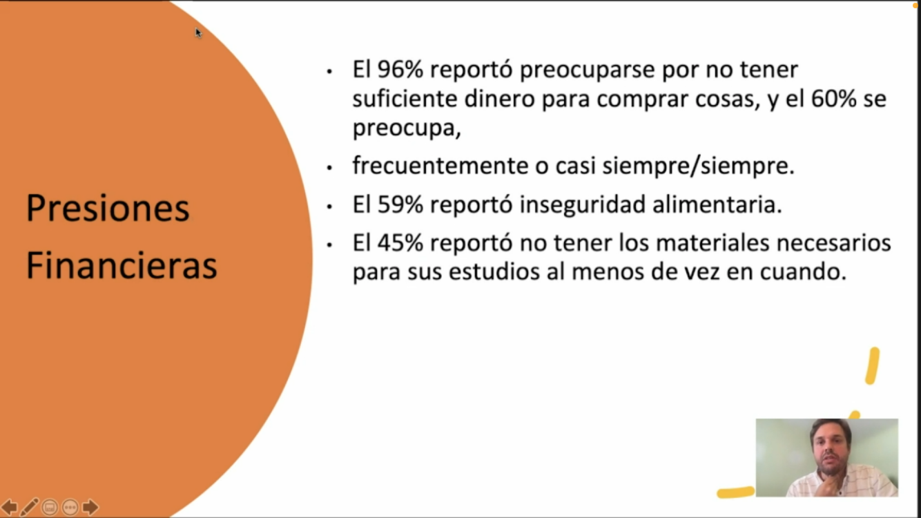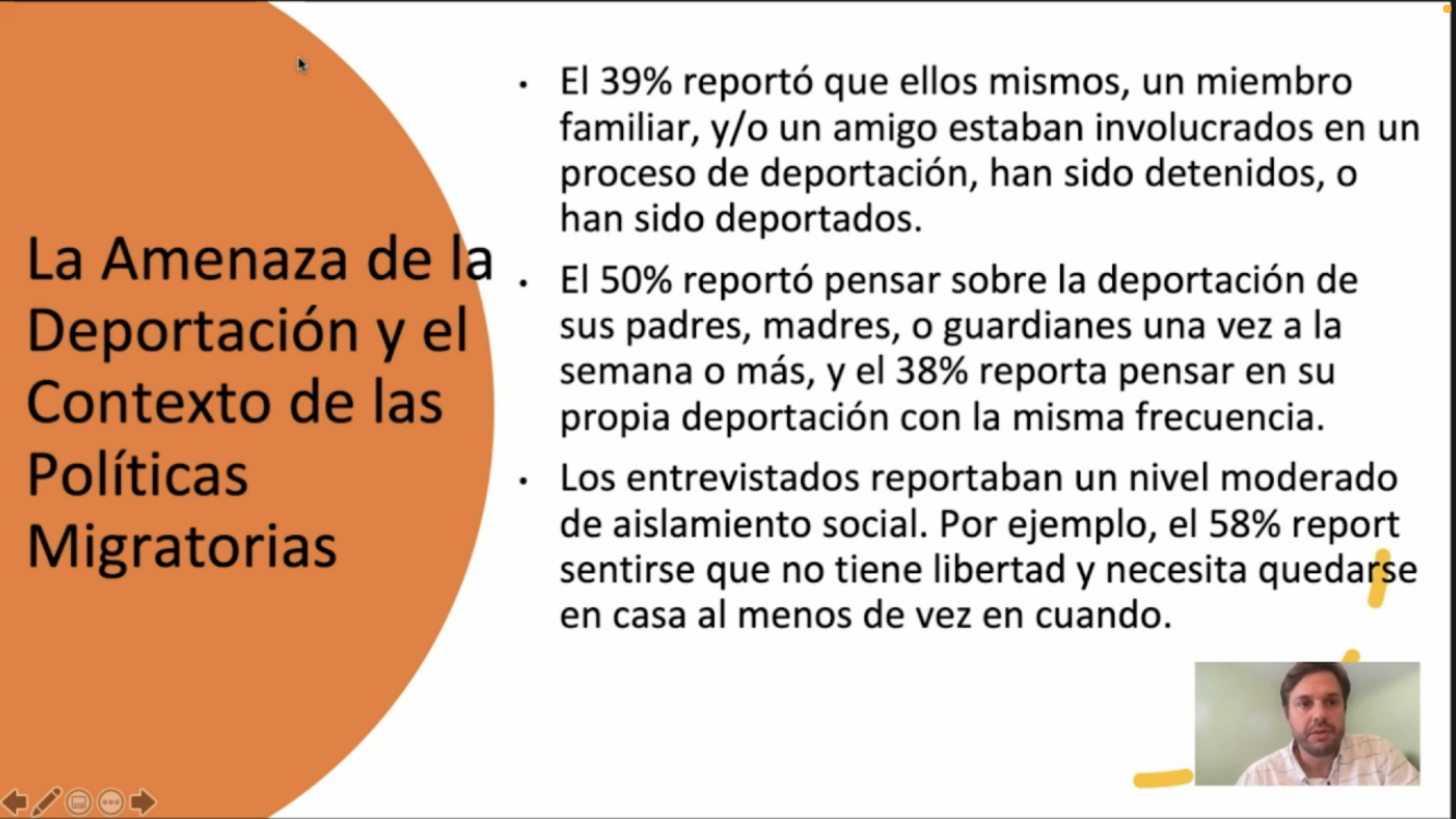 En dicha encuesta, 96 por ciento reportó preocuparse por no tener suficiente dinero para compras; 59 por ciento reportó inseguridad alimentaria y 45 por ciento no tener los materiales necesarios para sus estudios al menos de vez en cuando; 50 por ciento dijo pensar sobre la deportación de sus padres, madres o guardianes una vez a la semana o más, y 38 por ciento piensa en su propia deportación con la misma frecuencia.