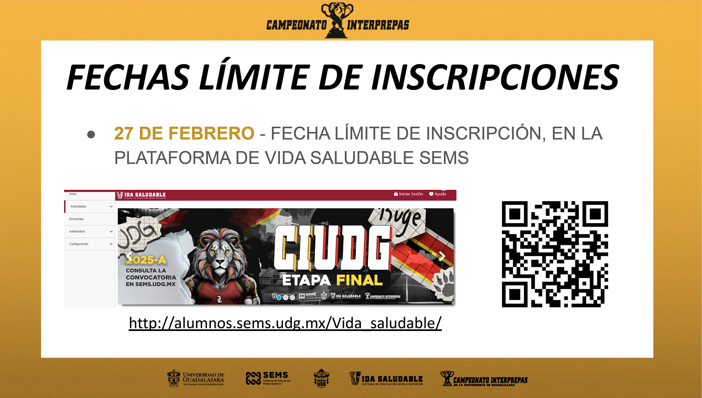 El Sistema de Educación Media Superior (SEMS) de la Universidad de Guadalajara, por medio de la Coordinación de Cultura y Educación para una Vida Saludable, prepara la inauguración de la etapa final del Campeonato Interprepas 2025-A, bajo el lema “Un siglo de historia, un futuro de campeones. ¡Interprepas nos lleva a lo más alto!”.