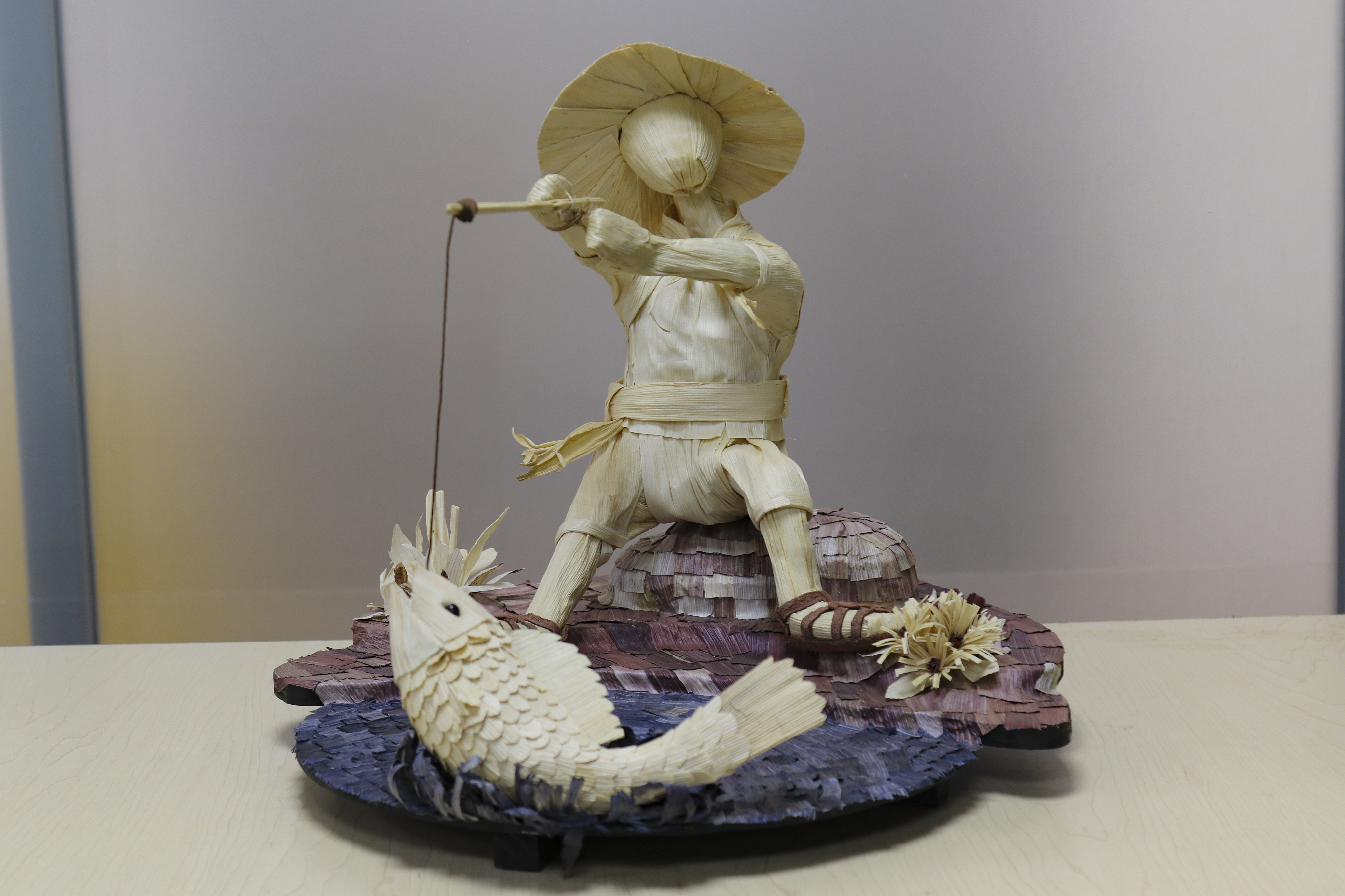 “Sé que hay artesanas y artesanos en diferentes partes de México, incluido Jalisco, que tiñen la hoja de maíz, principalmente con anilinas; su trabajo es muy bonito, pero a mí siempre me ha interesado que el material se muestre en su naturaleza, que al aproximarte a la pieza se vea la fibra, que te cuente parte de su historia el propio material, sobre todo en un campo mexicano en el que los cultivos tradicionales como el del maíz cada vez están más en riesgo. Para mí es importante que el producto del campo hable también de las personas, por eso mi trabajo casi siempre es de personajes”, explicó.