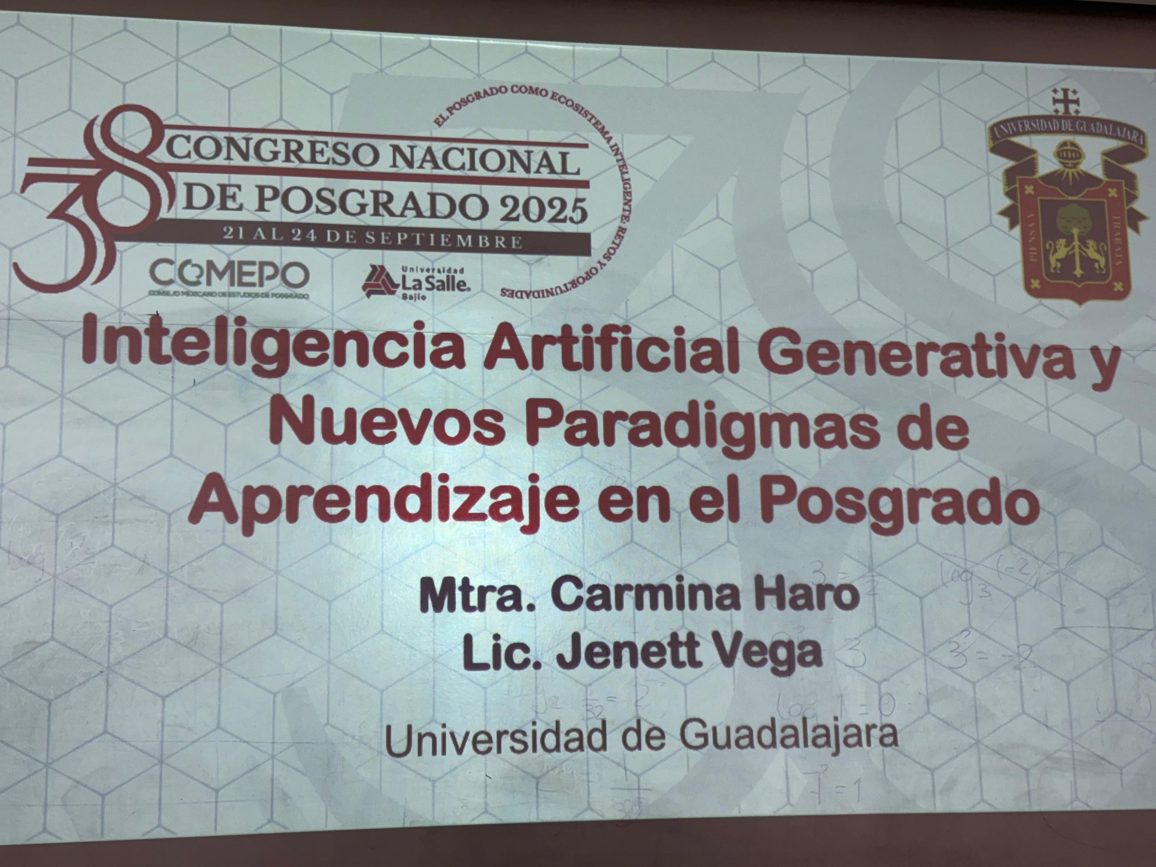 En este marco, la maestra Carmina Haro Ramírez, coordinadora de Posgrado, junto con la maestrante Janette Danai Vega Zuñiga, adscrita a la misma coordinación, presentaron la ponencia “Inteligencia Artificial Generativa y Nuevos Paradigmas de Aprendizaje en el Posgrado”.