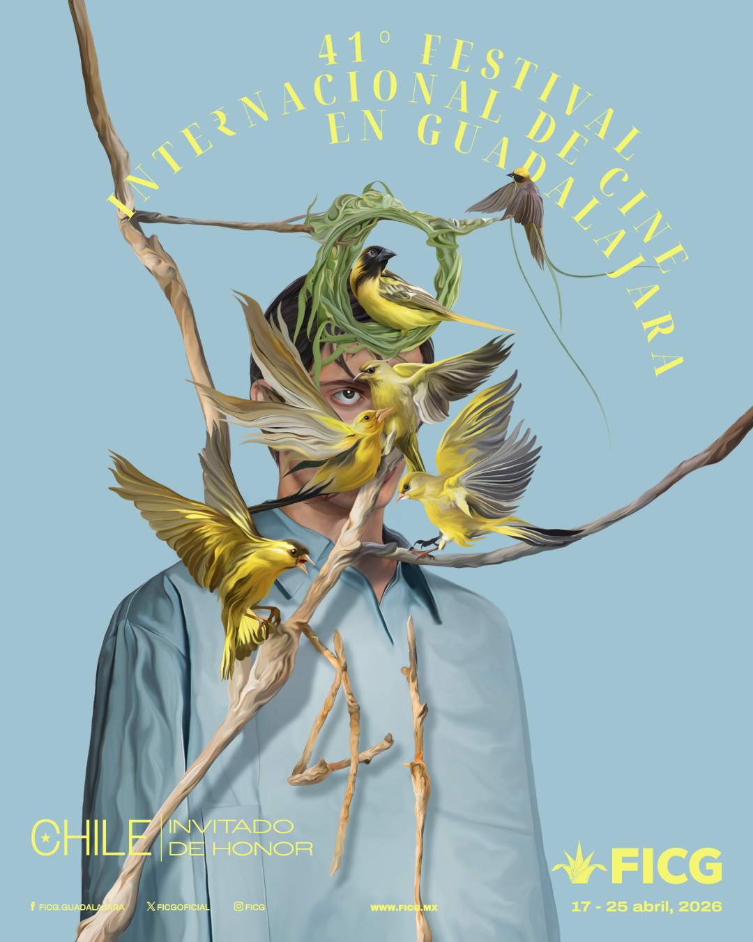 El Festival Internacional de Cine en Guadalajara (FICG) presentó su cartel oficial de la edición 41 –que tendrá lugar del 17 al 25 de abril–, creado por el artista Ricardo Luévanos, cuya propuesta visual convierte la introspección y el poder creativo en una metáfora cinematográfica.