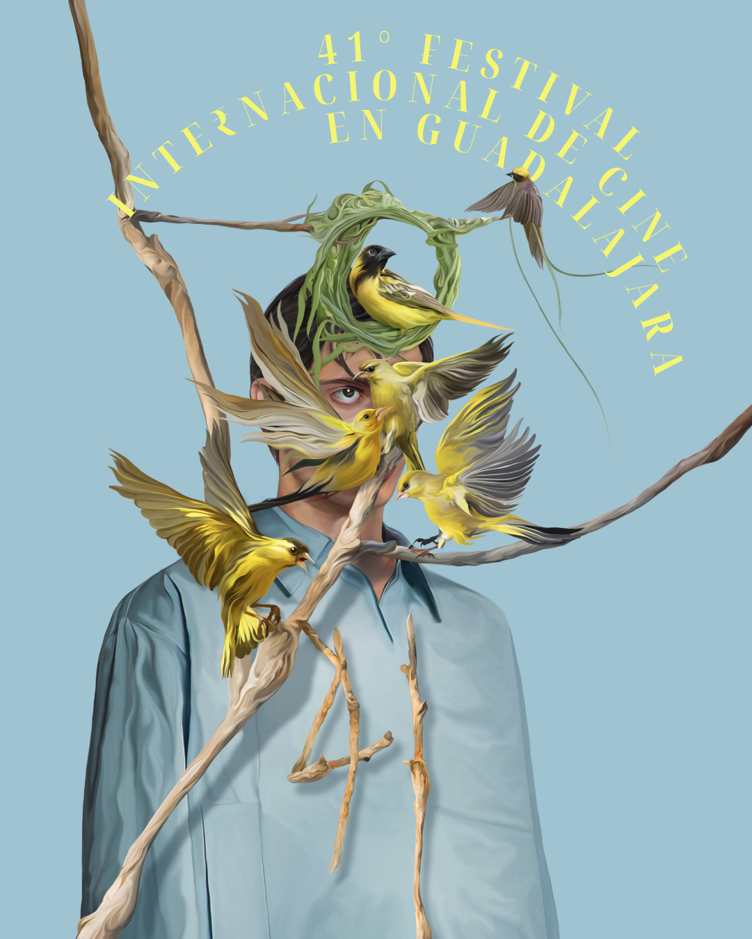 La inspiración para el cartel parte de las ideas y la materialización de la mente creativa. En el centro de la composición destaca una mirada que simboliza la introspección: ese instante decisivo en el que una idea comienza a tomar forma. En torno a ella aparecen pájaros tejedores, aves capaces de construir nidos complejos con técnica y dedicación, que funcionan como una analogía del proceso cinematográfico. Cada ave representa una idea en desarrollo: algunas permanecen, otras evolucionan y otras se transforman en algo distinto, explicó el artista.