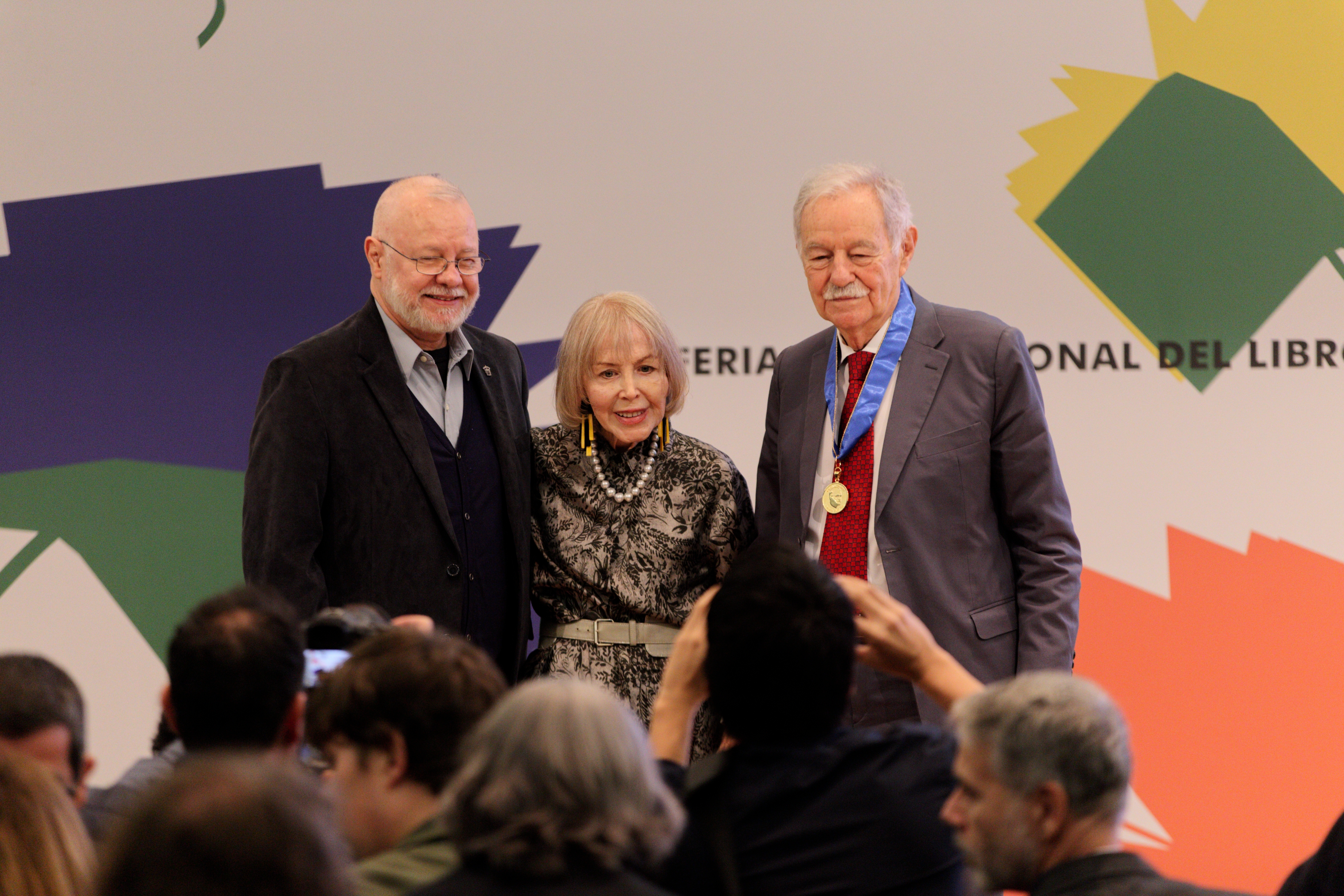 Silvia Lemus, viuda de Carlos Fuentes, impuso la medalla del novelista mexicano a Eduardo Mendoza; en la imposición estuvo acompañada por el Presidente de la FIL Guadalajara, maestro José Trinidad Padilla López.
