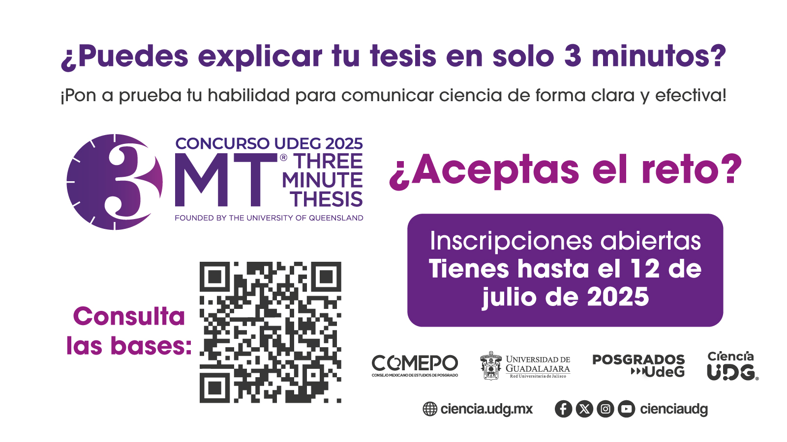 La Universidad de Guadalajara (UdeG), a través de la Vicerrectoría Adjunta Académica y de Investigación, invita a sus estudiantes de doctorado a participar en la edición 2025 del Concurso Universidad de Guadalajara 3MT, una iniciativa que reta a explicar su tesis doctoral en solo tres minutos, utilizando un lenguaje claro, accesible y sin tecnicismos.