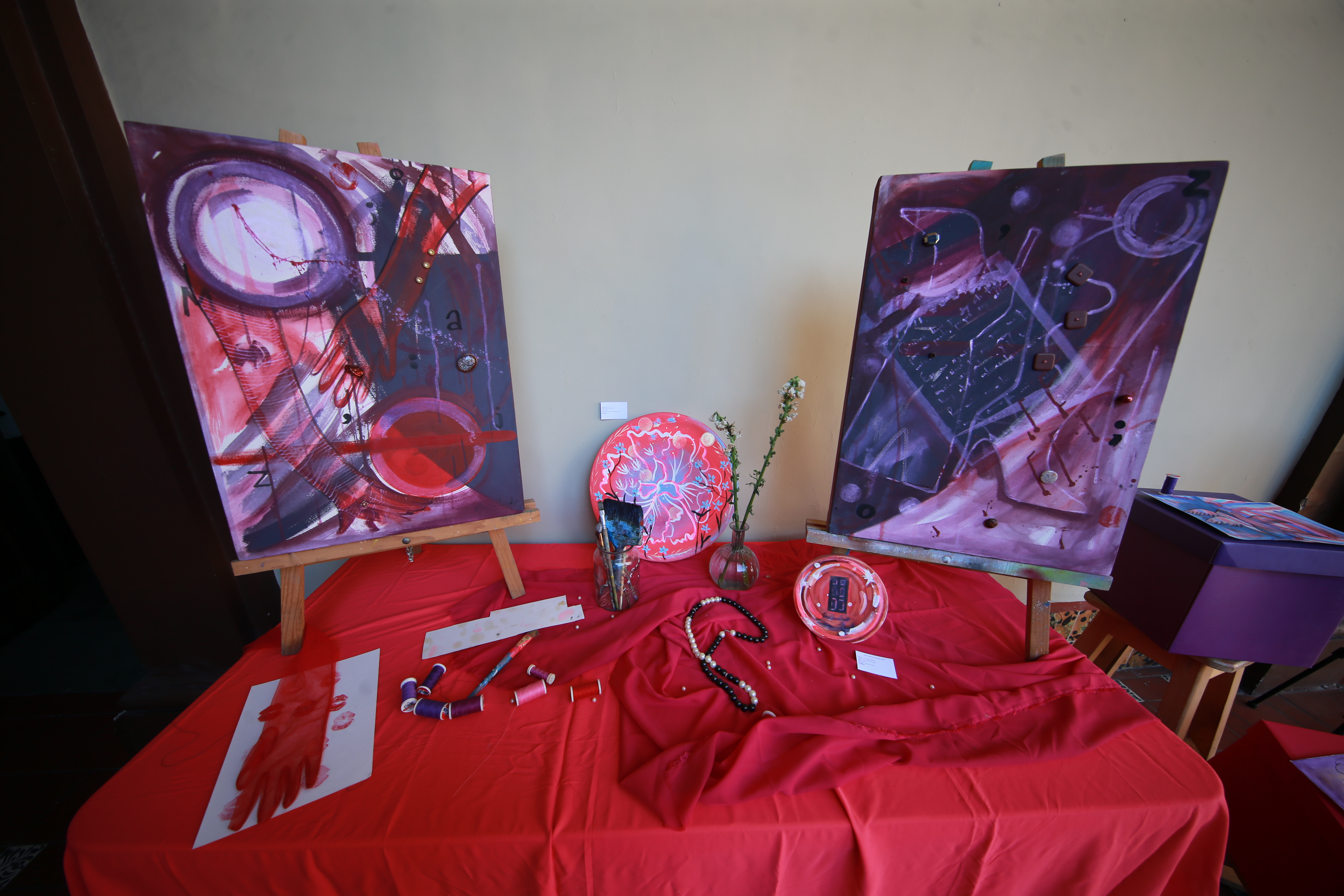 También se muestran obras que creó en otras etapas de su vida, por ejemplo, en la exposición es posible conocer de la autoexploración que atravesó María PocaSangre en ciertos periodos, la cual manifiesta a través de trazos rojizos que a su vez juegan con otros elementos que recuerdan la calidez del hogar de la artista.