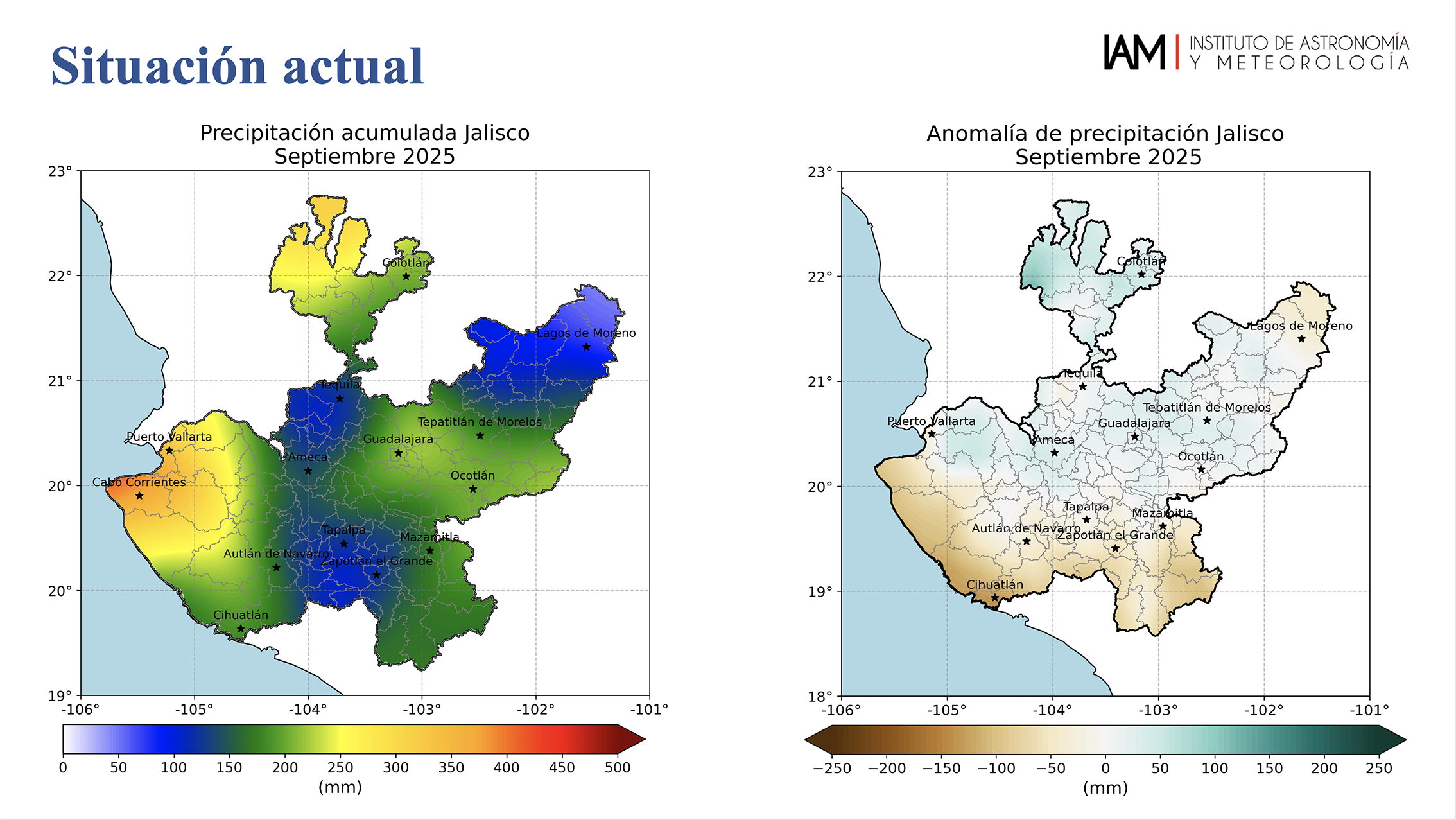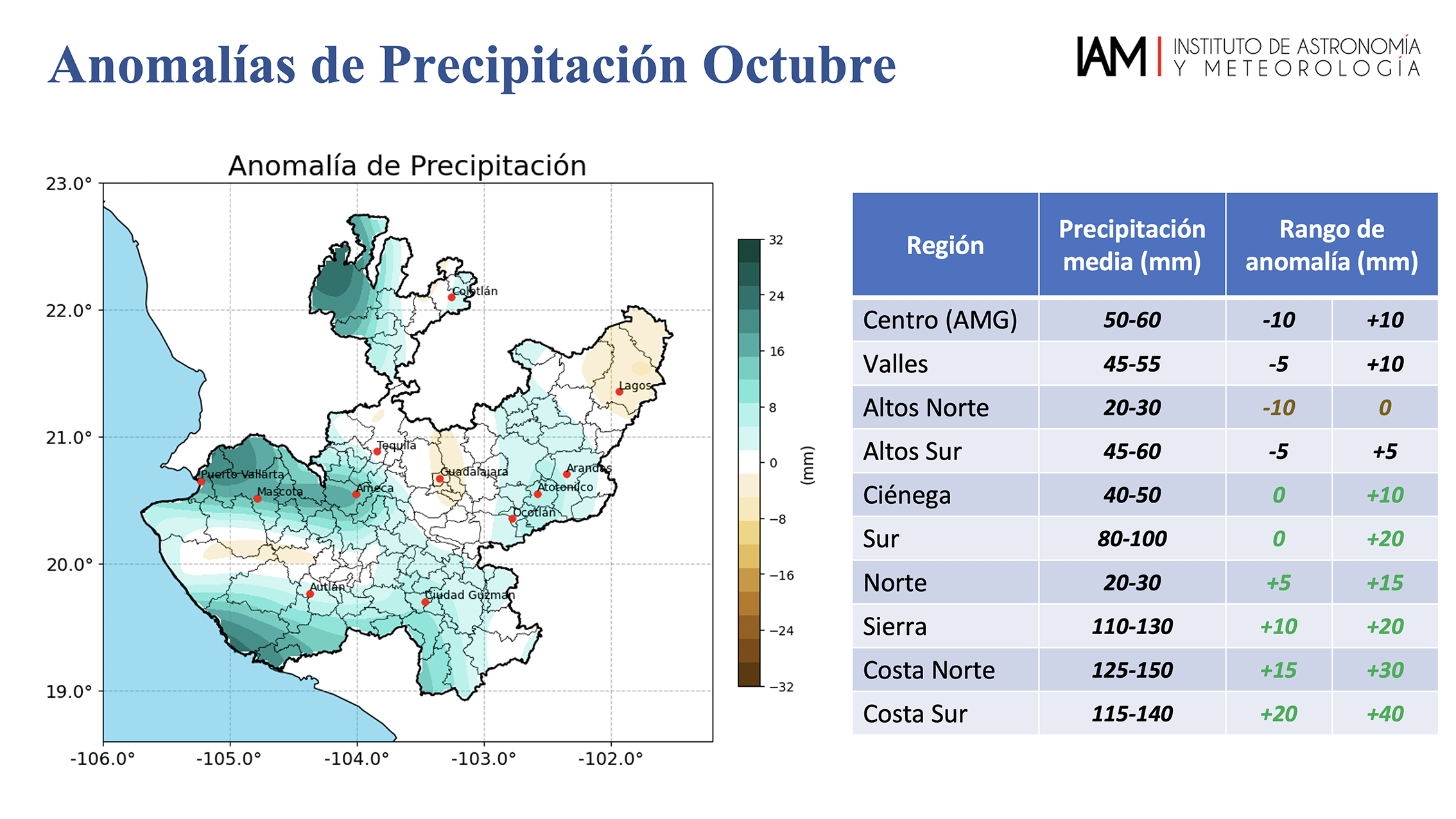 Las lluvias continuarán durante octubre por arriba del promedio desde el centro del estado hasta la zona costera, mientras que para el resto de la entidad se esperan menos precipitaciones, aseguraron en conferencia de prensa especialistas del Instituto de Astronomía y Meteorología (IAM), del Centro Universitario de Ciencias Exactas e Ingenierías (CUCEI) de la Universidad de Guadalajara.