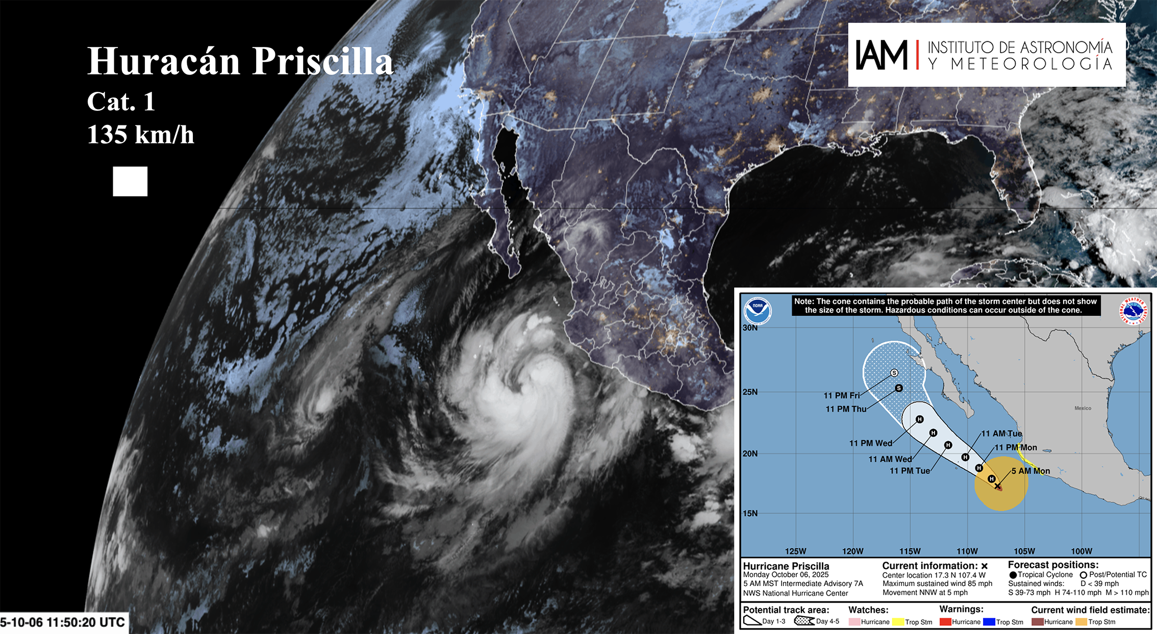 “Nos faltan todavía algunos días en donde se podrían presentar algunas. De hecho, en este momento tenemos la tormenta tropical ‘Priscila’, que ha dejado algunas precipitaciones de manera indirecta los últimos días porque no ha tocado tierra y no tocará tierra en nuestro estado, pero sí las bandas nubosas han dejado algunas lluvias en zonas montañosas y en zonas costeras, y esto continuará en el transcurso del día de hoy y los próximos días”, afirmó el doctor Mauricio López Reyes, meteorólogo operativo del IAM.