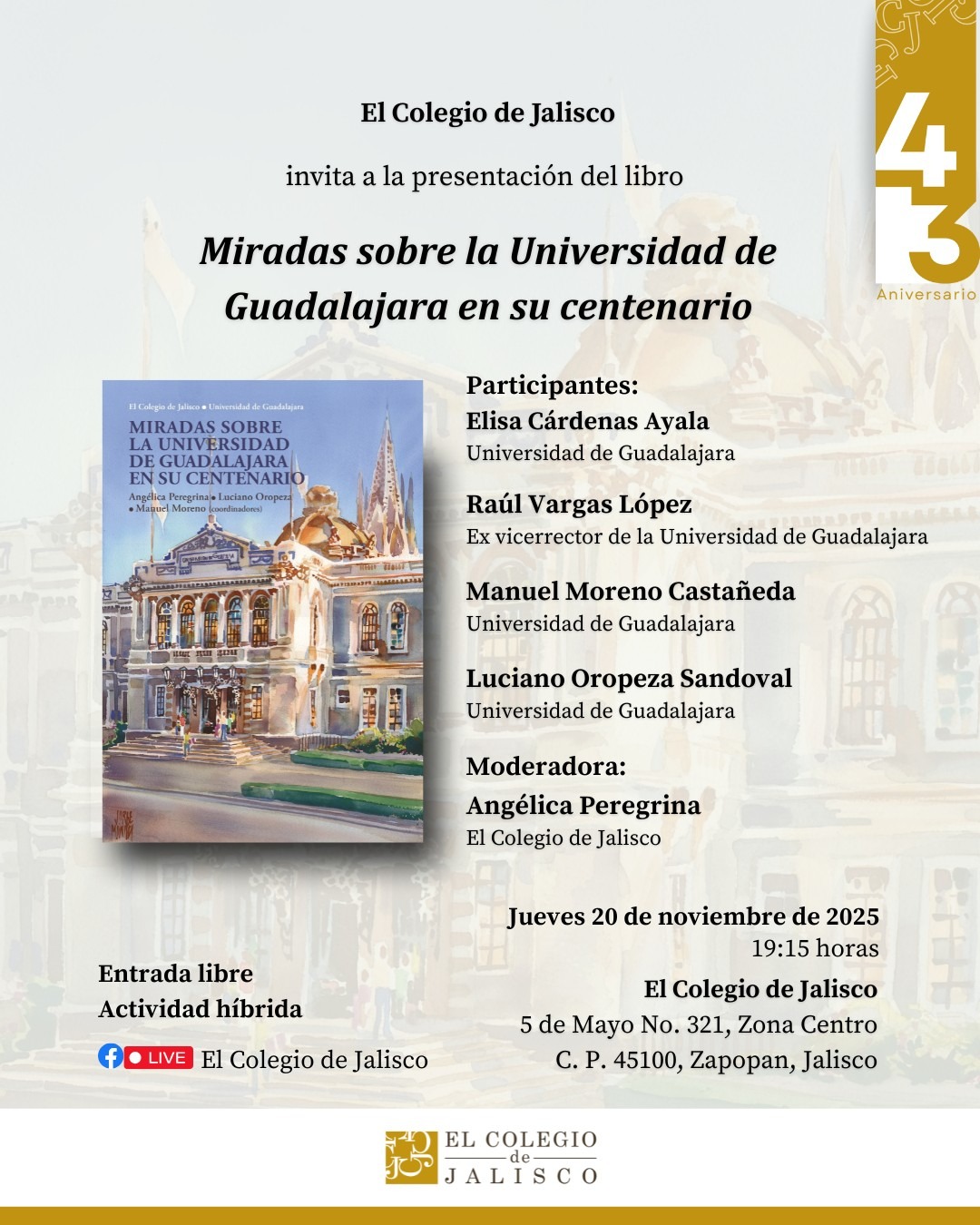 Con el fin de analizar la fundación de la Universidad de Guadalajara (UdeG) en 1925, su contexto político y social y cómo buscaba cumplir con las promesas sociales de abrir la educación superior a todos los estratos sociales nacidos en la posrevolución, fue escrito el libro Miradas sobre la Universidad de Guadalajara en su centenario, en el que participan doce autores bajo la coordinación de la doctora Angélica Peregrina, Luciano Oropeza y Manuel Moreno.