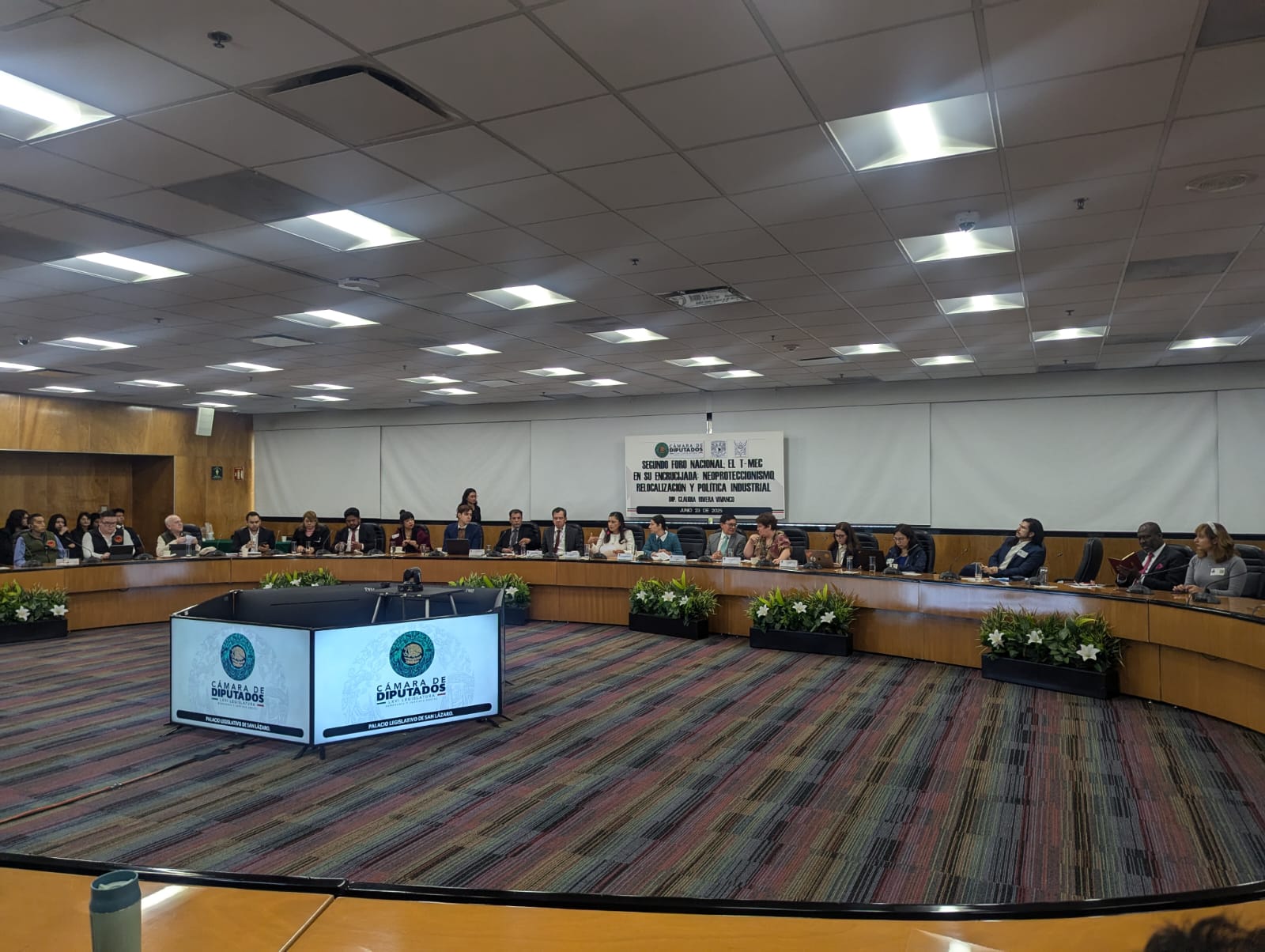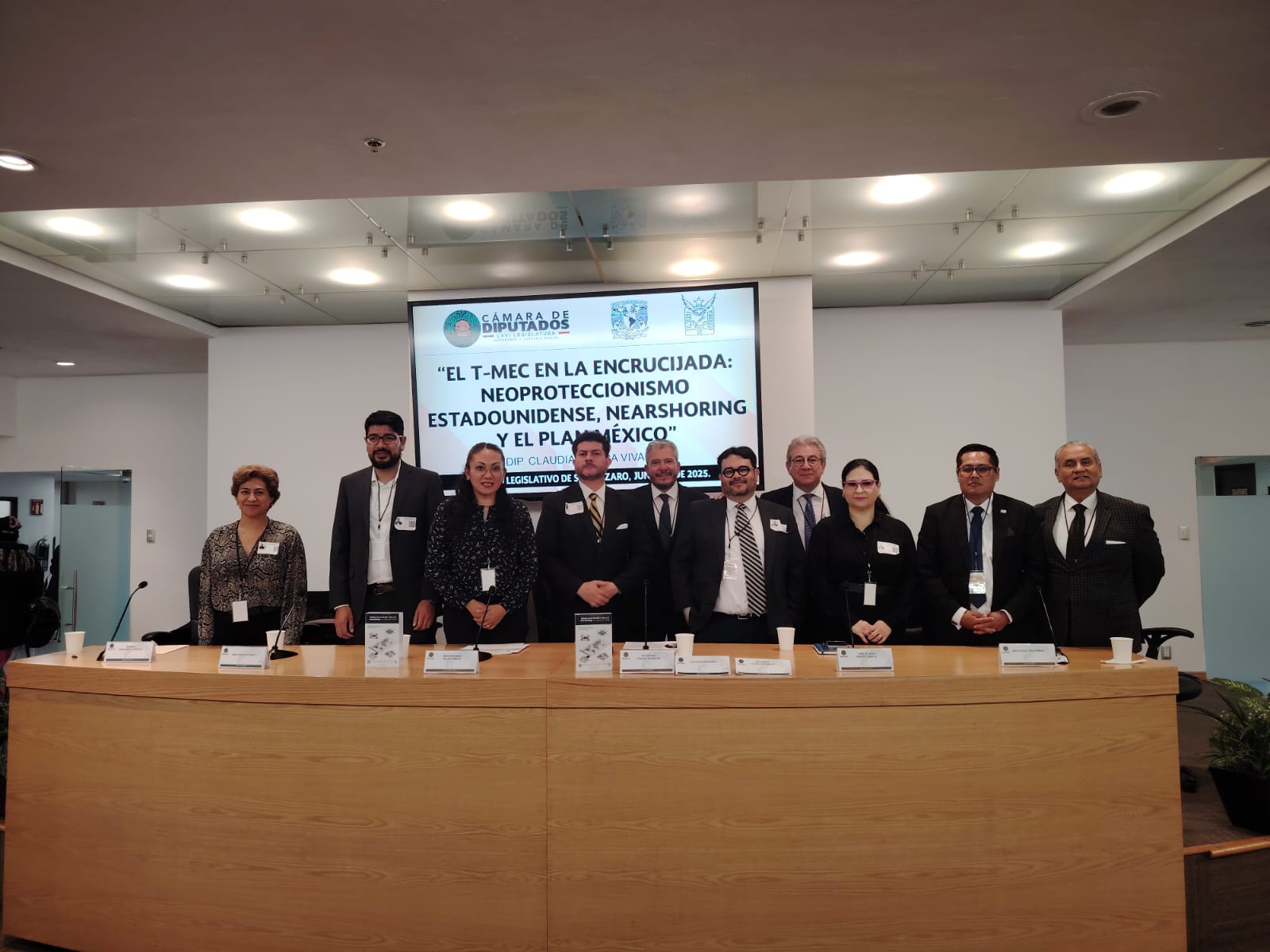 Docentes y estudiantes del Centro Universitario de Ciencias Económico Administrativas (CUCEA) de la UdeG participaron en el Segundo foro nacional “El T-MEC en la encrucijada: neoproteccionismo estadounidense, nearshoring y el Plan México”, que tuvo lugar en la Cámara de Diputados federal.
