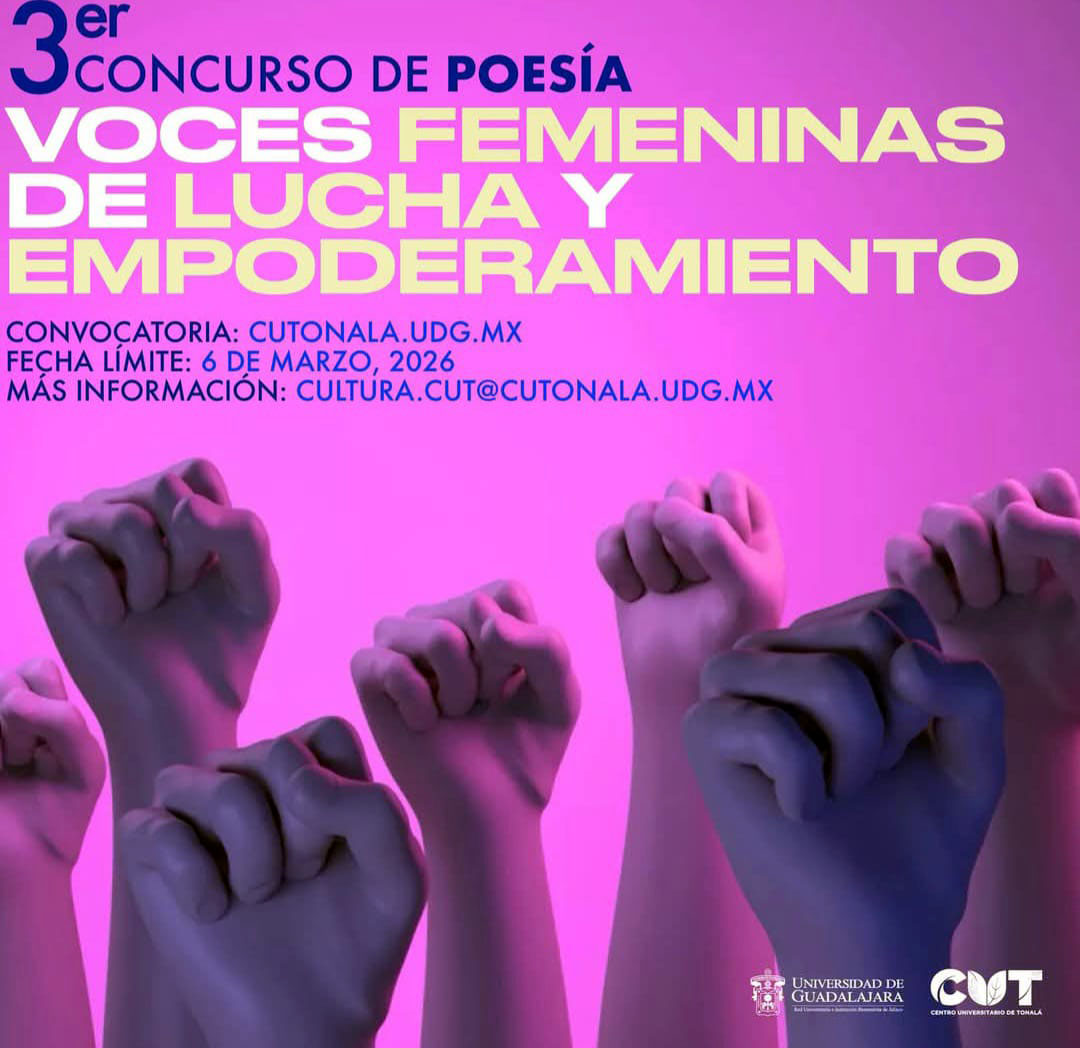 En el marco del Día Internacional de la Mujer, celebrado el 8 de marzo (8M), el Centro Universitario de Tonalá (CUTonalá) convoca a todas las mujeres que conforman la Red Universitaria (docentes, alumnas, administrativas) de la Universidad de Guadalajara (UdeG) a participar en la tercera edición del concurso de poesía Voces Femeninas de Lucha y Empoderamiento, espacio para que la poesía se convierta en voz, reflexión y empoderamiento.
