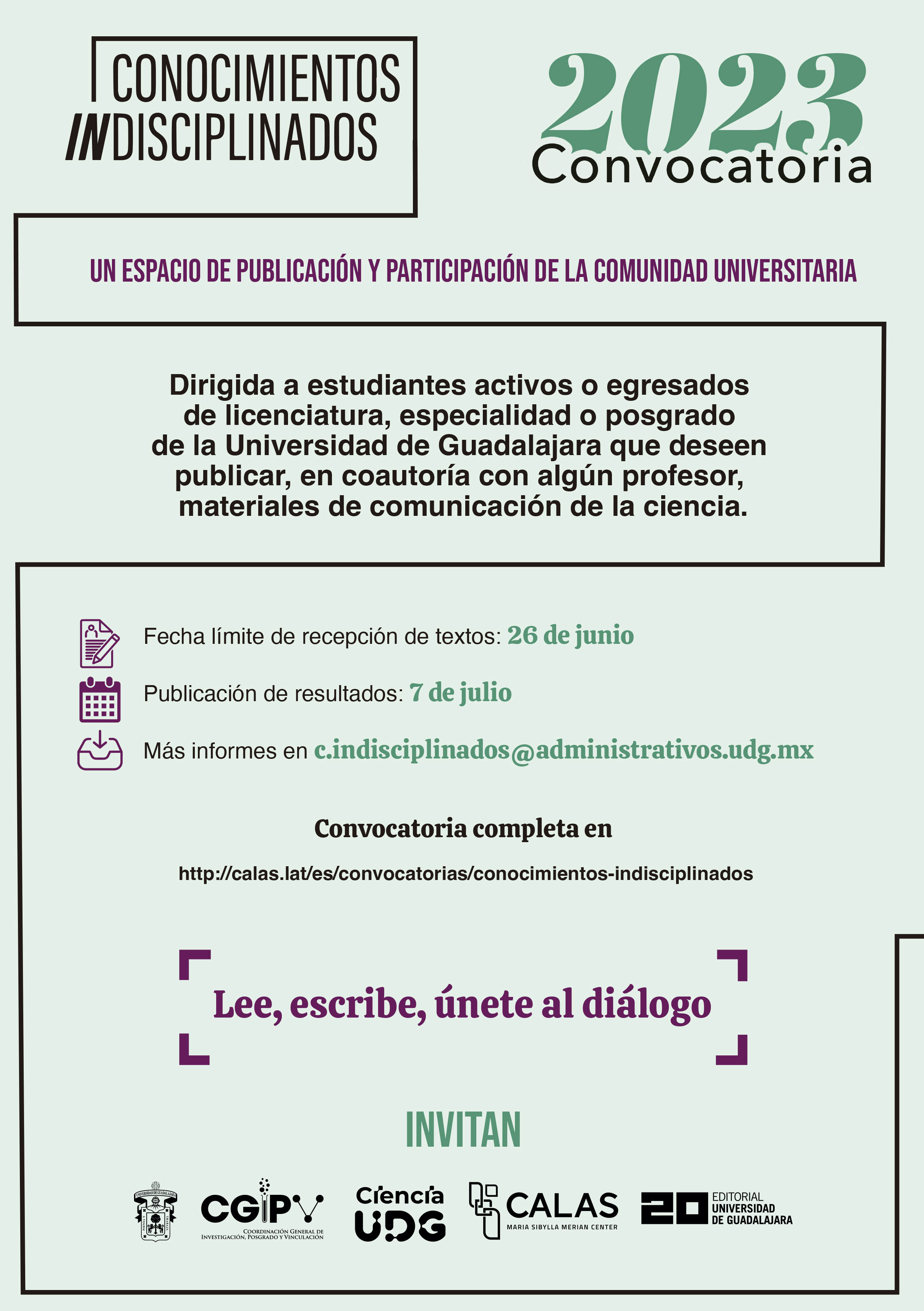 La Universidad de Guadalajara (UdeG) y el Centro María Sibylla Merian de Estudios Latinoamericanos Avanzados (CALAS) convocan a estudiantes de licenciatura, especialidades y posgrados a publicar un texto de comunicación de las ciencias en el proyecto editorial Conocimientos indisciplinados.