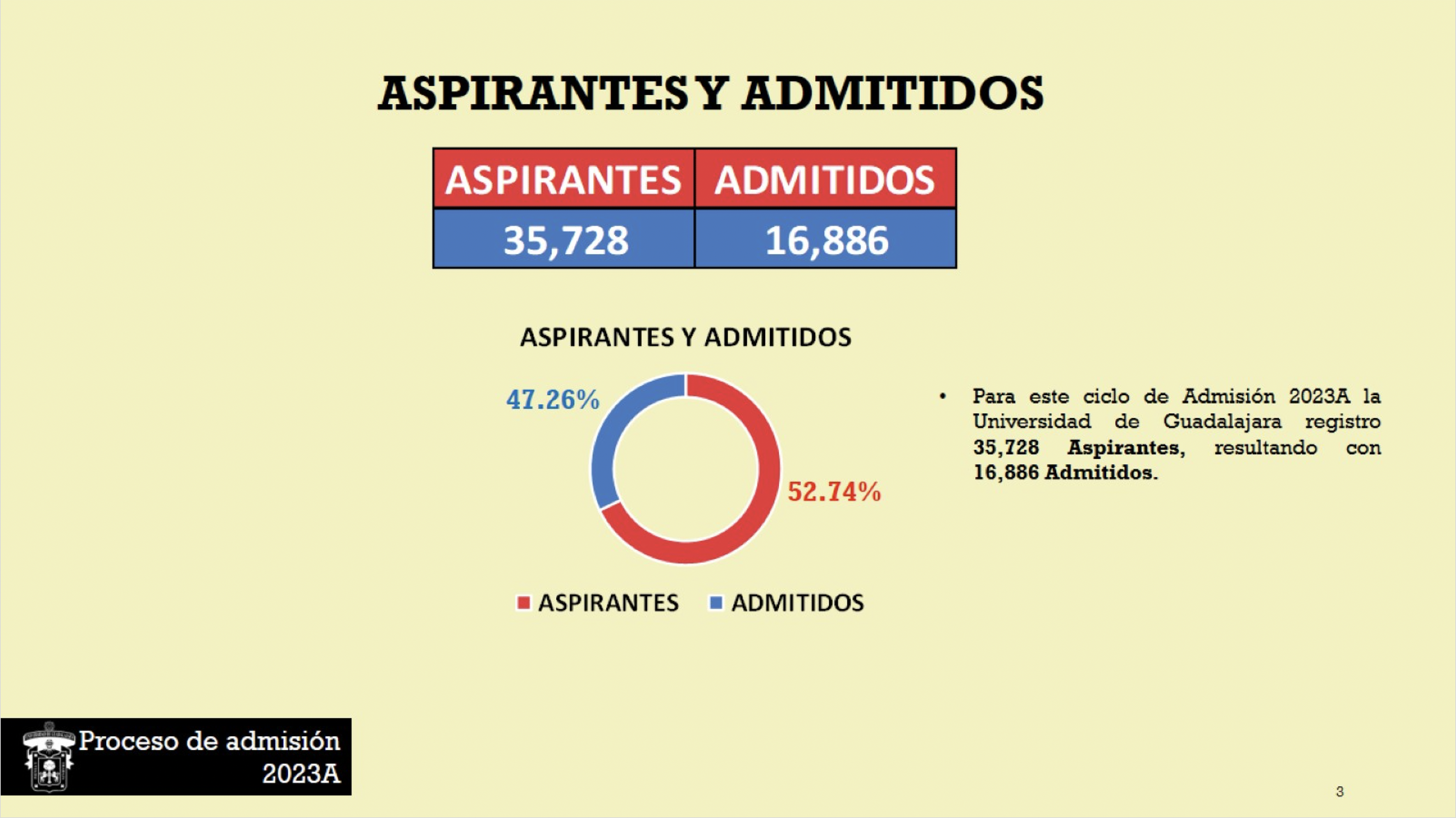 La Universidad de Guadalajara admitió a 16 mil 886 jóvenes aspirantes a licenciatura en los centros universitarios metropolitanos, regionales y el Sistema de Universidad Virtual (SUV), que significan 47.26 por ciento del total de trámites completos recibidos para el calendario escolar 2023-A que inicia el próximo 16 de enero, así lo informó la Coordinadora General de Control Escolar de esta Casa de Estudio, maestra Laura Margarita Puebla Pérez.
