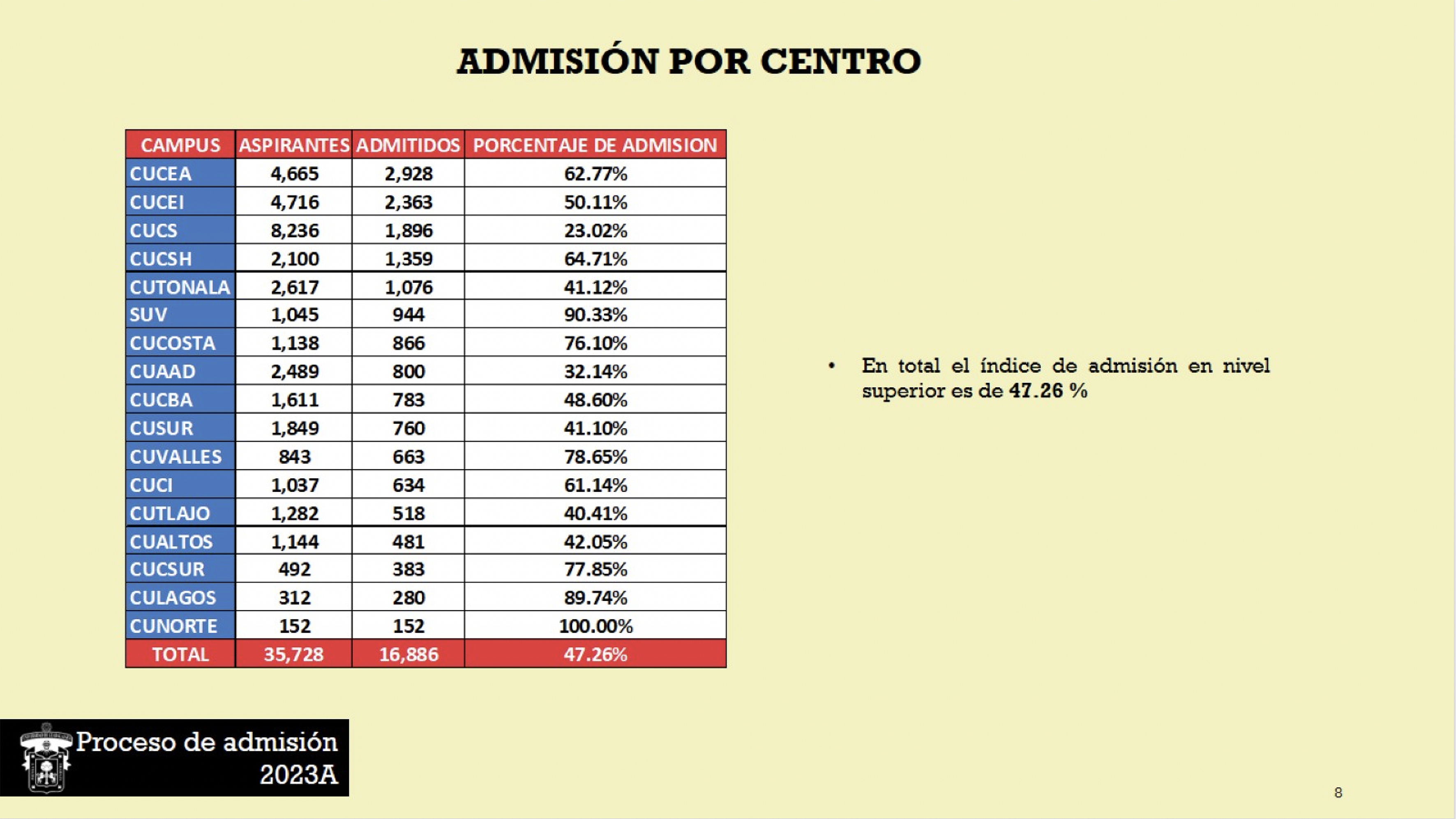 Puebla Pérez detalló que el Centro Universitario del Norte (CUNorte) fue el que más estudiantes admitió con 100 por ciento de los 152 aspirantes, seguido del SUV con 90.33 por ciento de sus mil 045 aspirantes; luego, el Centro Universitario de los Lagos (CULagos), al admitir a 89.74 por ciento de 312 aspirantes.