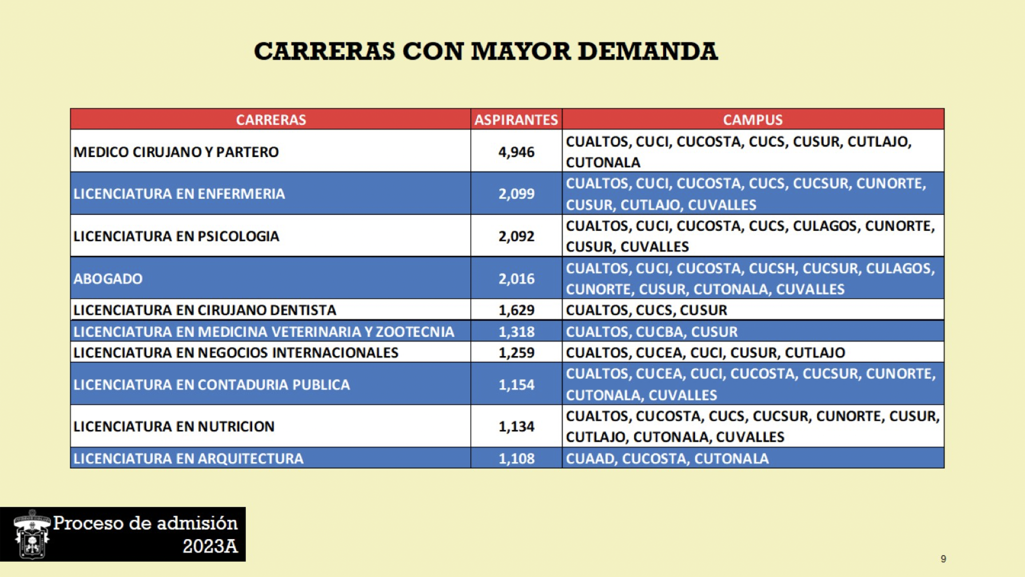 La carrera de Médico Cirujano y Partero se mantiene a la cabeza como la licenciatura más demandada con 4 mil 946 aspirantes en los siete centros universitarios en los que es ofertada, seguida de la licenciatura en Enfermería con 2 mil 099 aspirantes en los nueve campus que la ofertan, incluido el nuevo Centro Universitario de Tlajomulco (CUTlajomulco); en tercer lugar está la carrera de Psicología, con 2 mil 092 aspirantes en ocho centros y en cuarto lugar la carrera de Abogado, con 2 mil 016 aspirantes en diez centros universitarios.