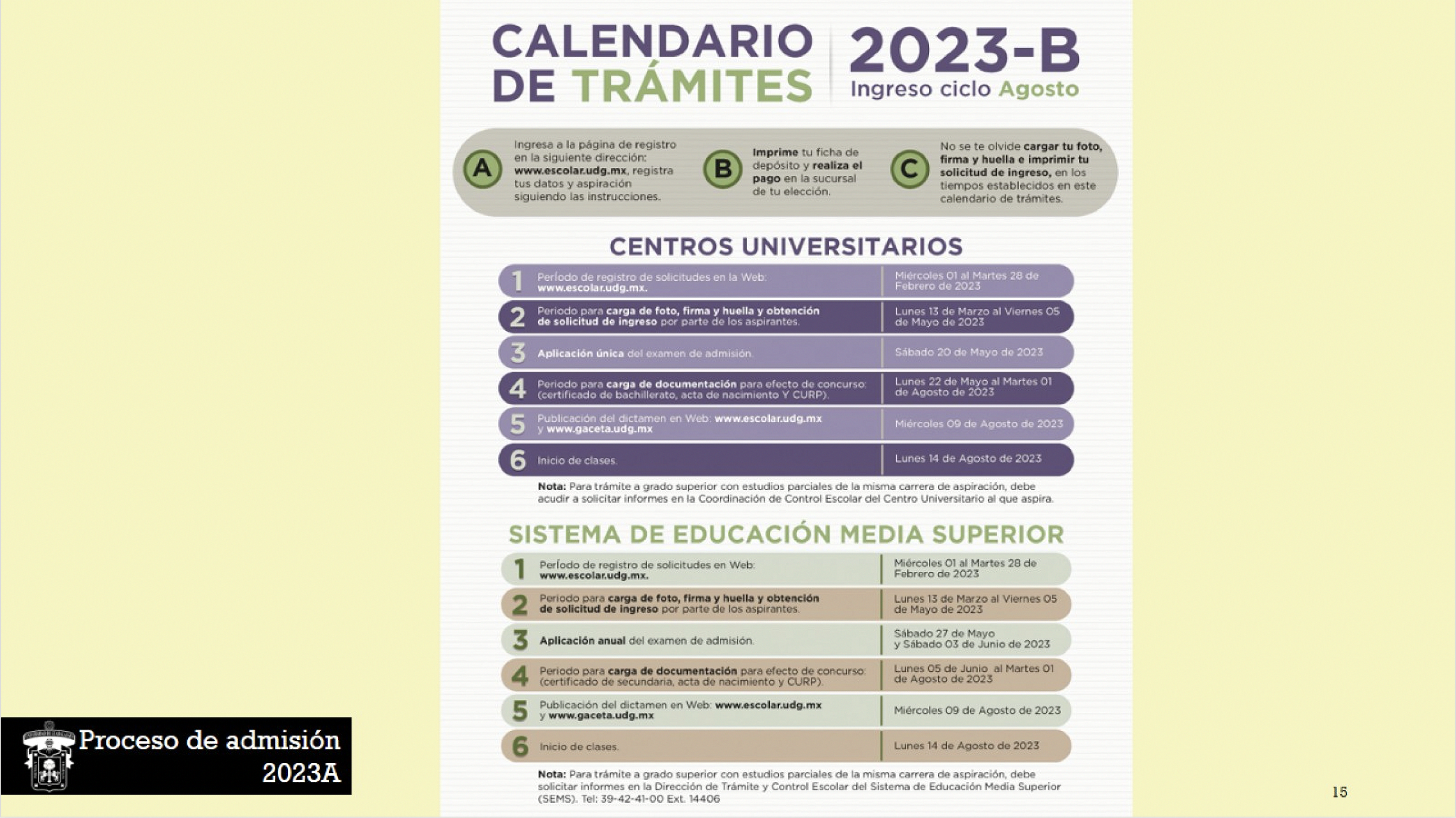 Recordó asimismo que en este calendario sólo ingresan los aspirantes a licenciatura, pues quienes ingresan a bachillerato son dictaminados de manera anual durante el calendario escolar B.