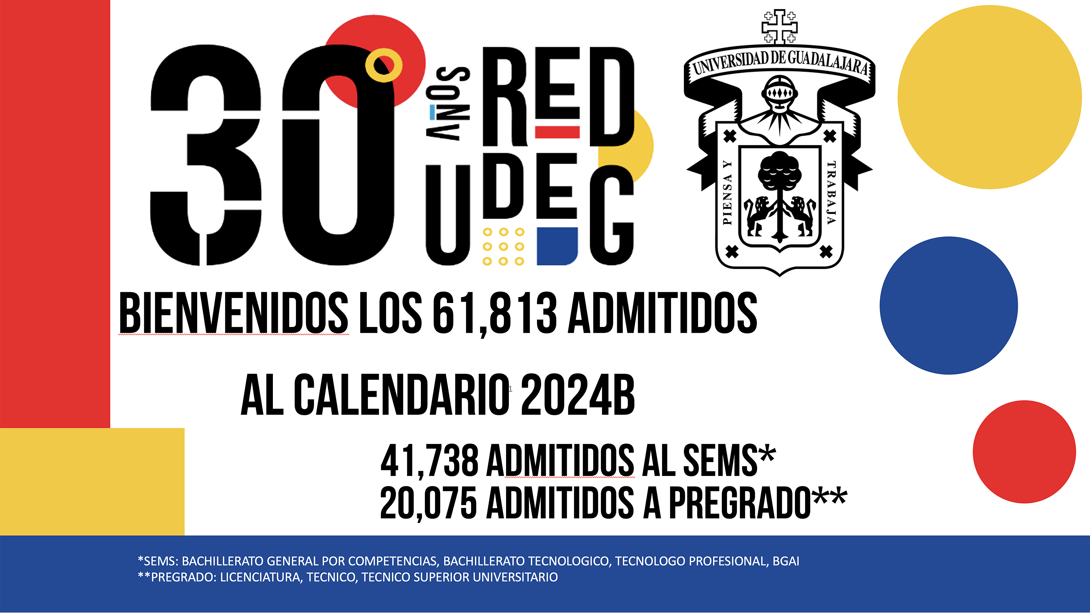 La Universidad de Guadalajara (UdeG) admitió a 20 mil 075 aspirantes a licenciatura en centros universitarios metropolitanos y regionales para el semestre 2024-B, lo que representa un aumento en admitidos en comparación con el mismo calendario de 2023-B.