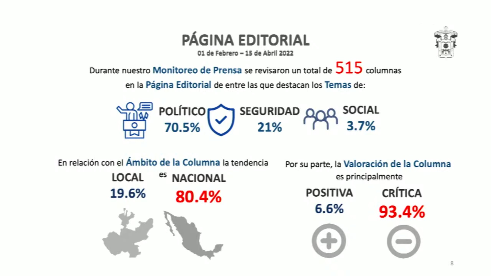 El abordaje editorial se desborda frente a lo informativo, ya que los editorialistas abordan más temas nacionales (80.4 por ciento) que los locales (19.6), con una valoración crítica de 93.4 por ciento.