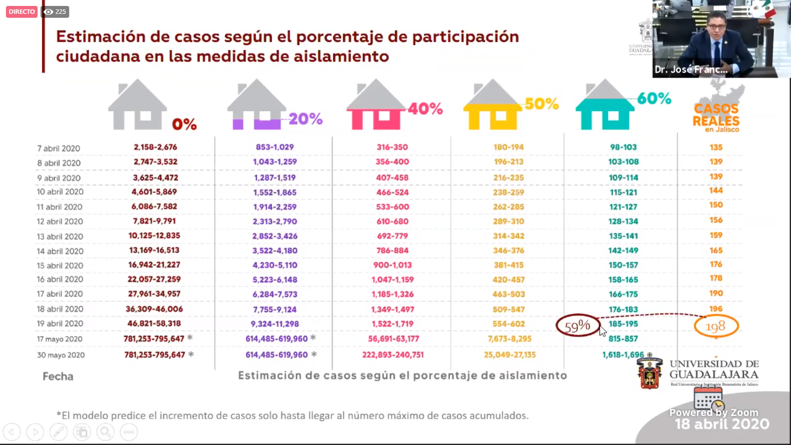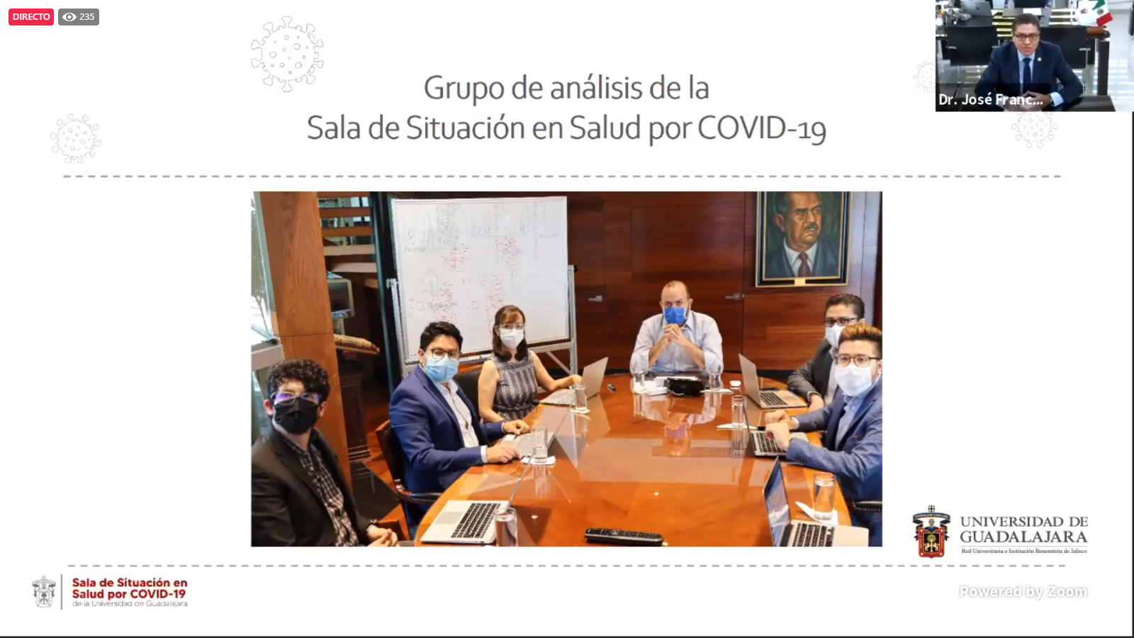 Destacó la labor de la Universidad de Guadalajara, que desde el mes de enero empezó a trabajar con las medidas que eran pertinentes a difundir entre la población y por la instalación de la Sala de Situación en Salud por COVID-19, sugerencia de las organizaciones Panamericana de la Salud y Mundial de la Salud, a partir de la cual se emiten recomendaciones y sugerencias.