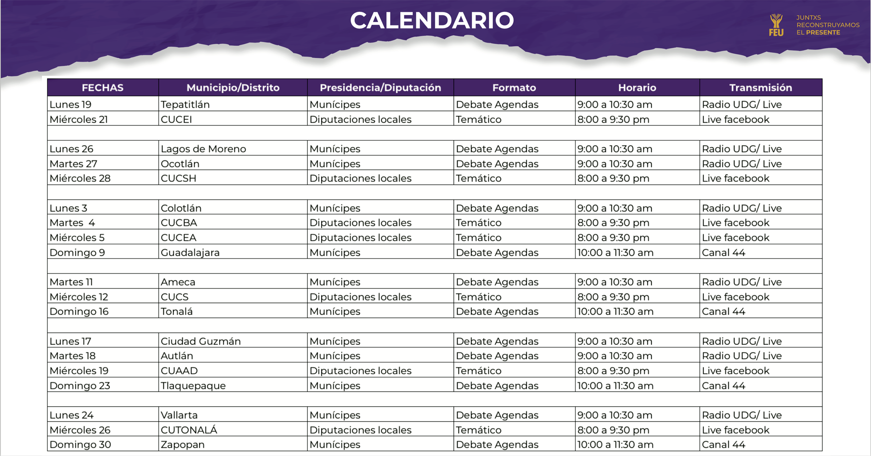 La Federación de Estudiantes Universitarios (FEU) anunció la realización de 19 debates en diversos municipios de Jalisco, los cuales serán transmitidos en las plataformas del Sistema Universitario de Radio, Televisión y Cinematografía (SURTyC), de la UdeG, tales como Canal 44, Radio Universidad y las redes sociales digitales. Estos ejercicios cuentan con el visto bueno del Instituto Electoral y de Participación Ciudadana de Jalisco (IEPC).