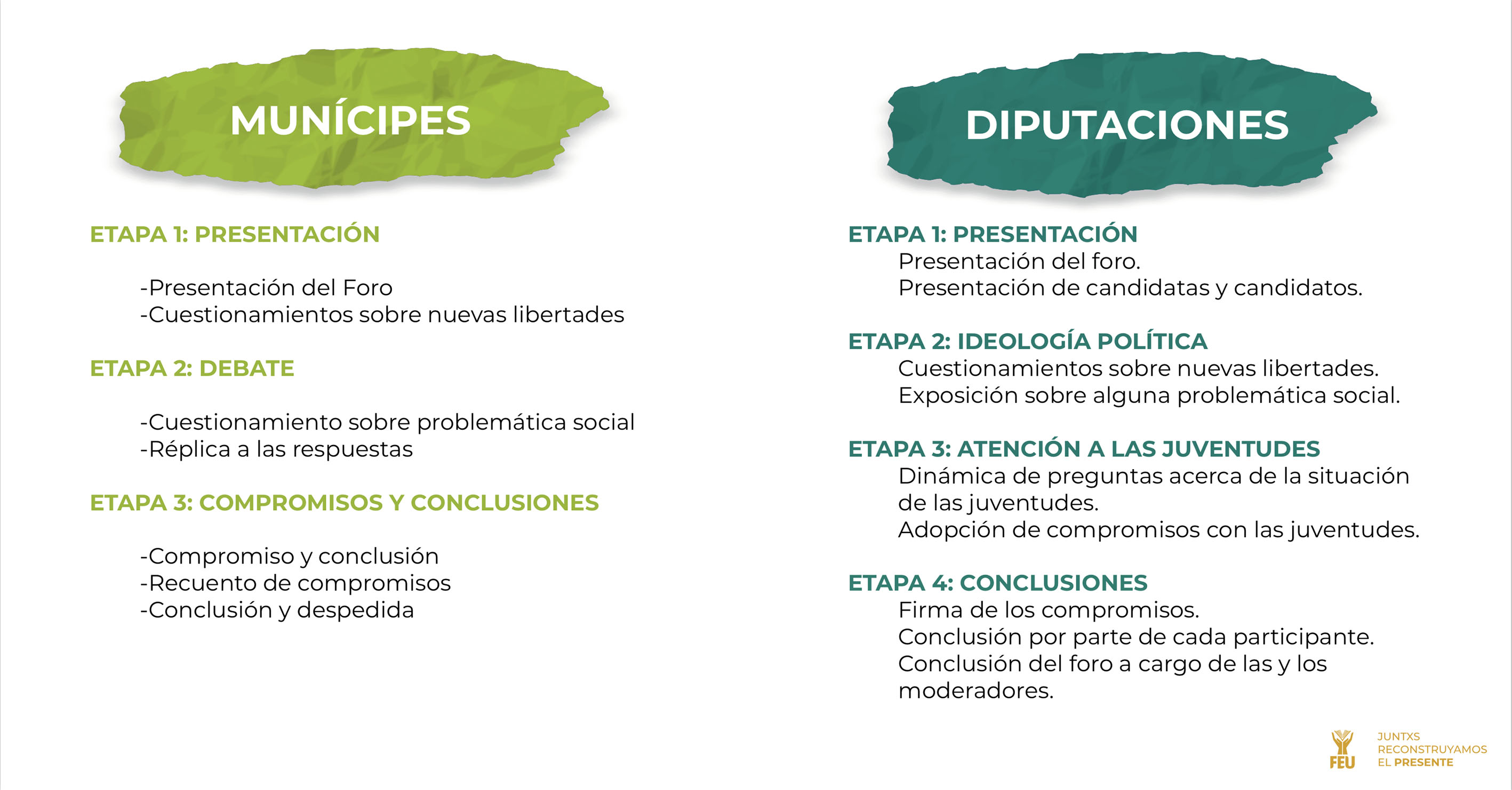 Se trata de los debates “Fuera del círculo”, que forman parte del programa Partícipes con el cual la FEU busca incentivar la participación electoral de los jóvenes. De estos 19 debates, 12 corresponden a presidencias municipales y siete a diputaciones. Para quienes aspiran a una curul en el Congreso local, esos siete foros serán temáticos.