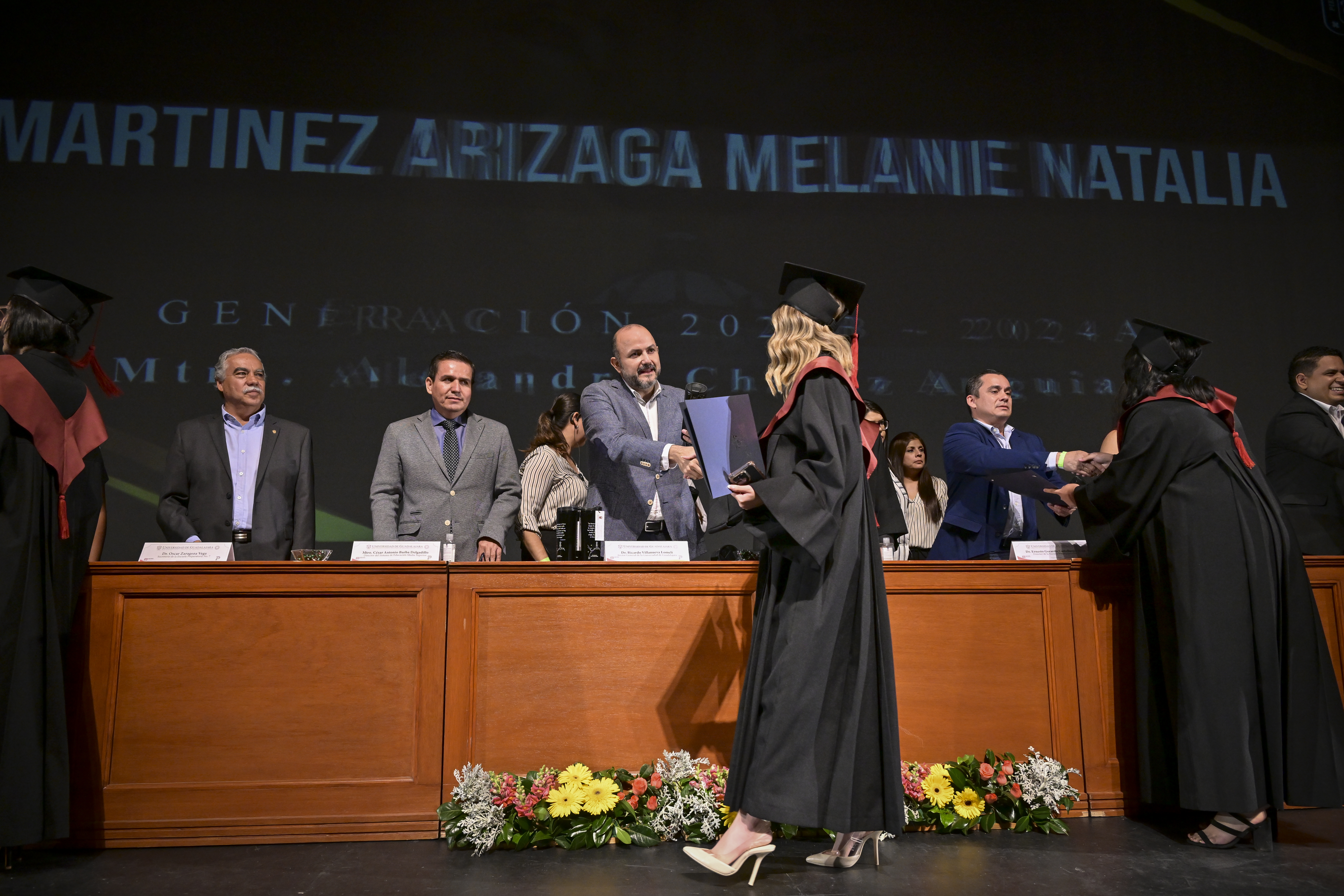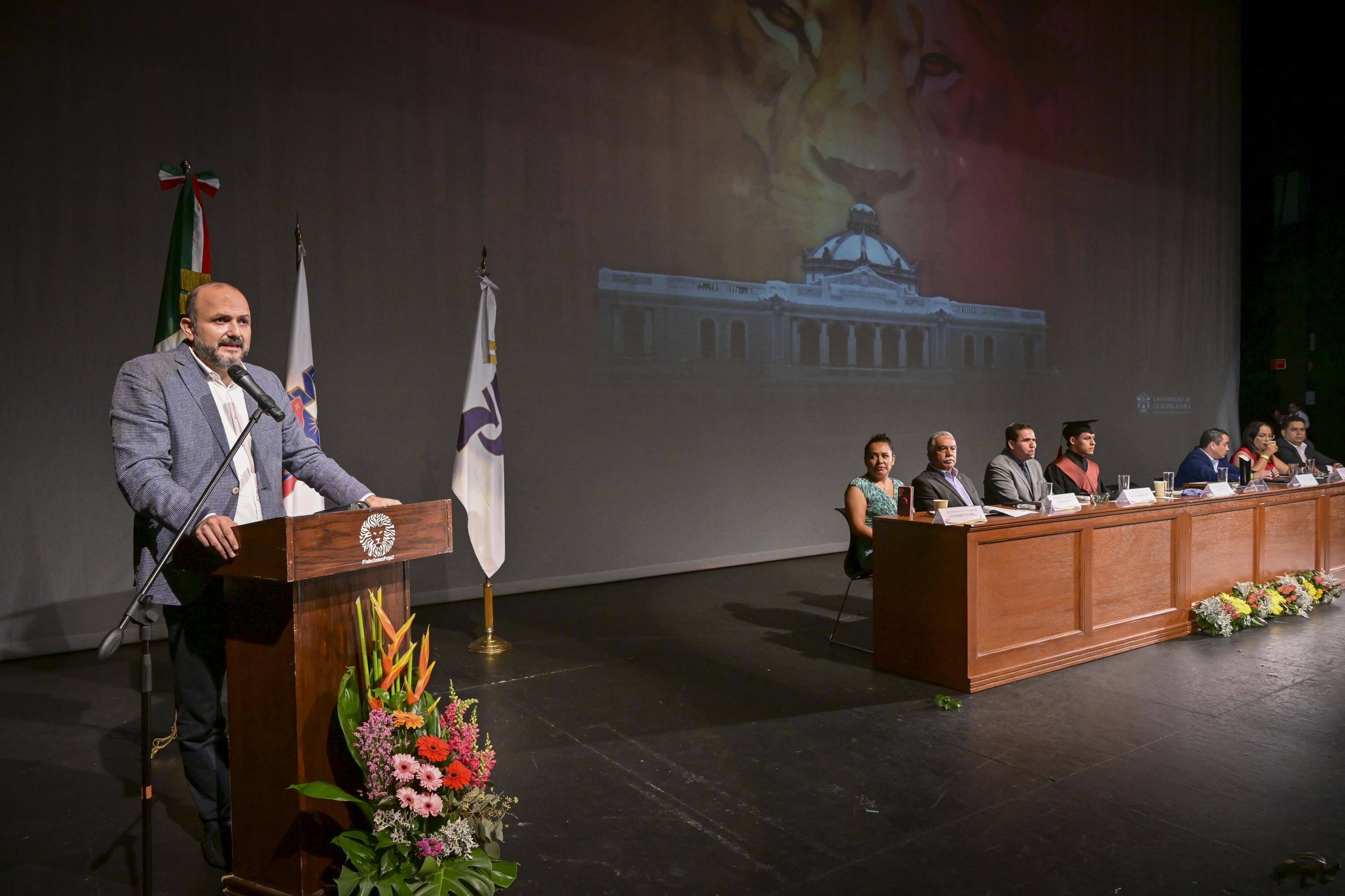 En el acto académico, celebrado en el Teatro Diana, Villanueva Lomelí resaltó que la labor de la universidad es humanizar a la comunidad mediante la docencia con asignaturas como danza, banda de guerra, escolta y arte en general.