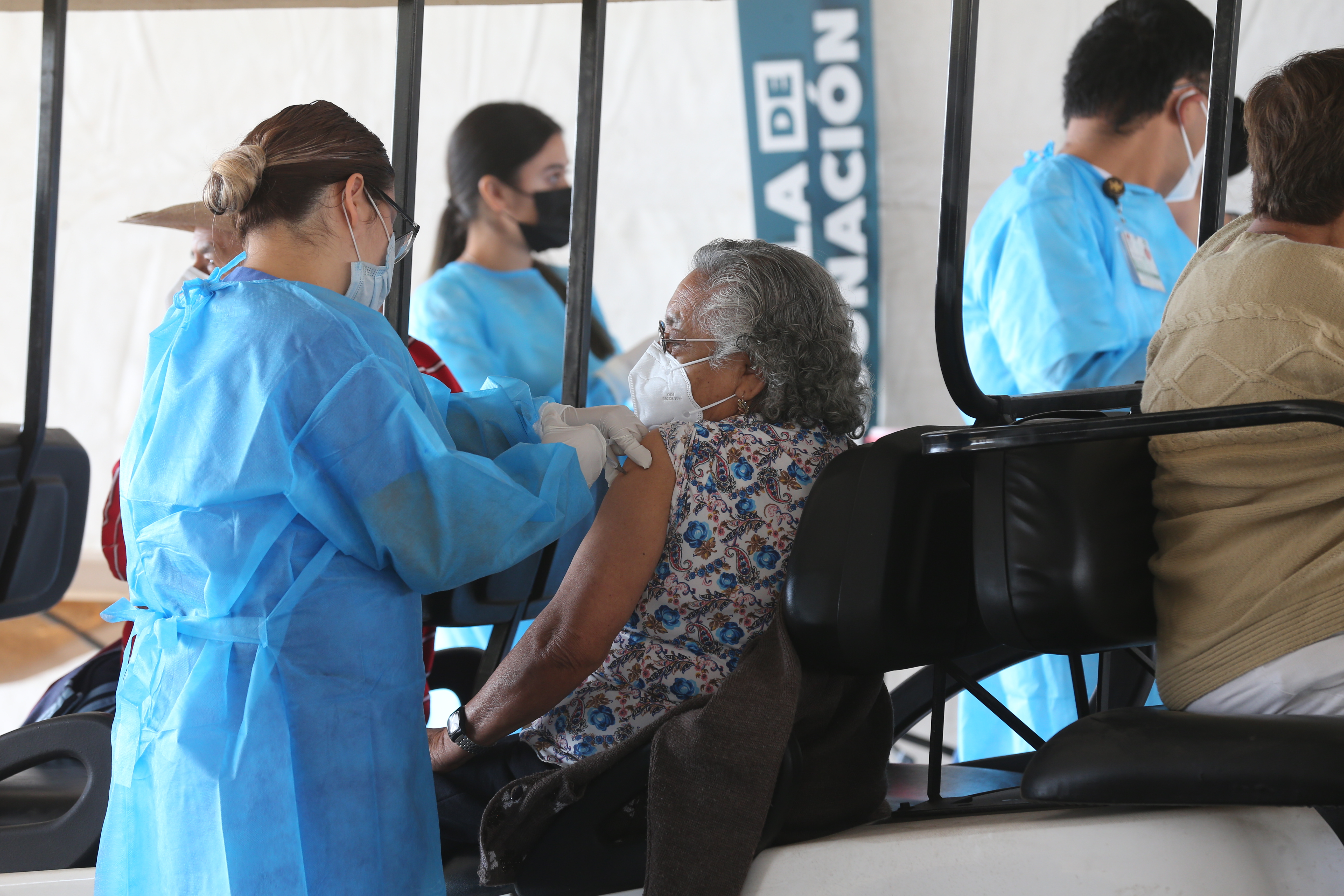 “El servicio que brindamos es el Drive thru –auto servicio–, pero hay personas que están llegando a pie y para eso hemos habilitado cuatro camionetas, cada una para 18 personas, y cinco carros de golf, donde podemos acomodar hasta ocho personas, para aquellos que no tengan vehículo pueden llegar y nosotros los transportamos en el circuito para que no se bajen del vehículo y así puedan recibir su vacuna”, informó Leal Moya.