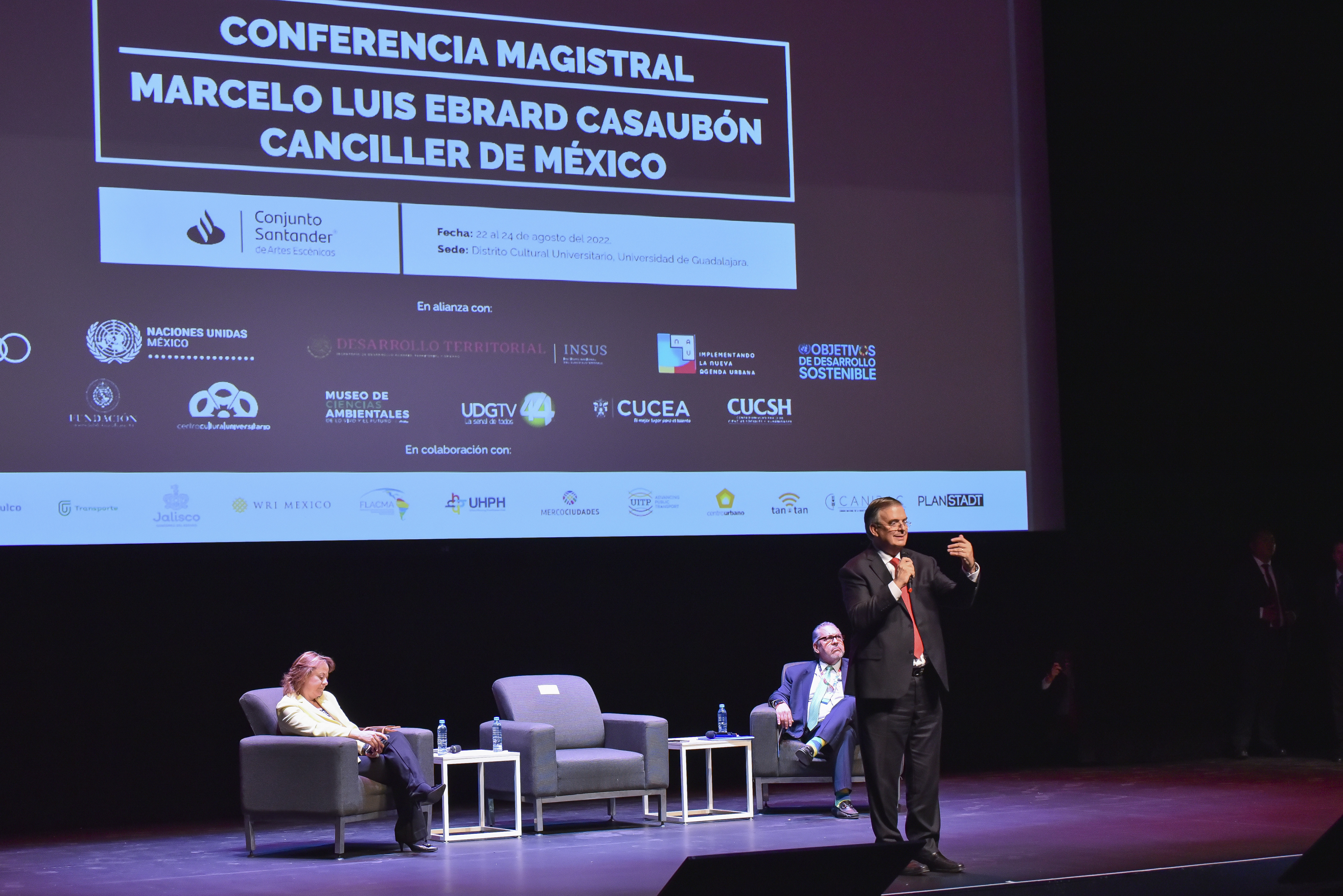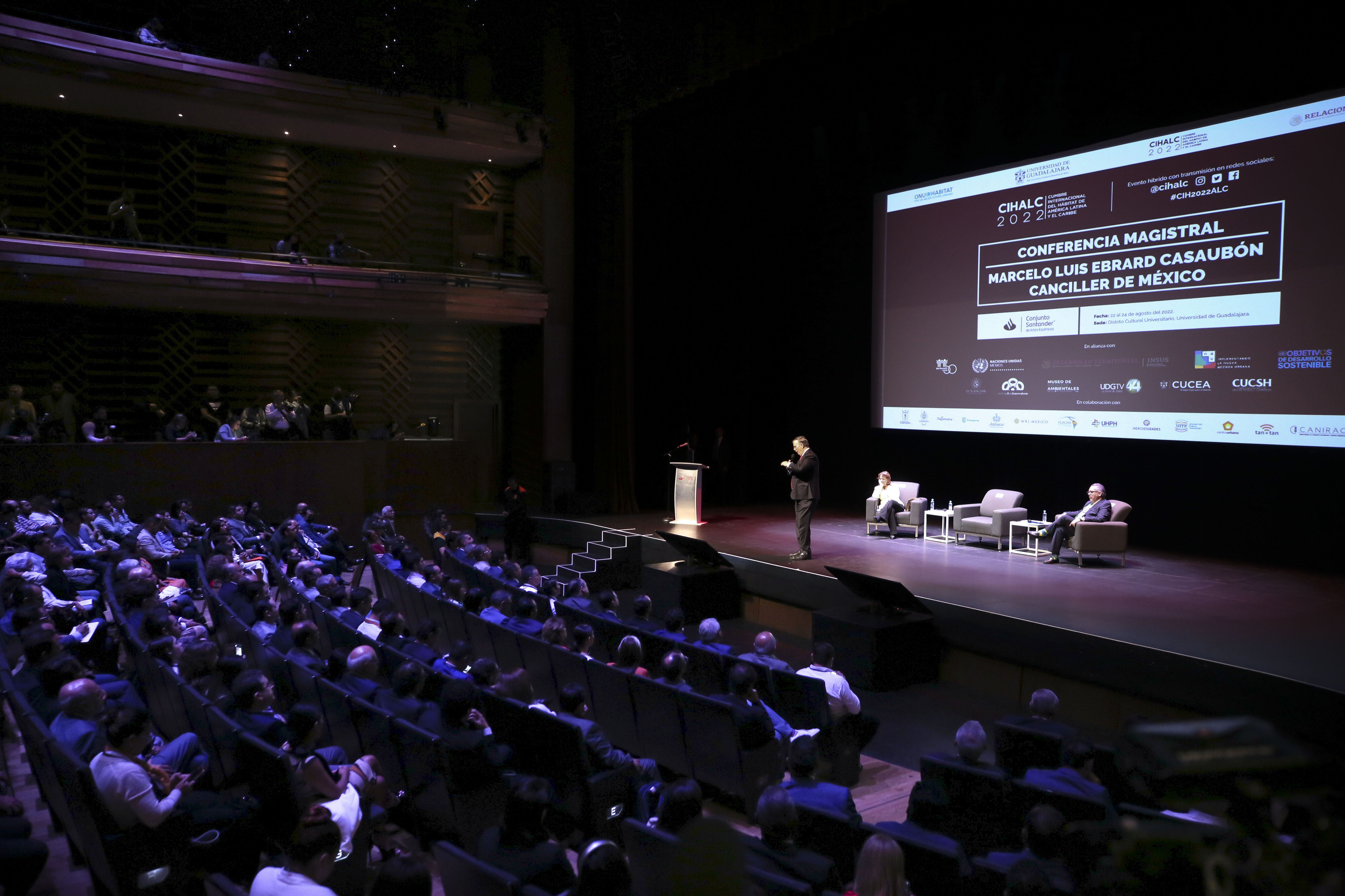 En la sala 2 del Conjunto Santander de Artes Escénicas del CCU, el canciller mexicano subrayó que en esta cumbre dos de las principales orientaciones de política exterior fueron la dimensión urbana, el diseño de ciudades que vendrán y que son muy disímbolas en América Latina y El Caribe, respecto a lo que va a ocurrir en Asia, cuya velocidad de urbanización no tiene precedente.