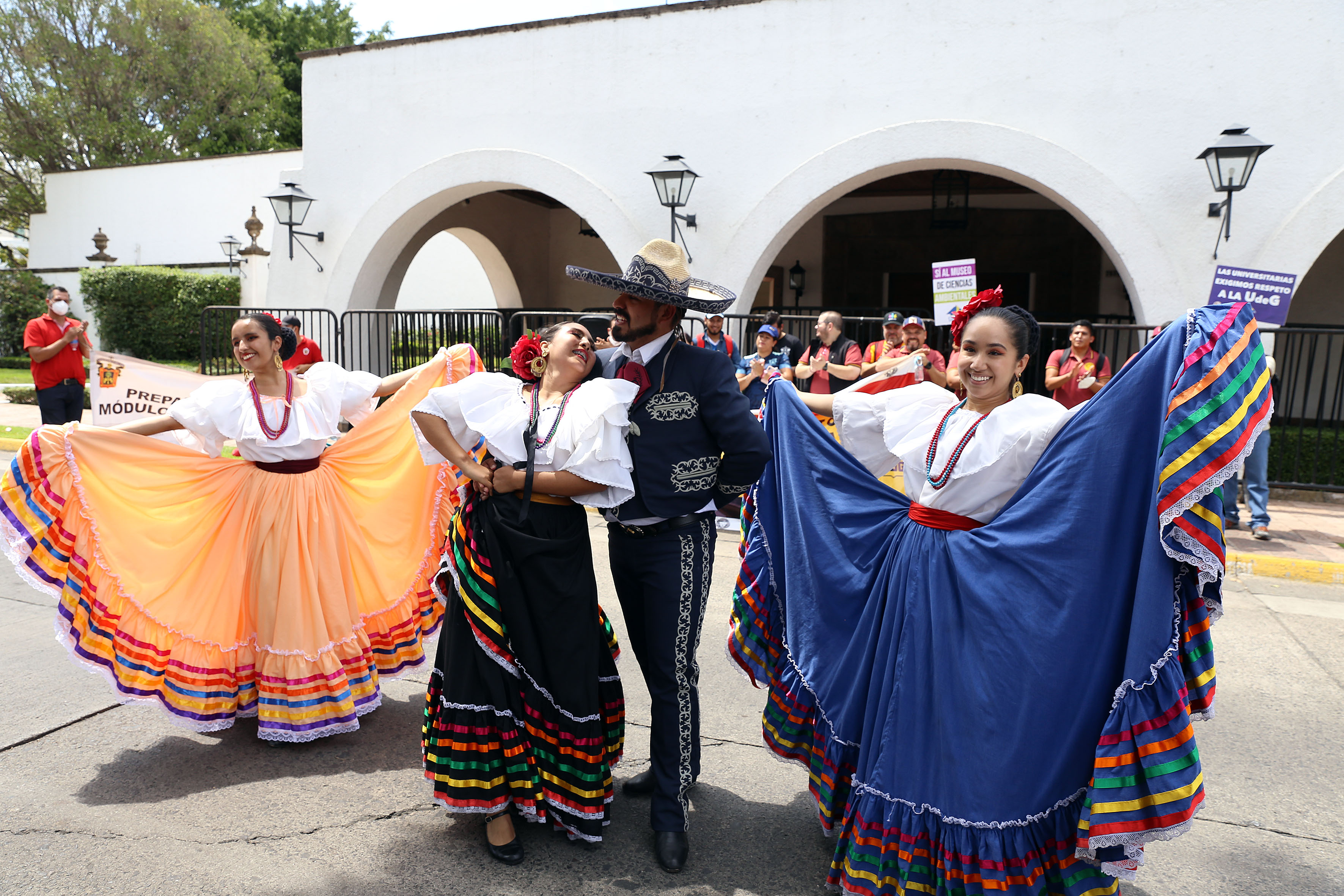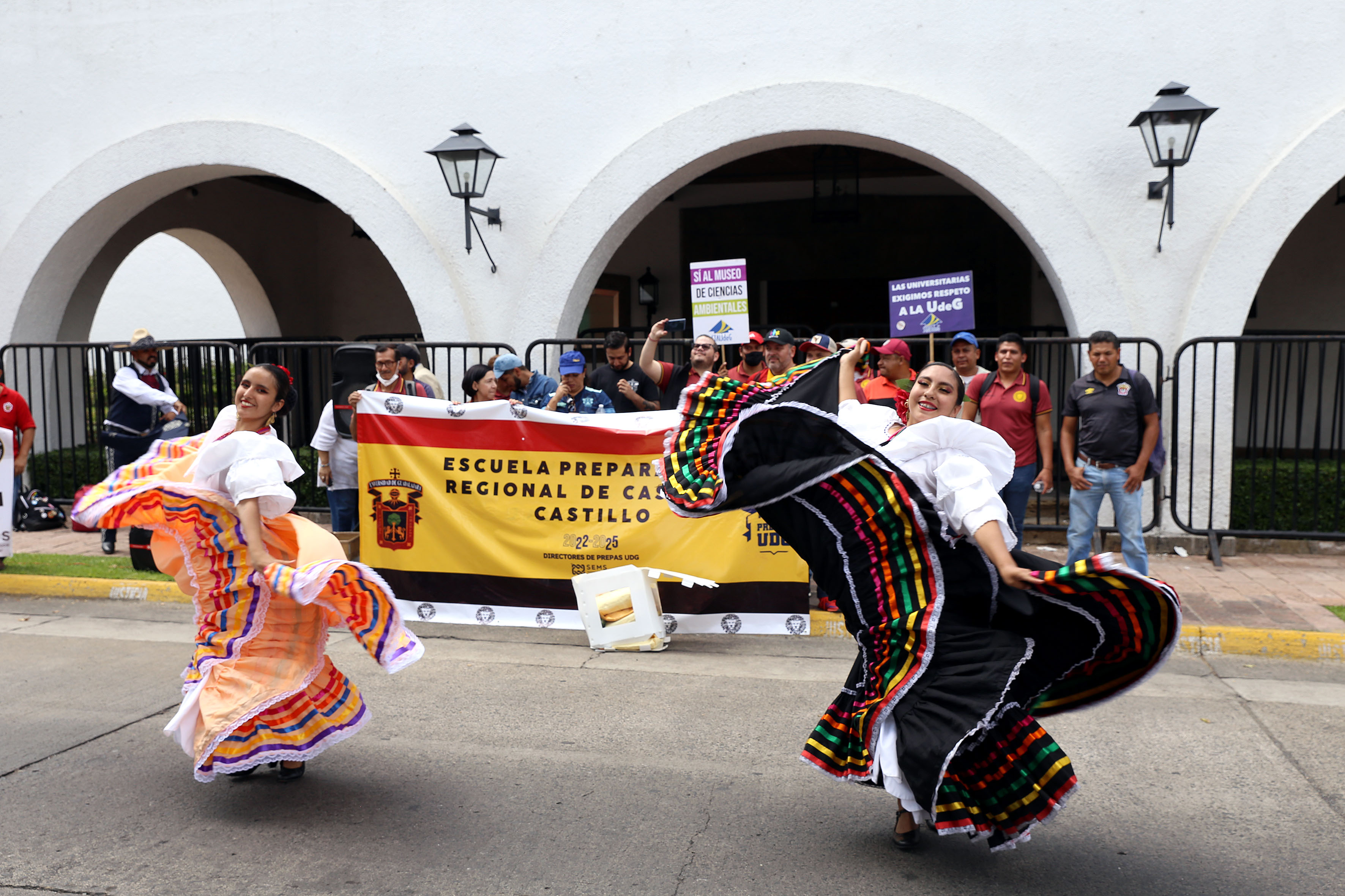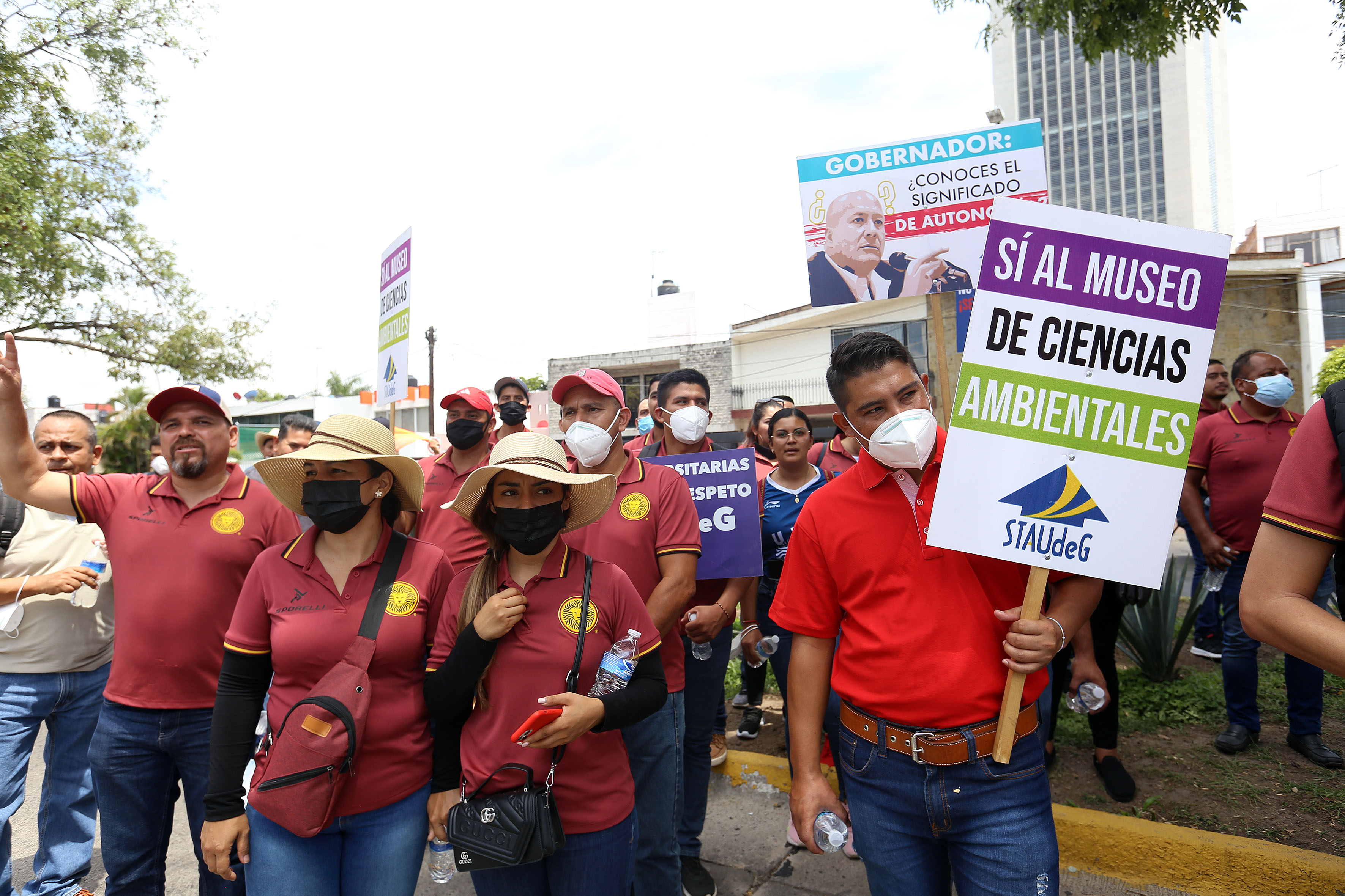 A las afueras de Casa Jalisco, estudiantes y personal gritaron consignas en favor del Museo de Ciencias Ambientales (MCA), cuya construcción se ve frenada por el recorte de 140 millones de pesos ya presupuestados y avalados por el Congreso del Estado.