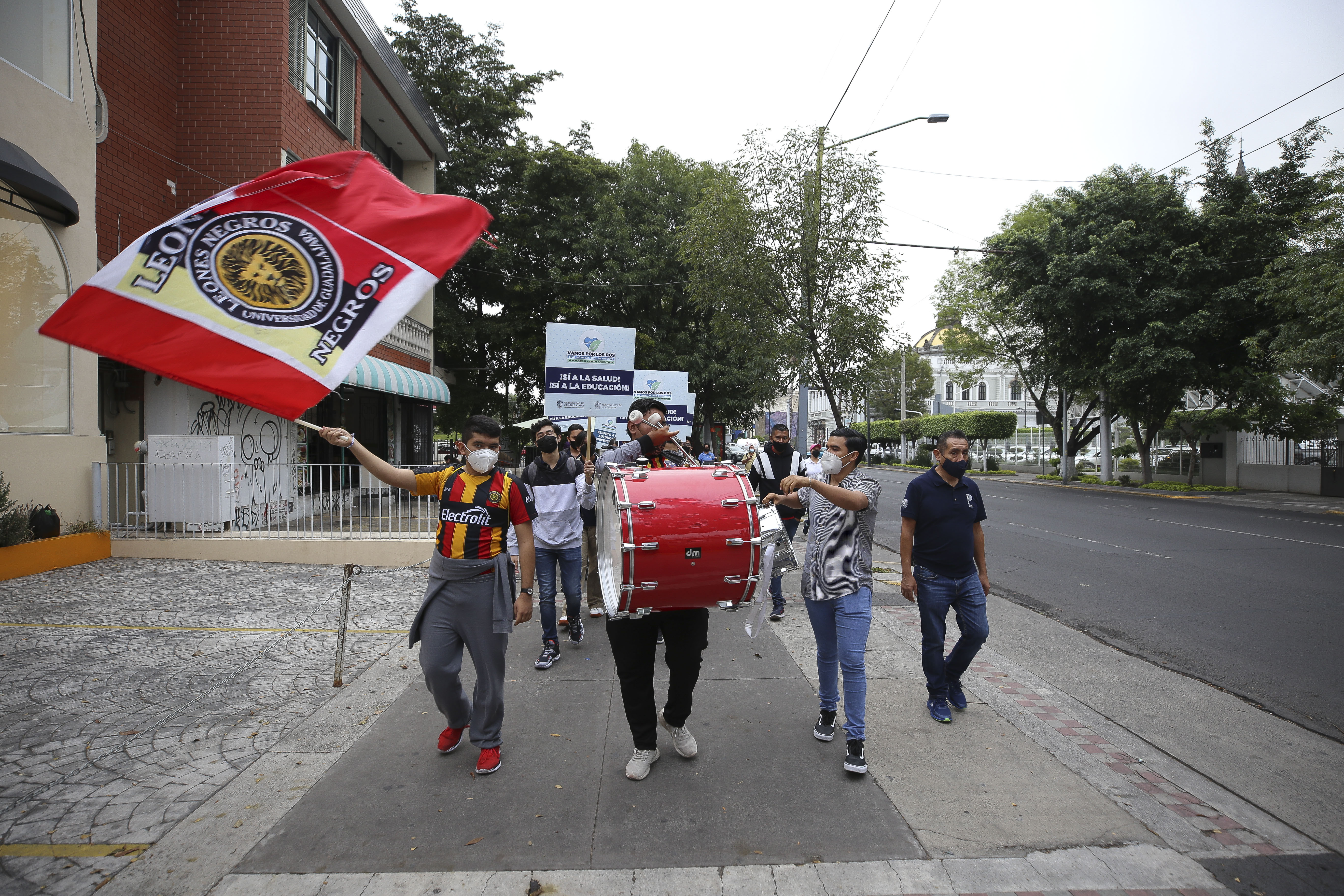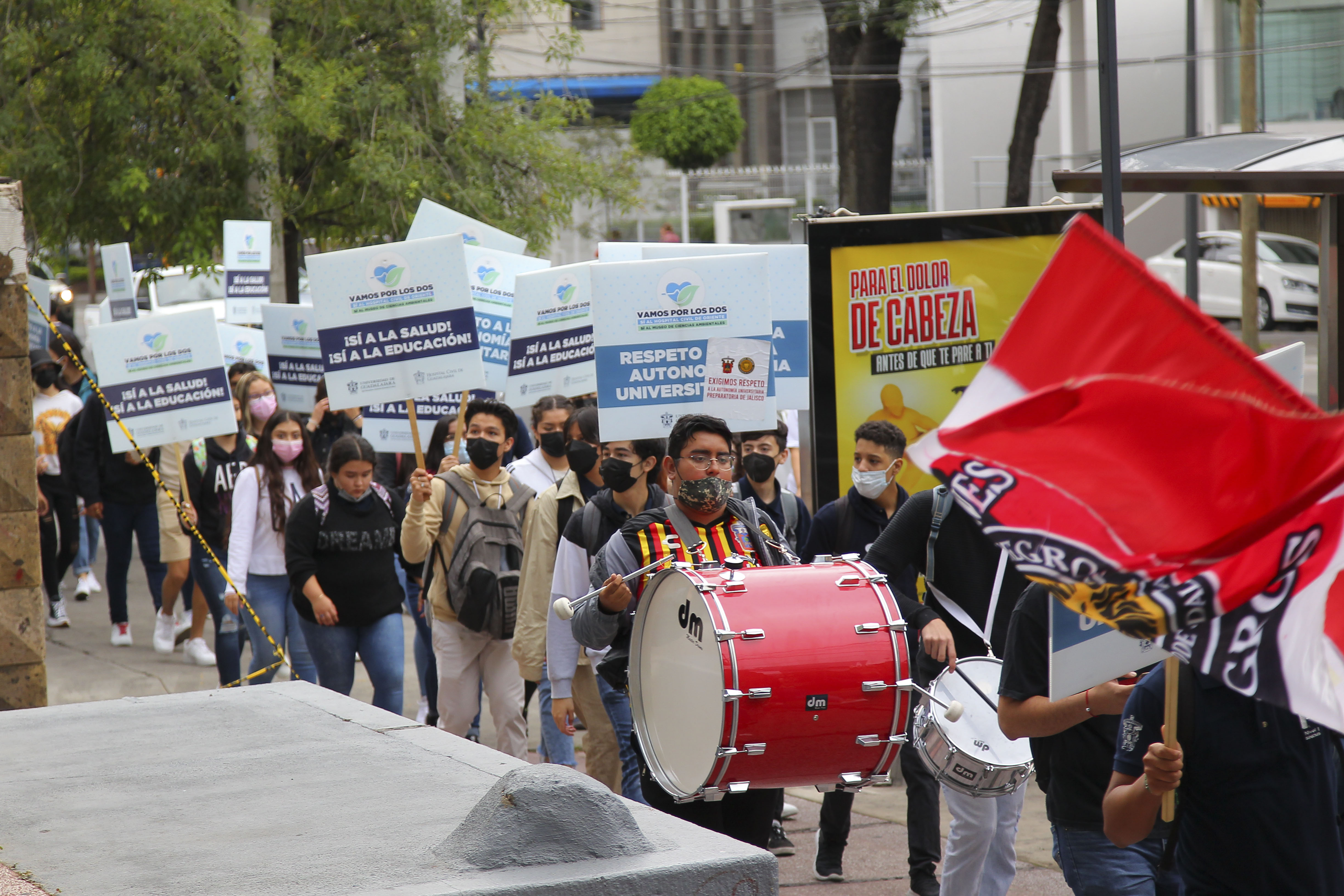 El ruido de los tambores y güiros no se hicieron esperar. Los marchantes hacían altos constantes y aprovechaban para tocar piezas de vallenato y bailar. Las consignas gritadas a todo pulmón fueron frecuentes: “¡Alfaro, Alfaro, hoy te recordamos, de Prepa 5 eres egresado!” “¡Somos Prepa 5 y vamos por los dos: sí al museo, sí al hospital!”.