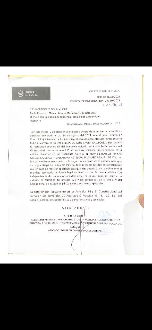 Dio a conocer que la diligencia, llevada a través de una denuncia penal, fue promovida presuntamente por Hoteles Rivera Deluxe, que se dice legítimo propietario; sin embargo, la zona que estaba ocupada, según el mapa del fideicomiso del predio, pertenece al gobierno de Guadalajara y no a la empresa.