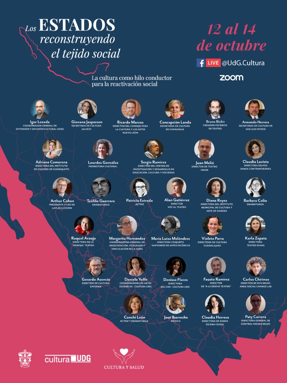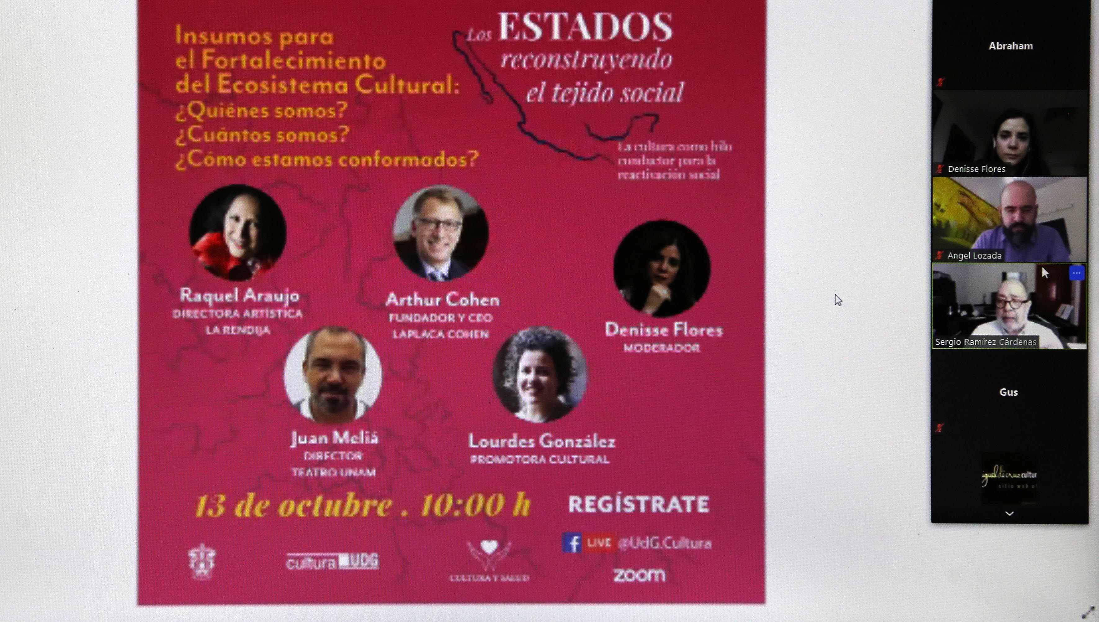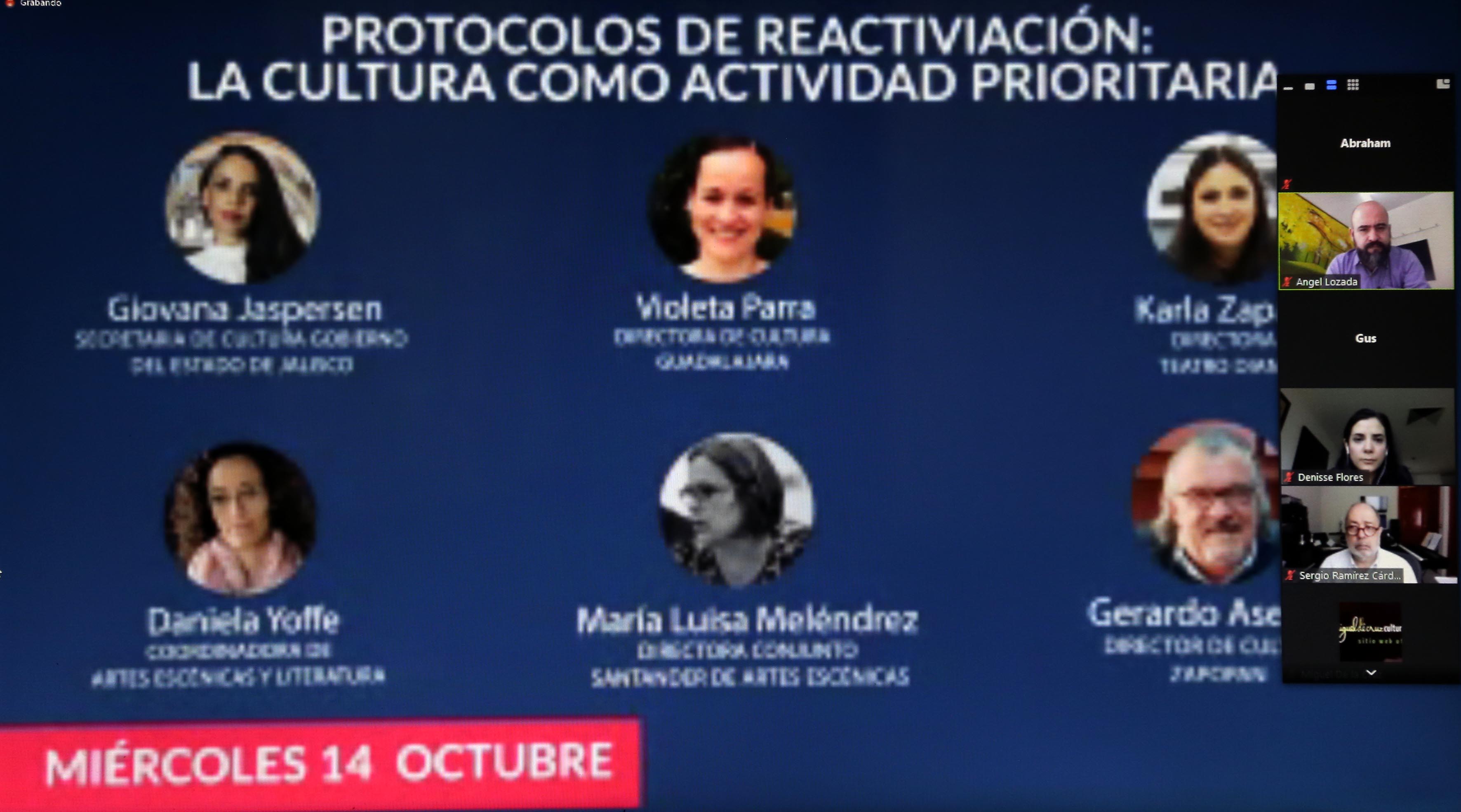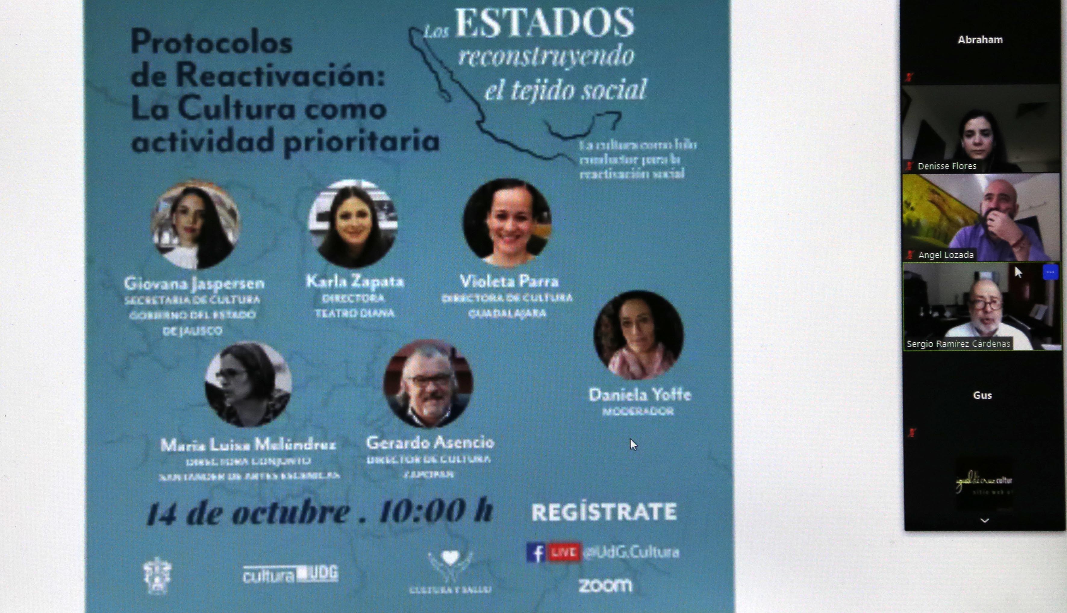 - “Protocolos de reactivación: la cultura como actividad prioritaria”, 14 de octubre, 10:00 horas. Cómo se debería implementar la vuelta a escena de las distintas industrias creativas. Ponentes de distintas instancias culturales de Jalisco.