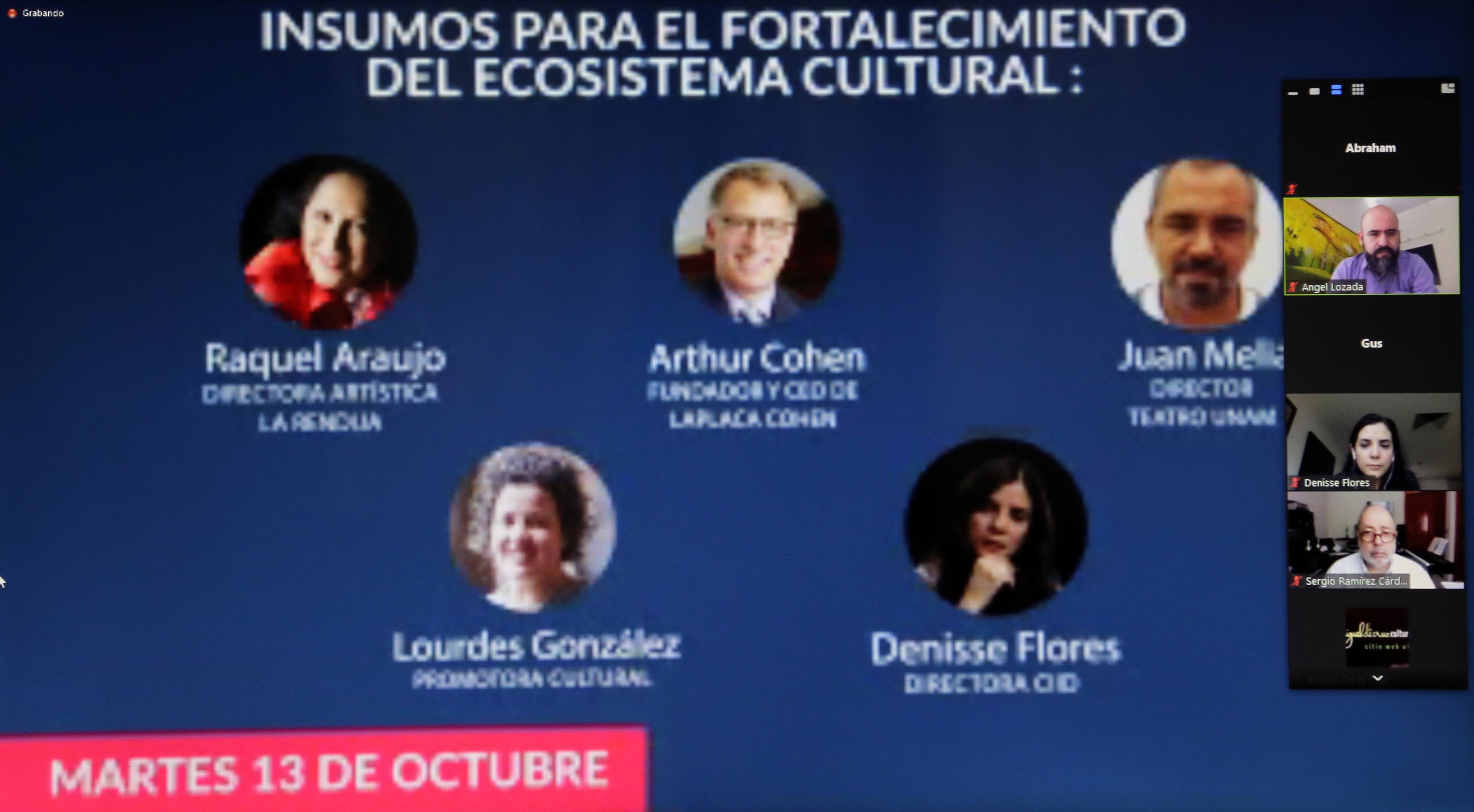 - “Insumos para el fortalecimiento del ecosistema cultural. ¿Quiénes somos, cuántos somos y cómo estamos conformados?”, 13 de octubre, 10:00 horas. El fin es identificar el contexto que viven los artistas en México. Ponentes de Yucatán, Nueva York, Ciudad de México y Guanajuato.