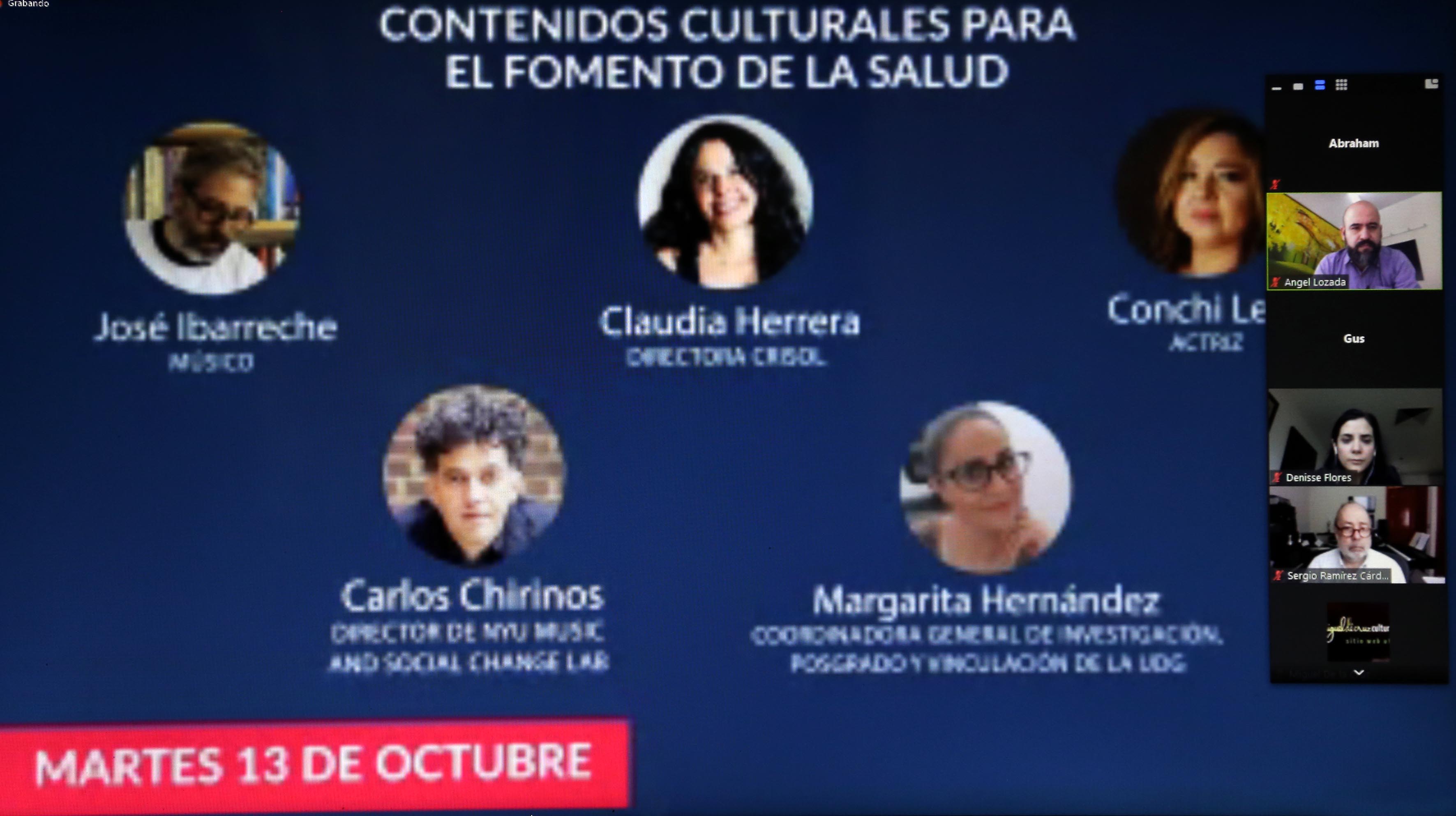 - “Contenidos culturales para el fomento a la salud”, 13 de octubre, 17:00 horas. Enfocado en la creación de proyectos encaminados al bienestar de las audiencias. Ponentes de Ciudad de México, Jalisco, Yucatán y Nueva York.