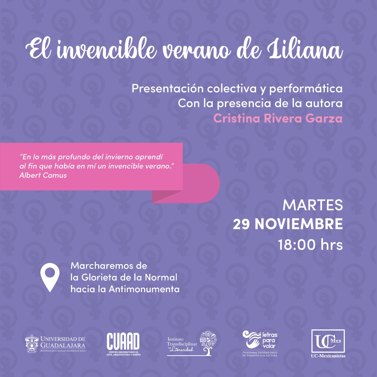 A las 18:00 horas de este martes 29 de noviembre habrá una presentación colectiva y performática del libro El invencible verano de Liliana, de Cristina Rivera Garza, con la presencia de la autora; esto tendrá lugar en la Antimonumenta, en el Centro Histórico de Guadalajara.