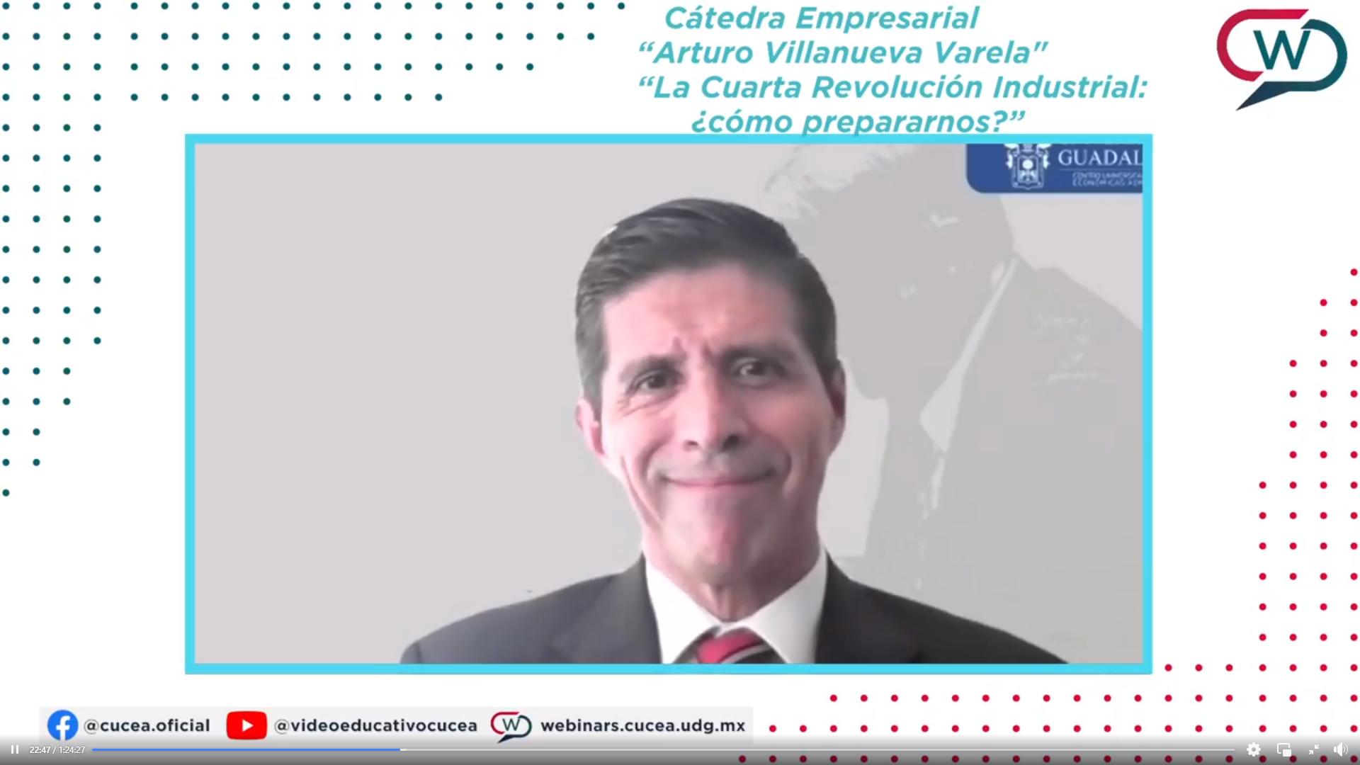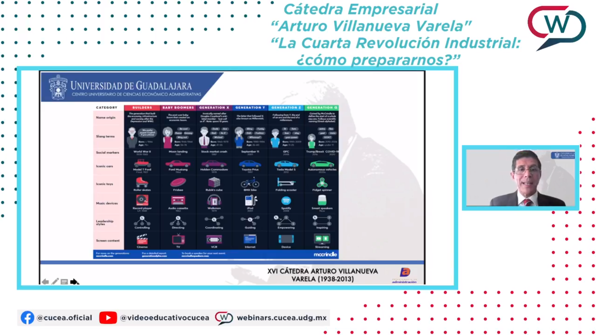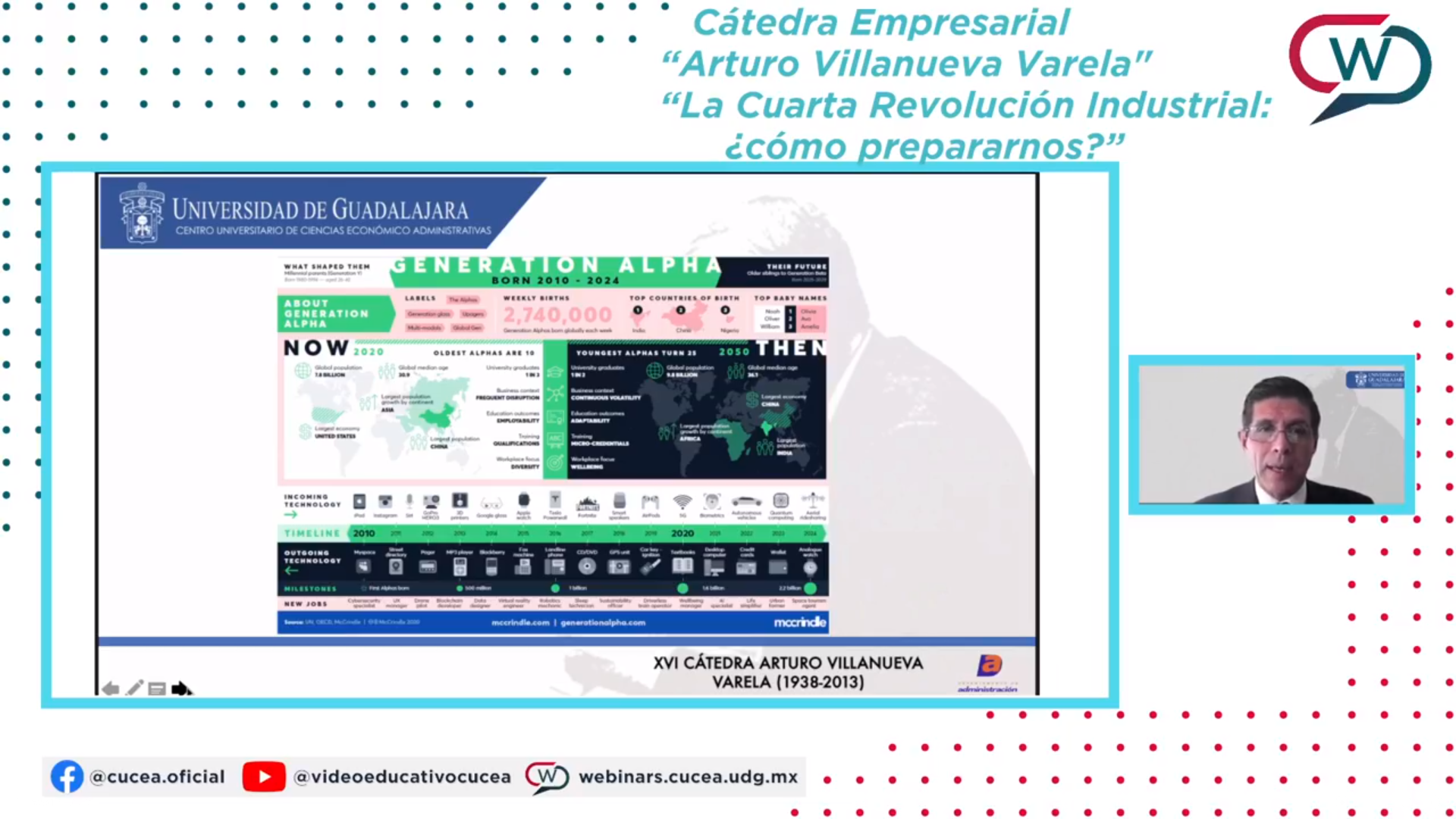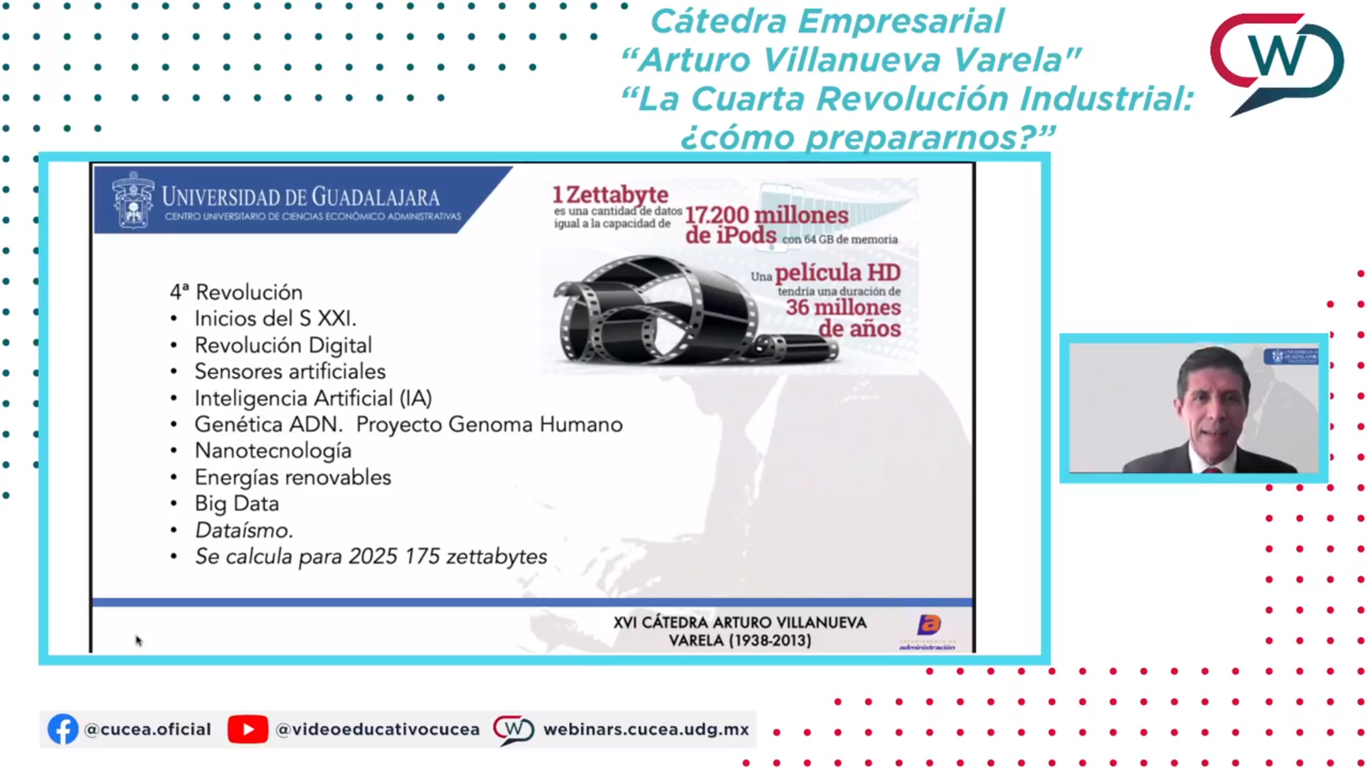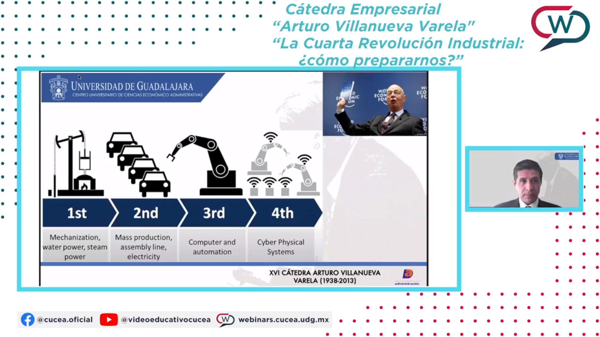 en el marco de la Cátedra en Ciencias de la Administración “Arturo Villanueva Varela”, del Centro Universitario de Ciencias Económico Administrativas (CUCEA) de la UdeG, donde expresó que la Cuarta Revolución Industrial nos está retando a generar capacidades nuevas y productivas, además de solucionar problemas cada vez más complejos.