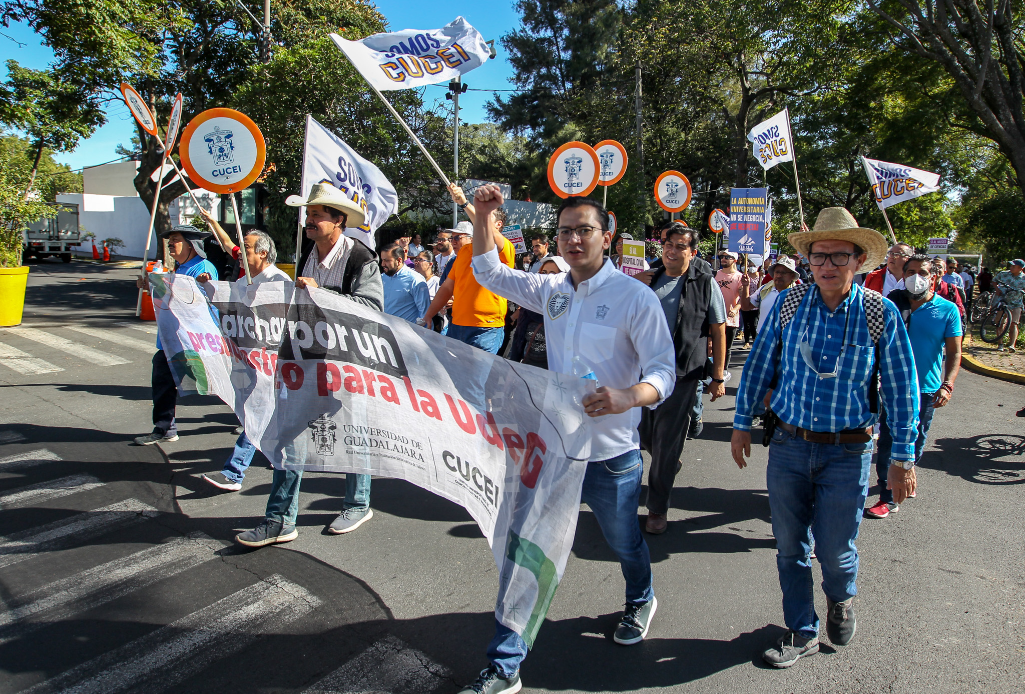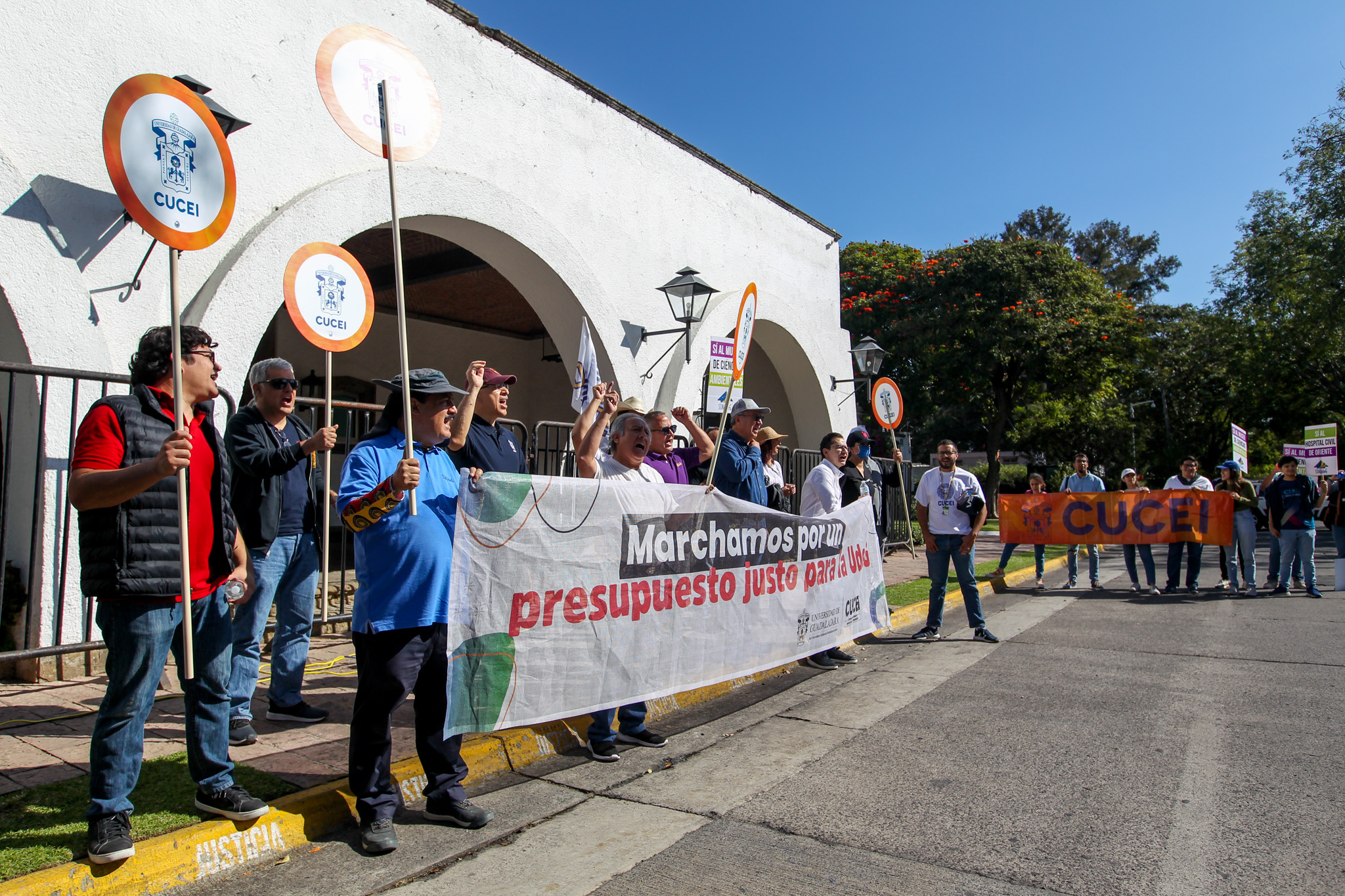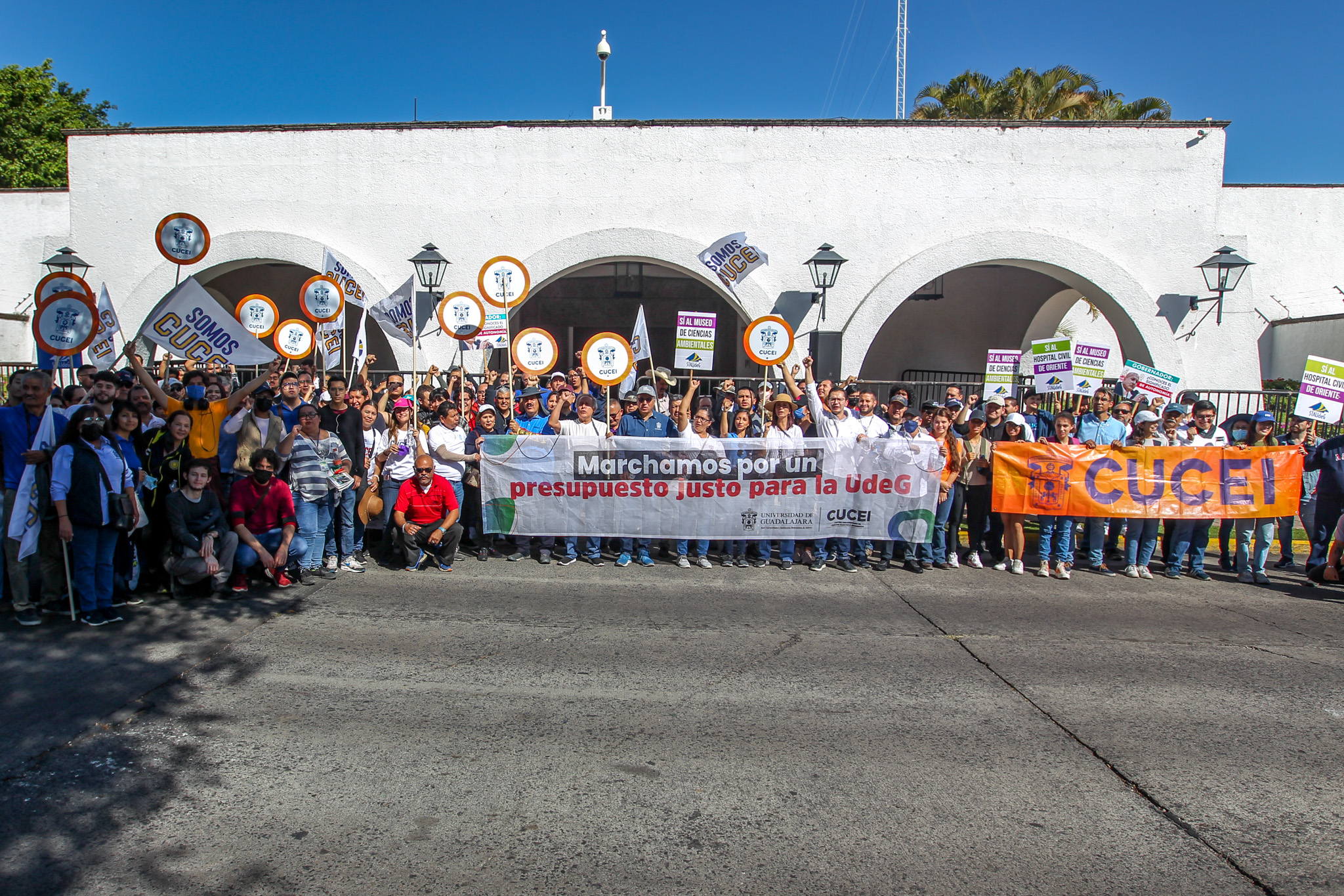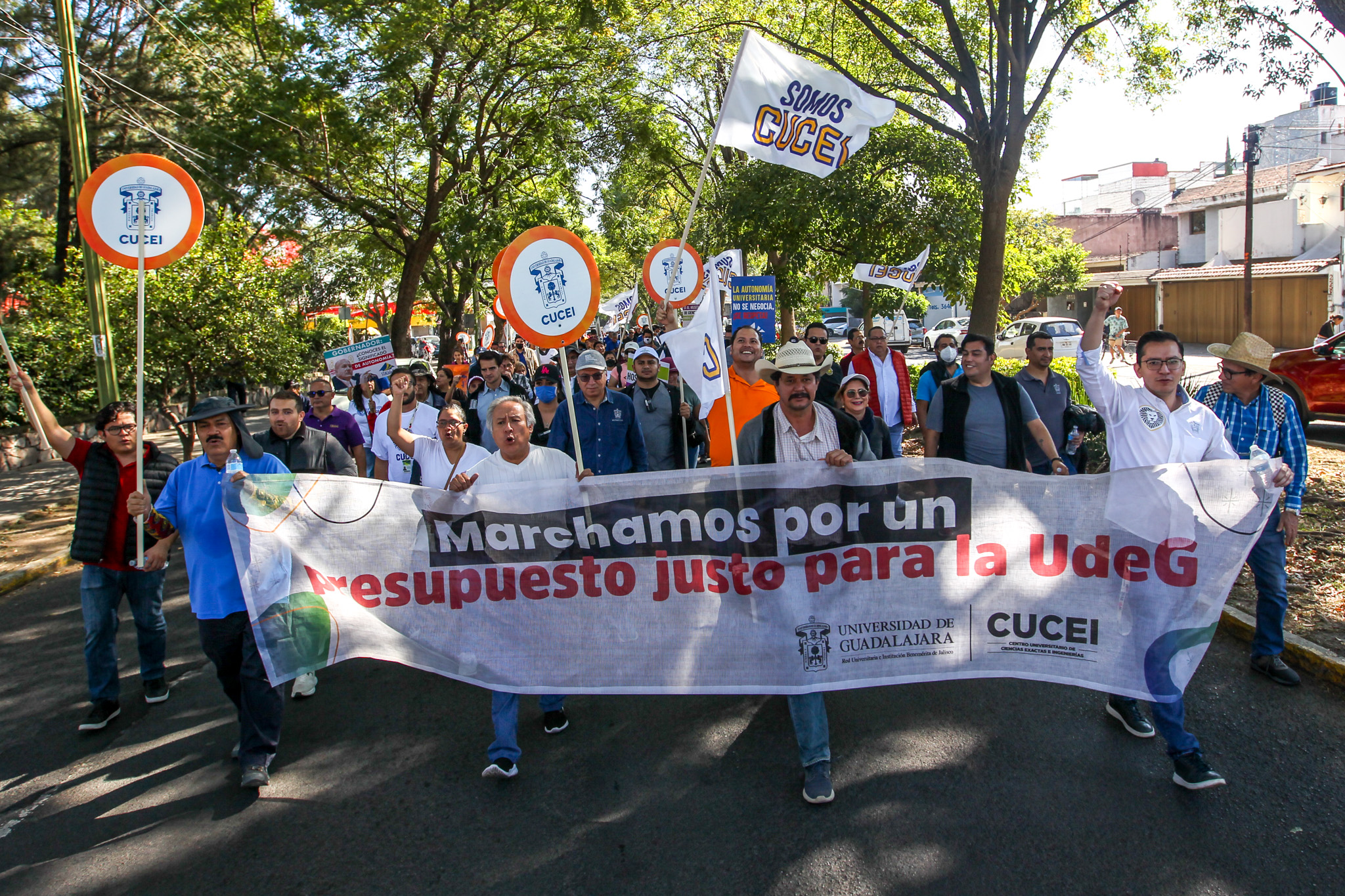Con la consigna “El profe, marchando, también está educando”, decenas de miembros de la comunidad del Centro Universitario de Ciencias Exactas e Ingenierías (CUCEI) acudieron a Casa Jalisco para exigir que el Gobernador de Jalisco garantice un presupuesto digno y justo para esta Casa de Estudio.