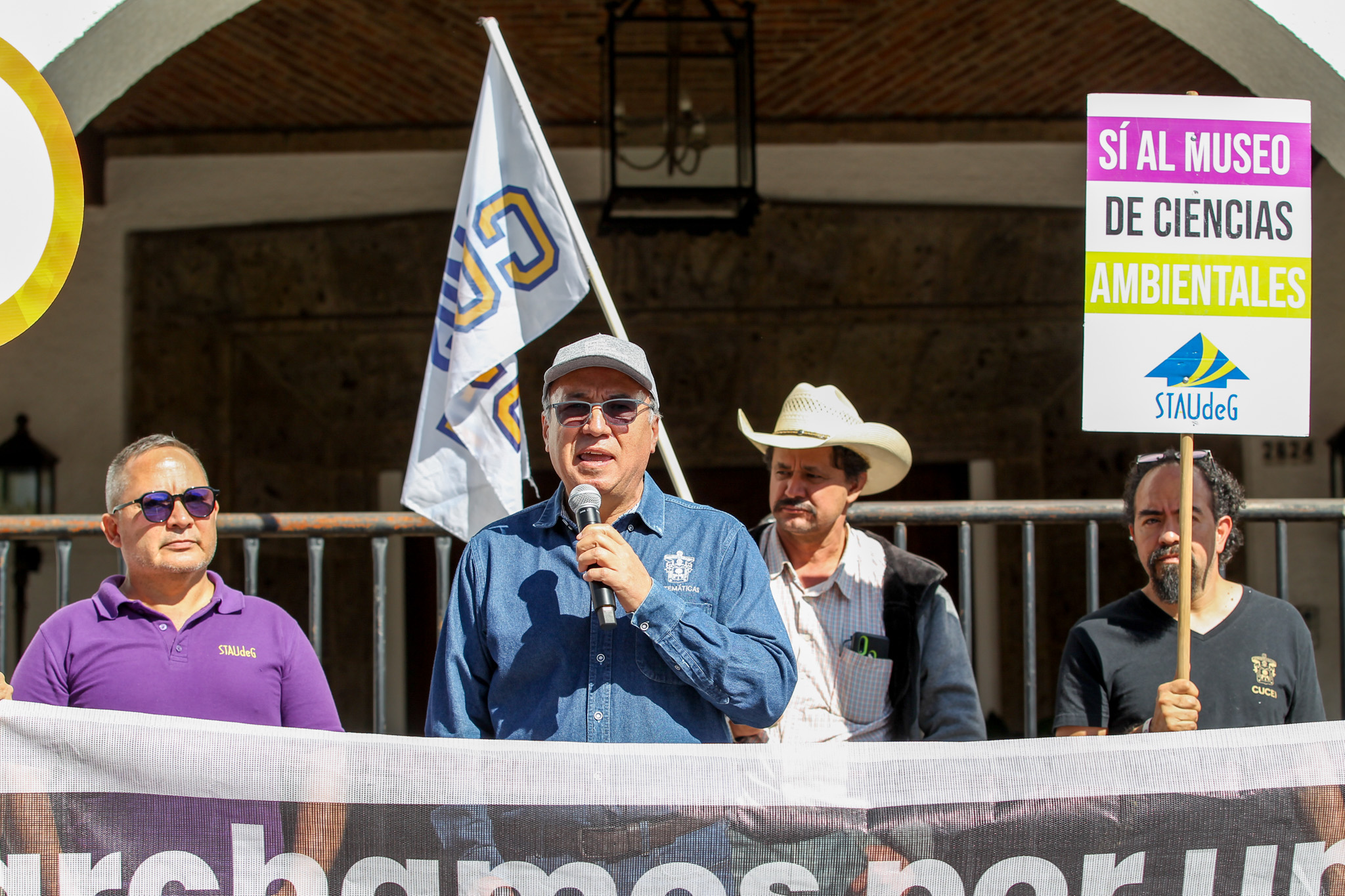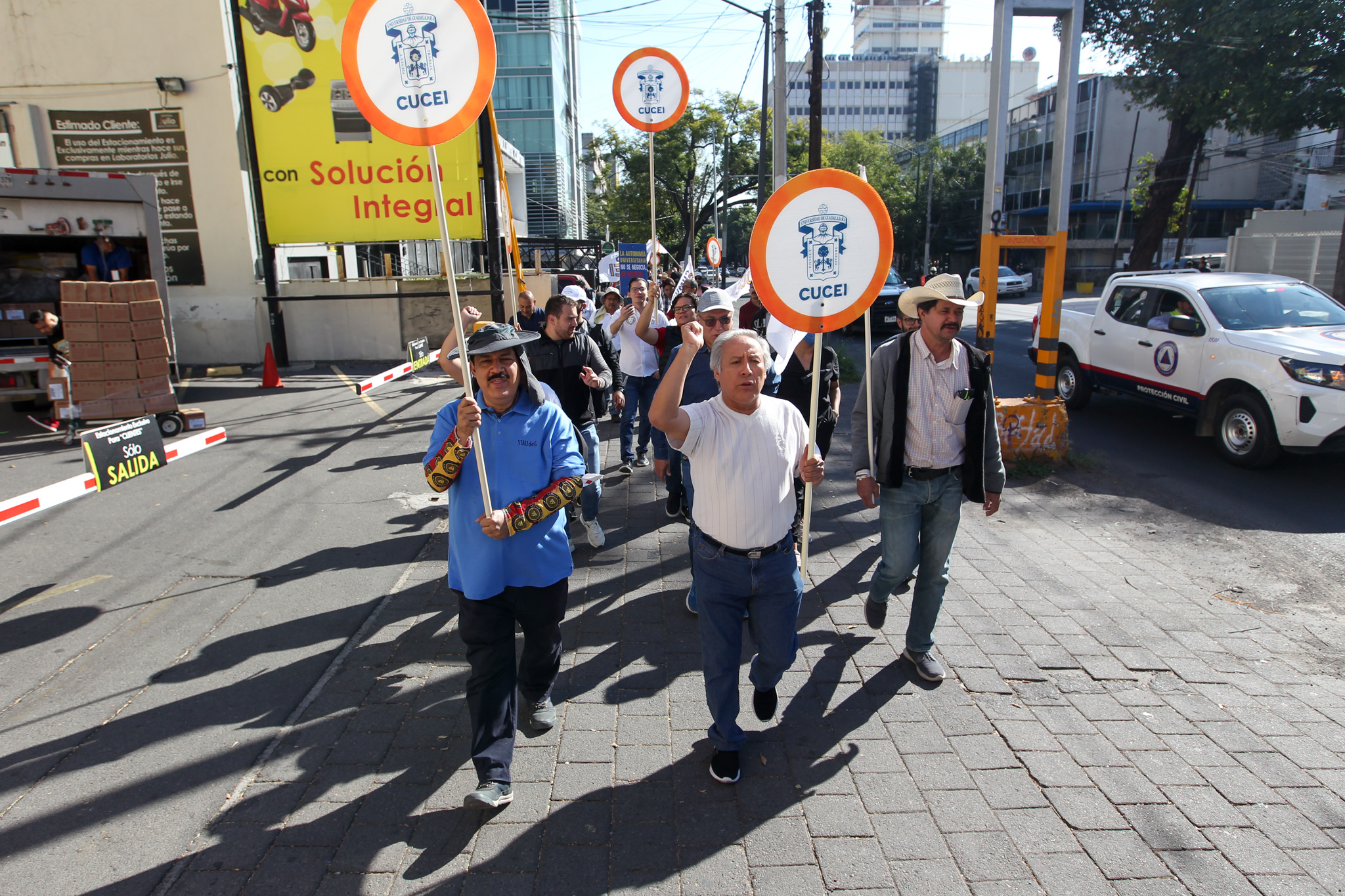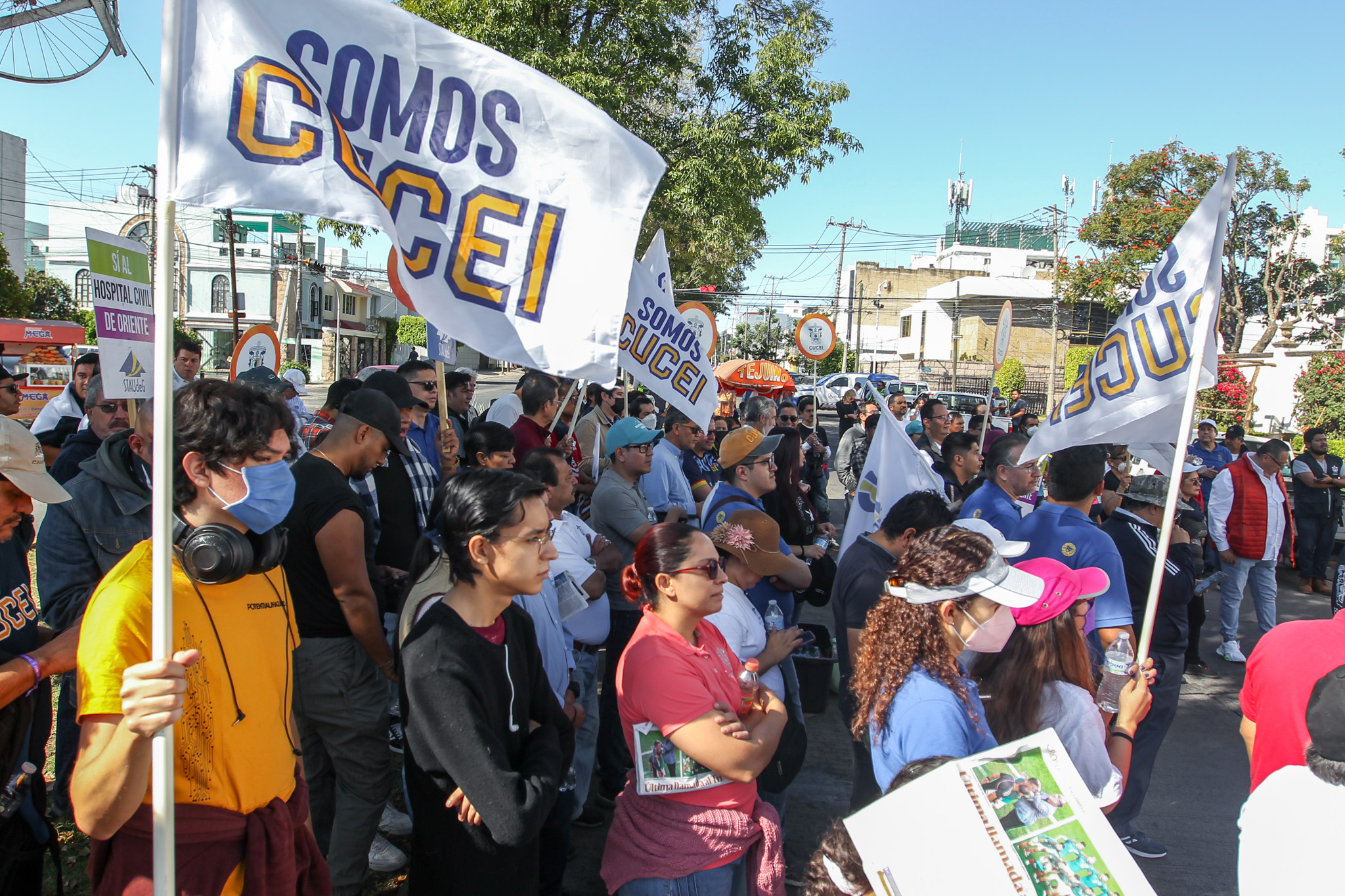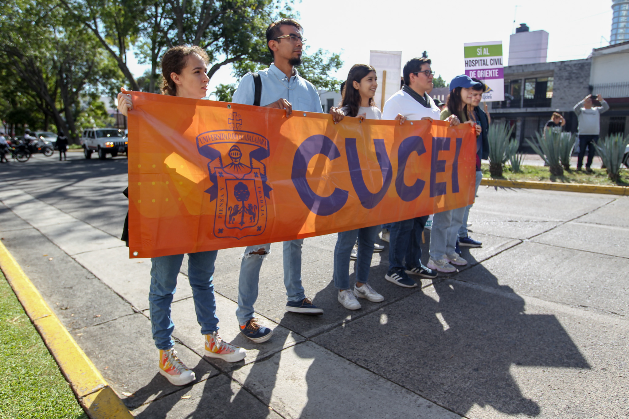 Con la consigna “El profe, marchando, también está educando”, decenas de miembros de la comunidad del Centro Universitario de Ciencias Exactas e Ingenierías (CUCEI) acudieron a Casa Jalisco para exigir que el Gobernador de Jalisco garantice un presupuesto digno y justo para esta Casa de Estudio.