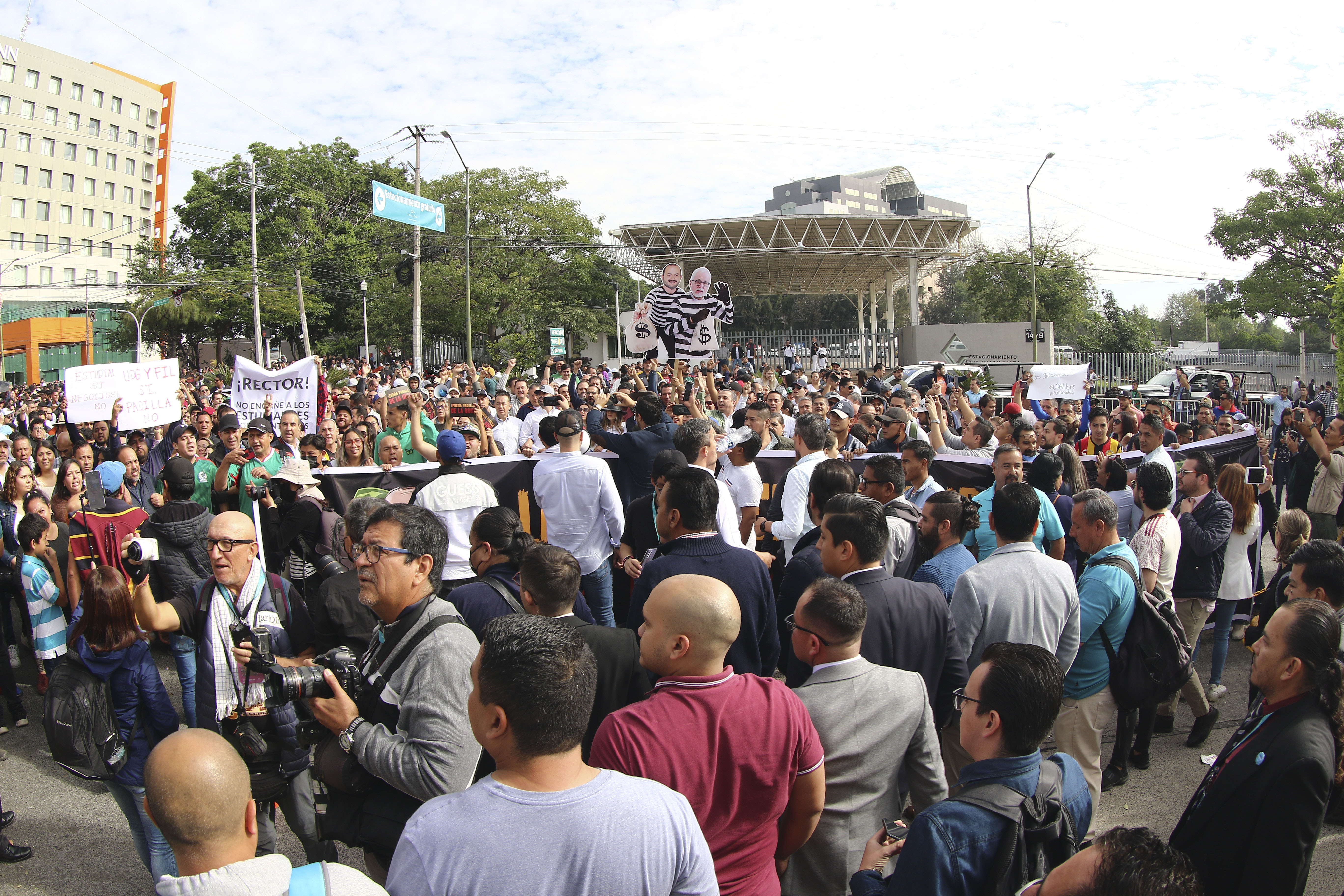 Desde ese punto avanzaron a la explanada de la Expo Guadalajara donde esperaban los miembros del Sindicato de Trabajadores Académicos de la UdeG (STAUdeG) encabezados por el licenciado Jesus Palafox Yáñez con una valla humana.