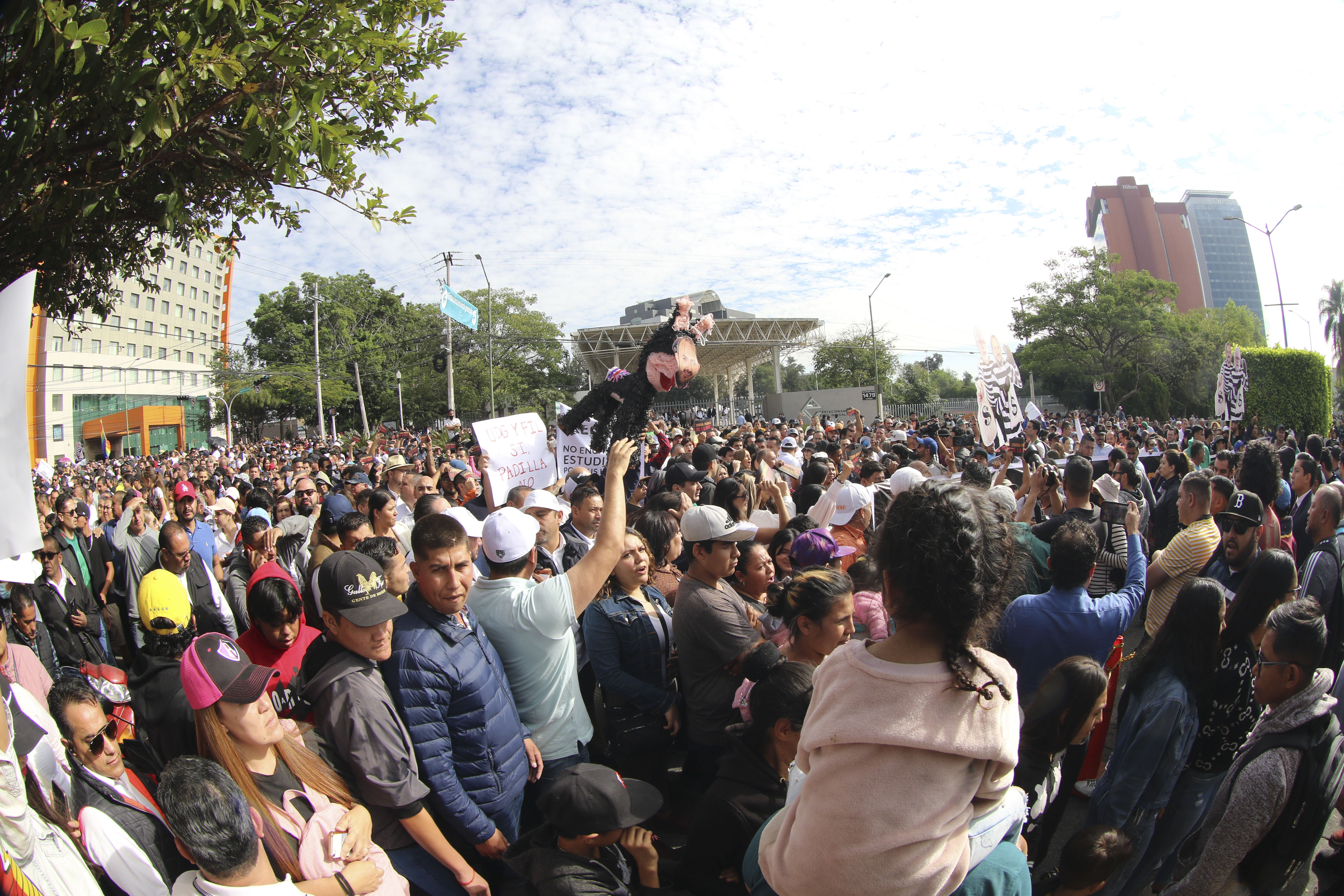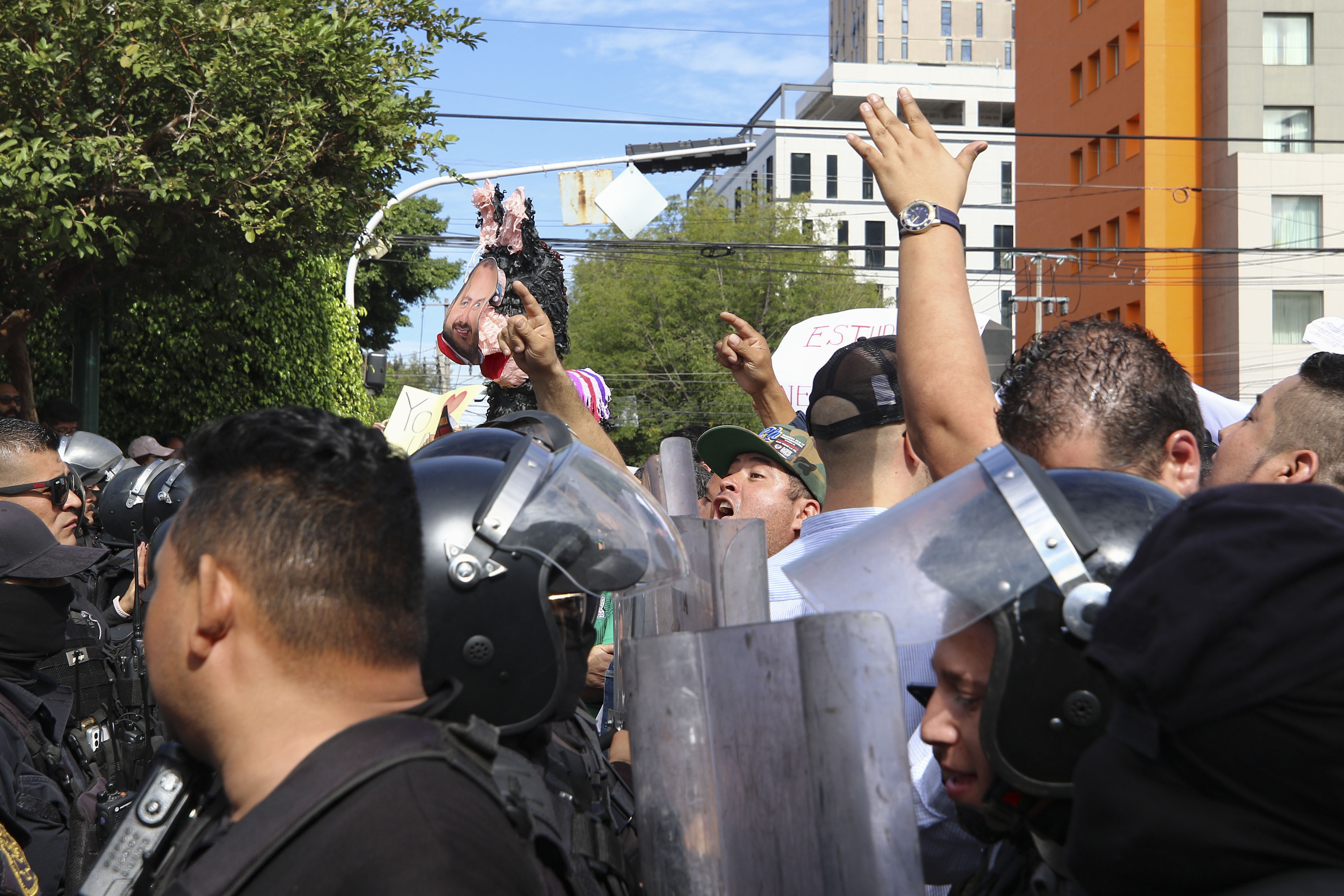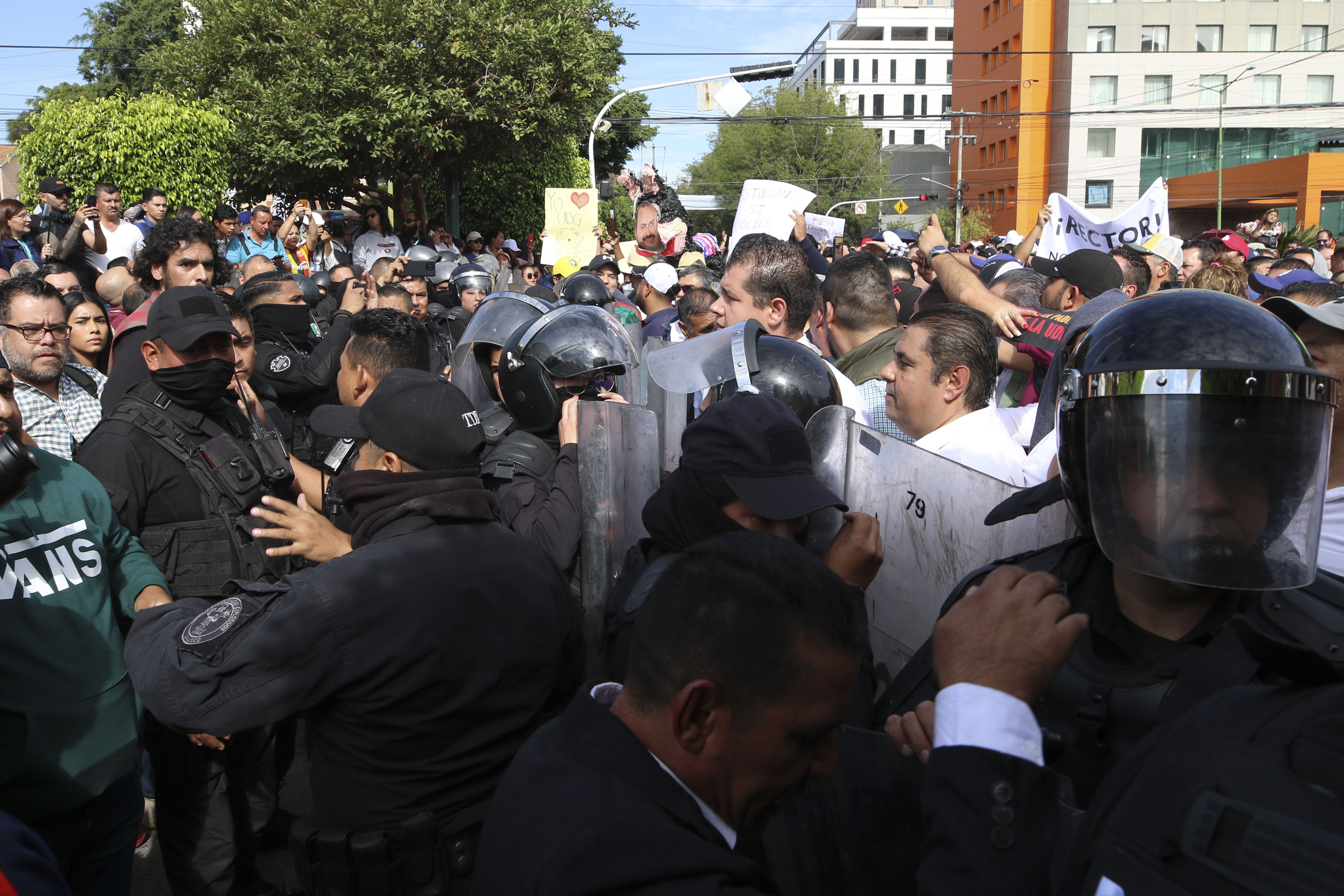 Una célula de manifestantes, alrededor de 200, intentaron ingresar a la fuerza. Los lideraba el legislador Gerardo Quirino Velázquez Chávez, el dirigente de Movimiento Ciudadano en Jalisco; José Manuel Romo Parra, entre otros funcionarios del Gobierno del Estado y del Ayuntamiento de Guadalajara. El intento lo frustraron los antimotines.