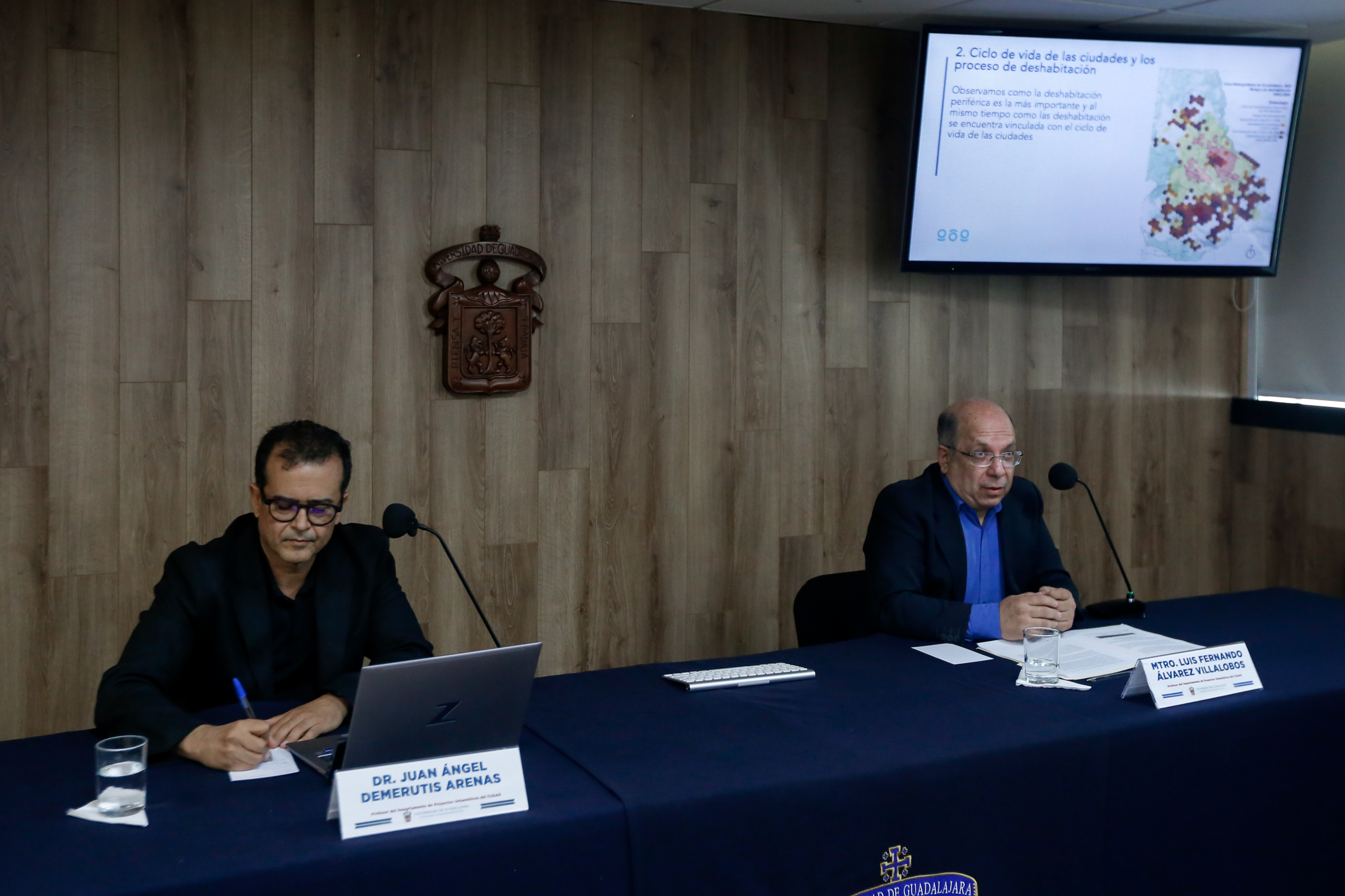 El doctor Juan Ángel Demerutis Arenas, responsable técnico del Proyecto de Investigación y el maestro Luis Fernando Álvarez Villalobos, investigador del Departamento de Proyectos Urbanísticos del Centro Universitario de Arte, Arquitectura y Diseño (CUAAD) de la UdeG, presentaron los resultados de una extensa investigación en torno a la deshabitación de vivienda en la ciudades mexicanas, con énfasis en municipios del Área Metropolitana de Guadalajara (AMG). Dicha investigación busca incidir en las políticas públicas y proponer la subutilización de las viviendas.