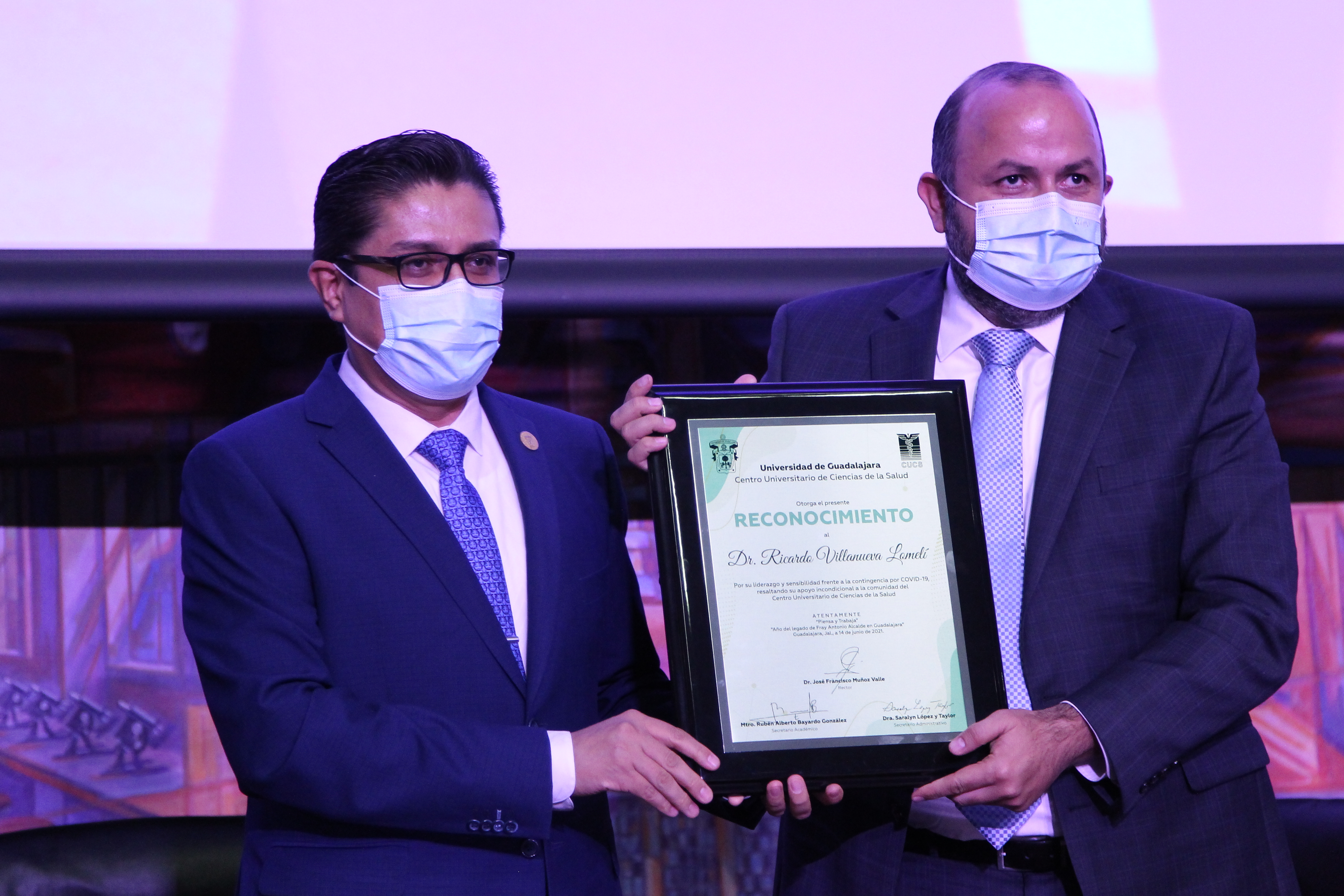El Rector General de la UdeG, doctor Ricardo Villanueva Lomelí, quien recibió un reconocimiento por parte del centro universitario, por su liderazgo y acciones ante la pandemia por COVID-19, destacó la labor de la comunidad de este centro en el combate a la pandemia.