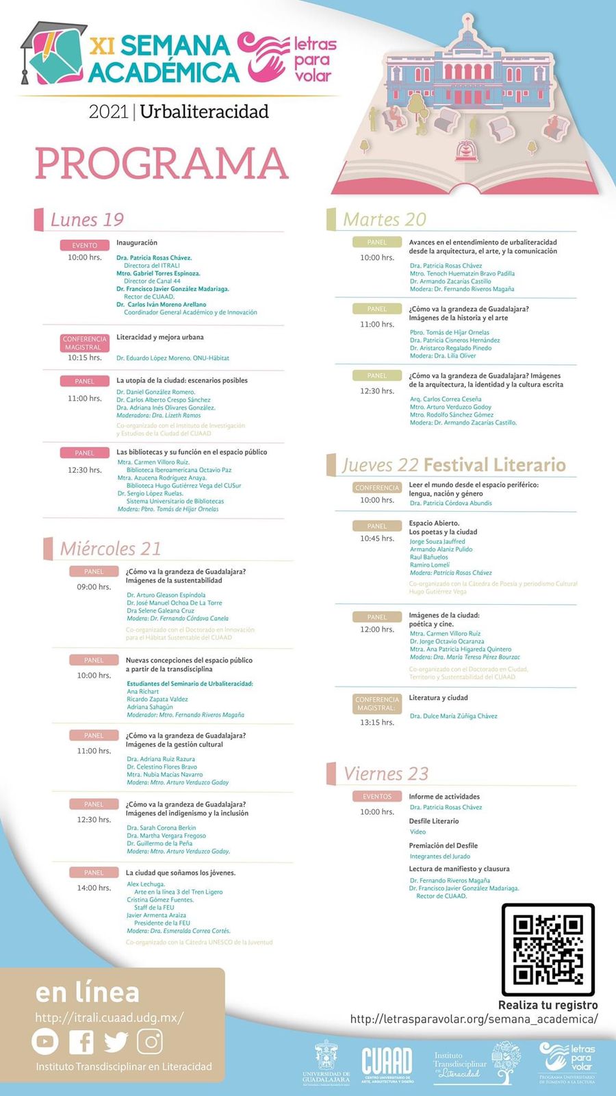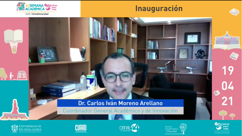 El Rector del CUAAD, doctor Francisco Javier González Madariaga, mencionó que las actividades de la semana académica van acorde con el Seminario de Urbaliteracidad que el plantel imparte a estudiantes de Arquitectura y de Urbanística y Medio Ambiente, pero también con el nombramiento de Guadalajara como Capital Mundial del Libro en 2022.