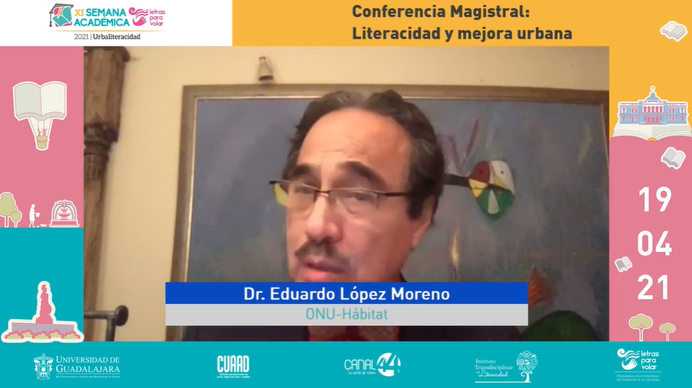 El COVID-19 cambia las reglas del entorno y ahí nos ayudará mucho la literacidad porque entenderemos a la sociedad y espacio en el que vivimos; tendremos que equilibrar lo público y lo privado”, compartió el Director de la Unidad de Conocimiento e Innovación de ONU-Hábitat, con sede en Nairobi, Kenia, doctor Eduardo López Moreno.