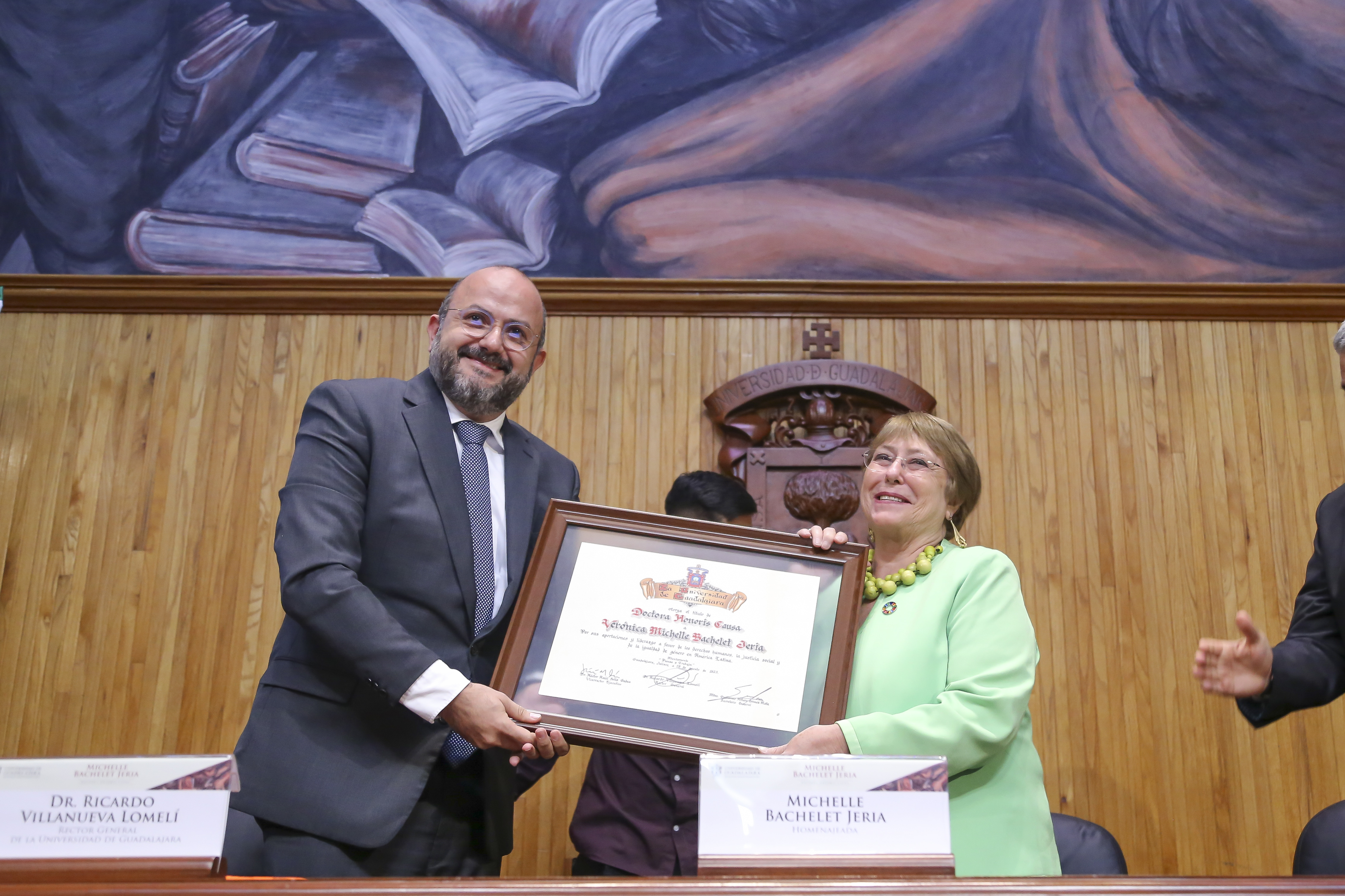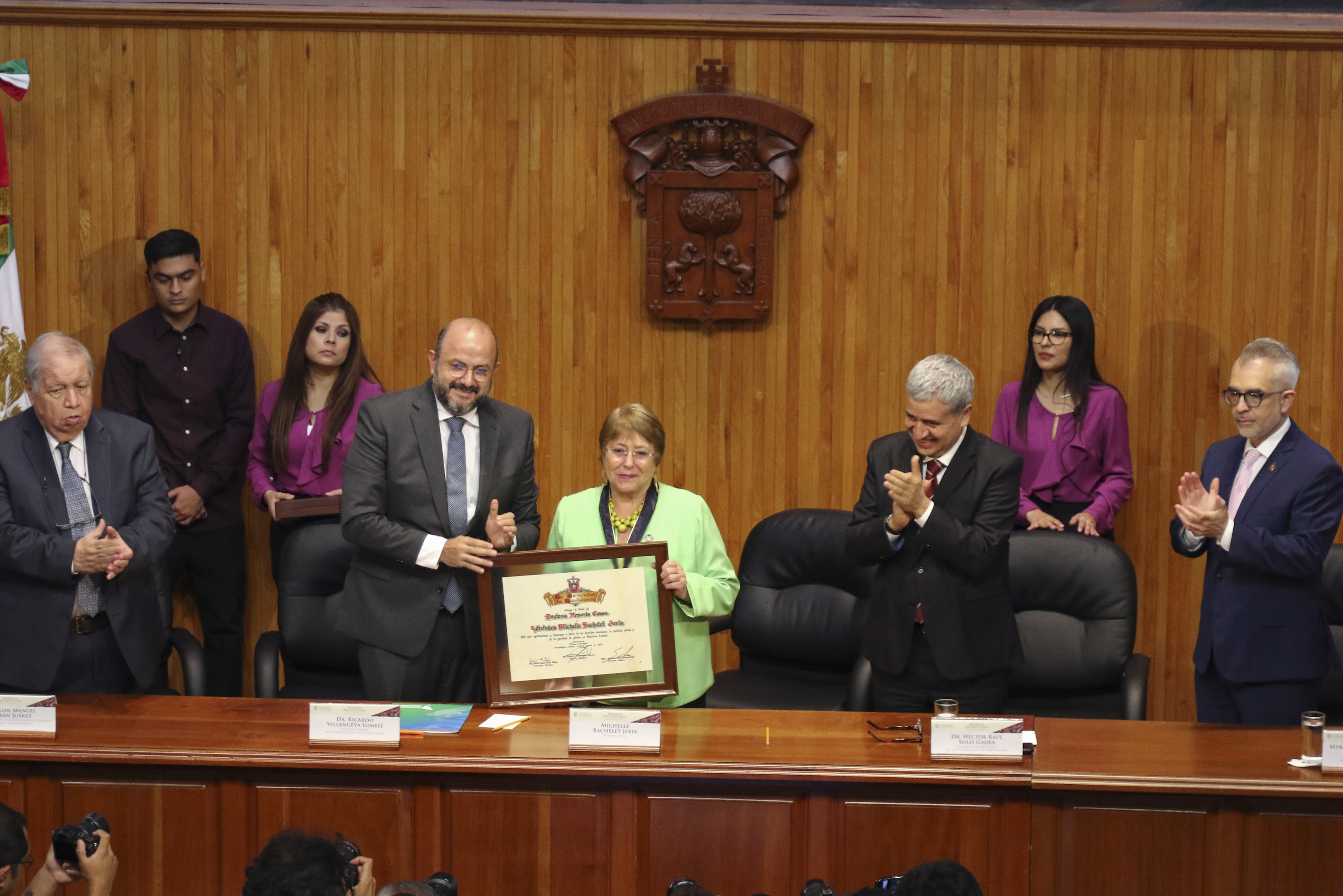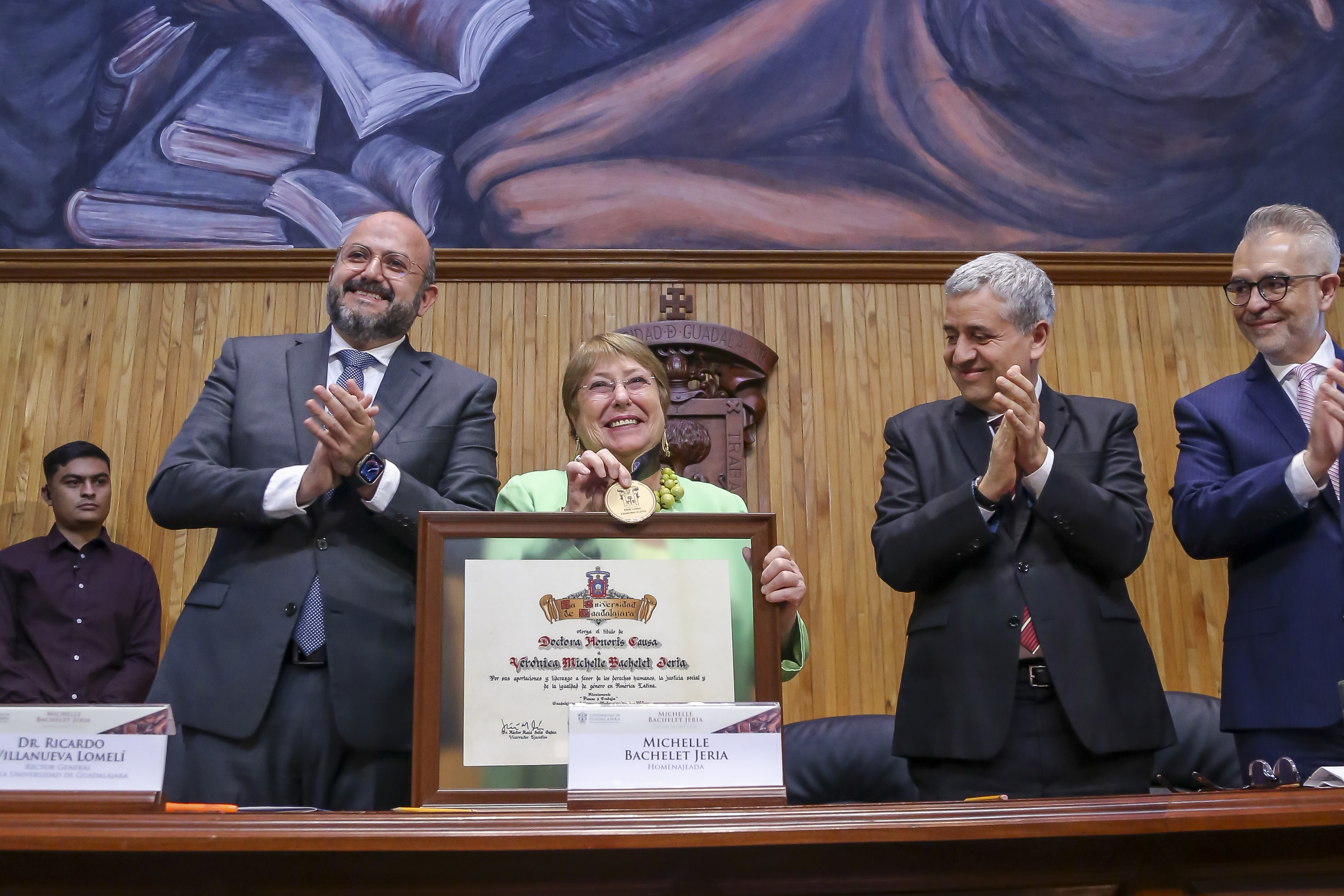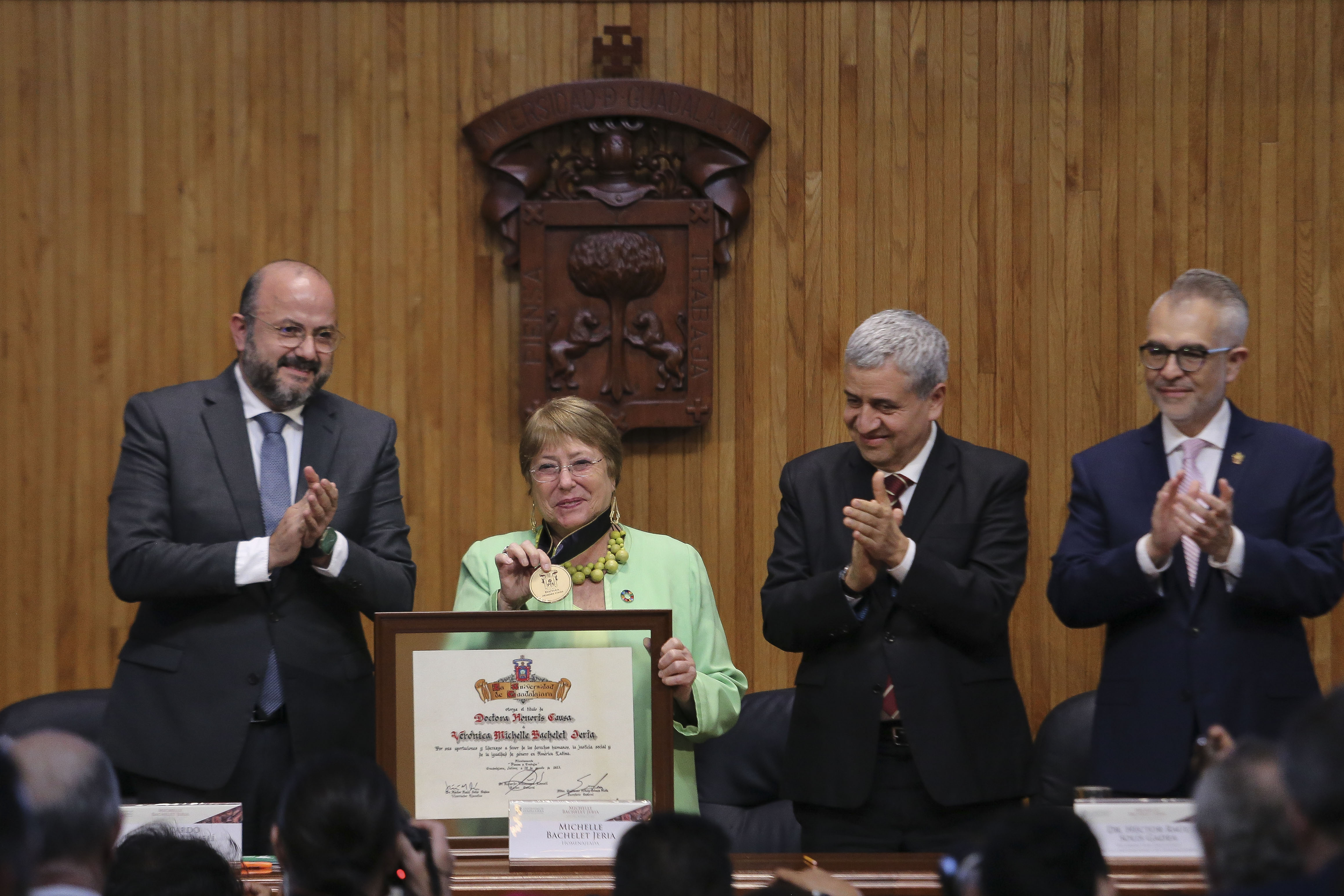 La Expresidenta de Chile, Michelle Bachelet Jeria, recibió el Doctorado Honoris causa de la Universidad de Guadalajara, de manos del Rector General de esta Casa de Estudio, doctor Ricardo Villanueva Lomelí, por “su reconocida trayectoria, aportaciones y liderazgo en favor de los derechos humanos, la justicia social y la igualdad de género en América Latina”.