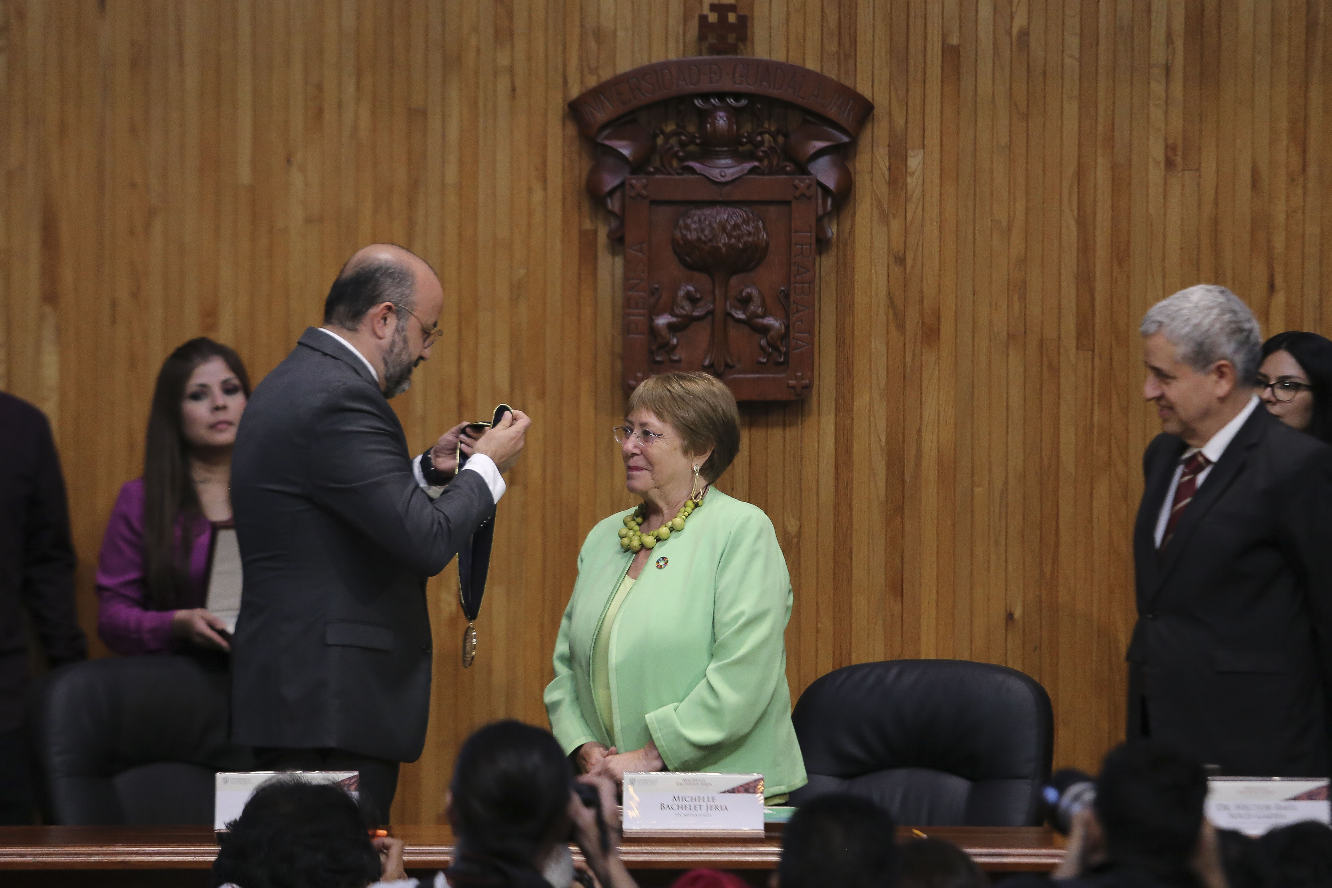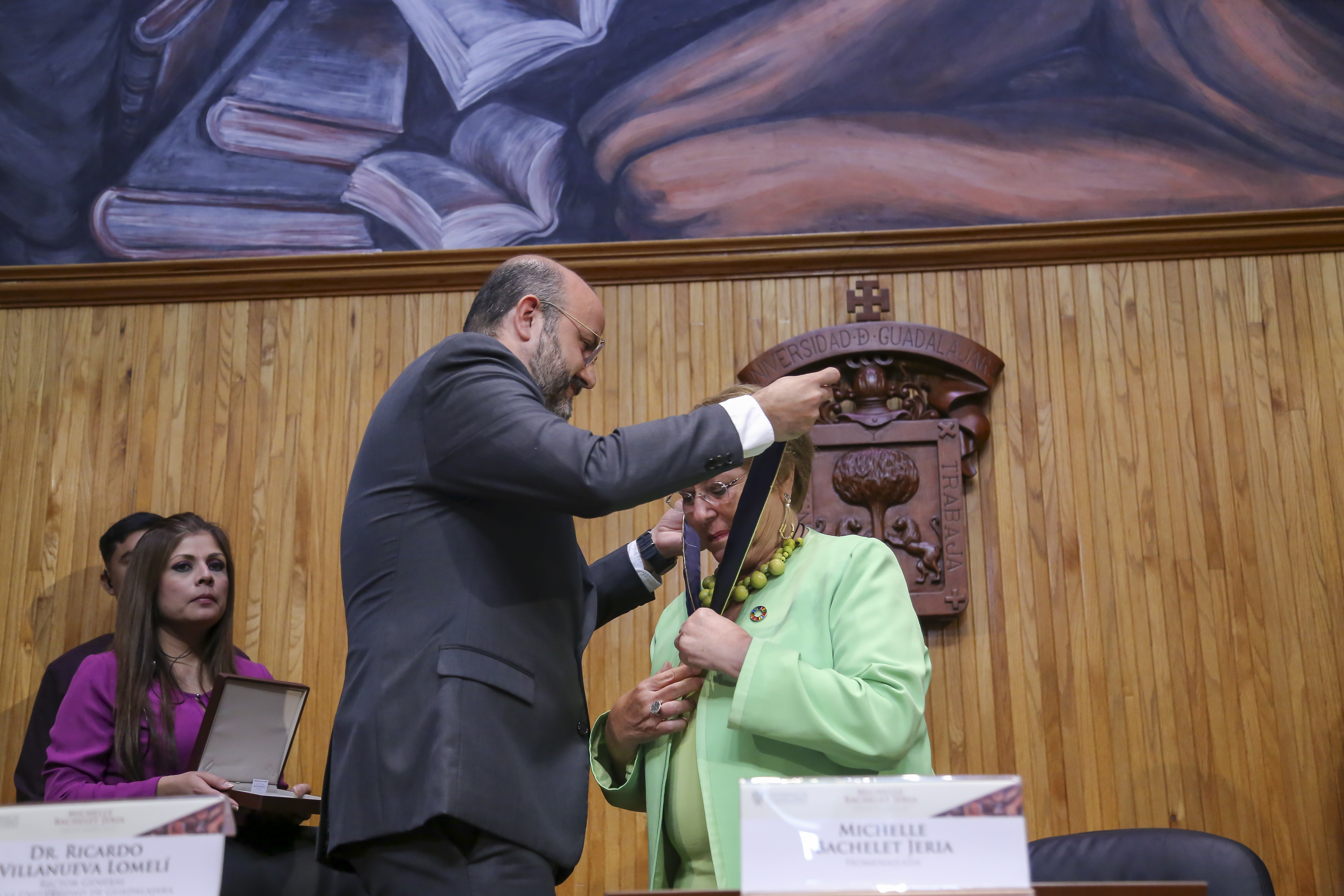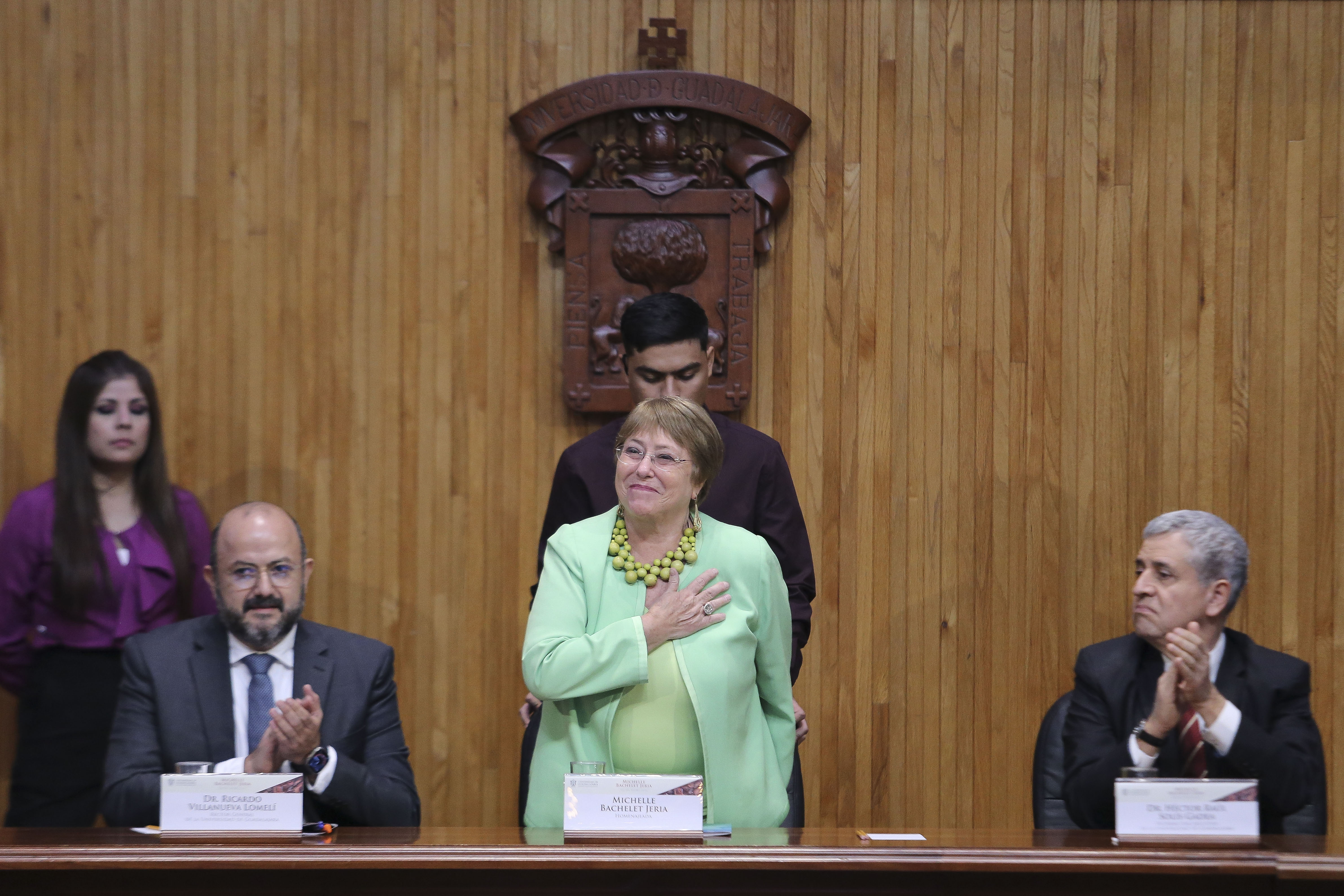 La Expresidenta de Chile, Michelle Bachelet Jeria, recibió el Doctorado Honoris causa de la Universidad de Guadalajara, de manos del Rector General de esta Casa de Estudio, doctor Ricardo Villanueva Lomelí, por “su reconocida trayectoria, aportaciones y liderazgo en favor de los derechos humanos, la justicia social y la igualdad de género en América Latina”.