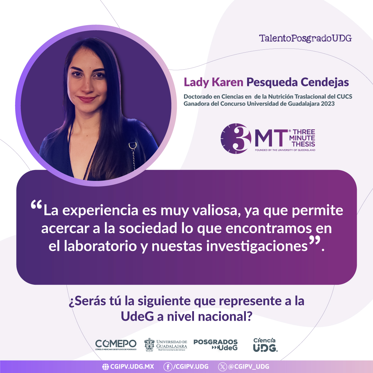 El o la ganadora del concurso institucional, representará a la Universidad de Guadalajara, en el Concurso Nacional 3MT 2024 organizado por COMEPO, el cual será realizado el 27 de septiembre de 2024 en el marco del 37° Congreso Nacional del Posgrado, como fue el caso de Lady Karen Pesqueda Cendejas, ganadora en la edición 2023.